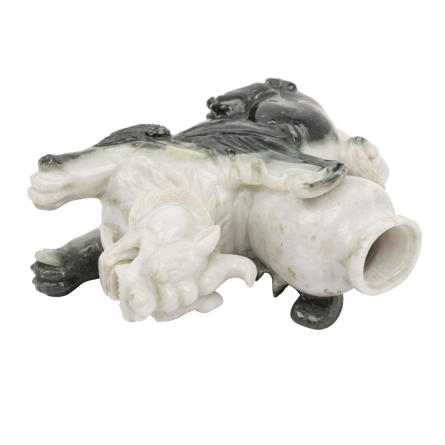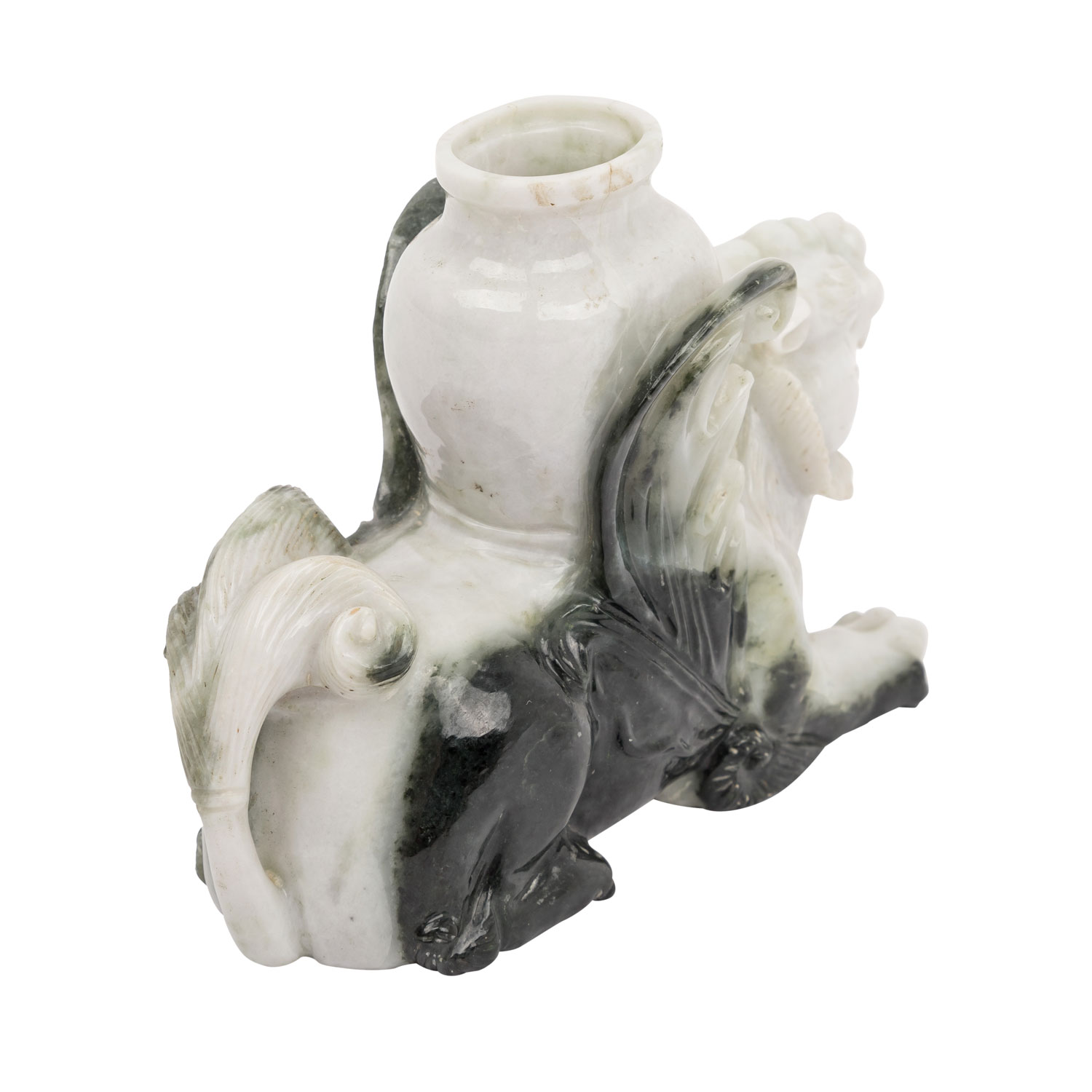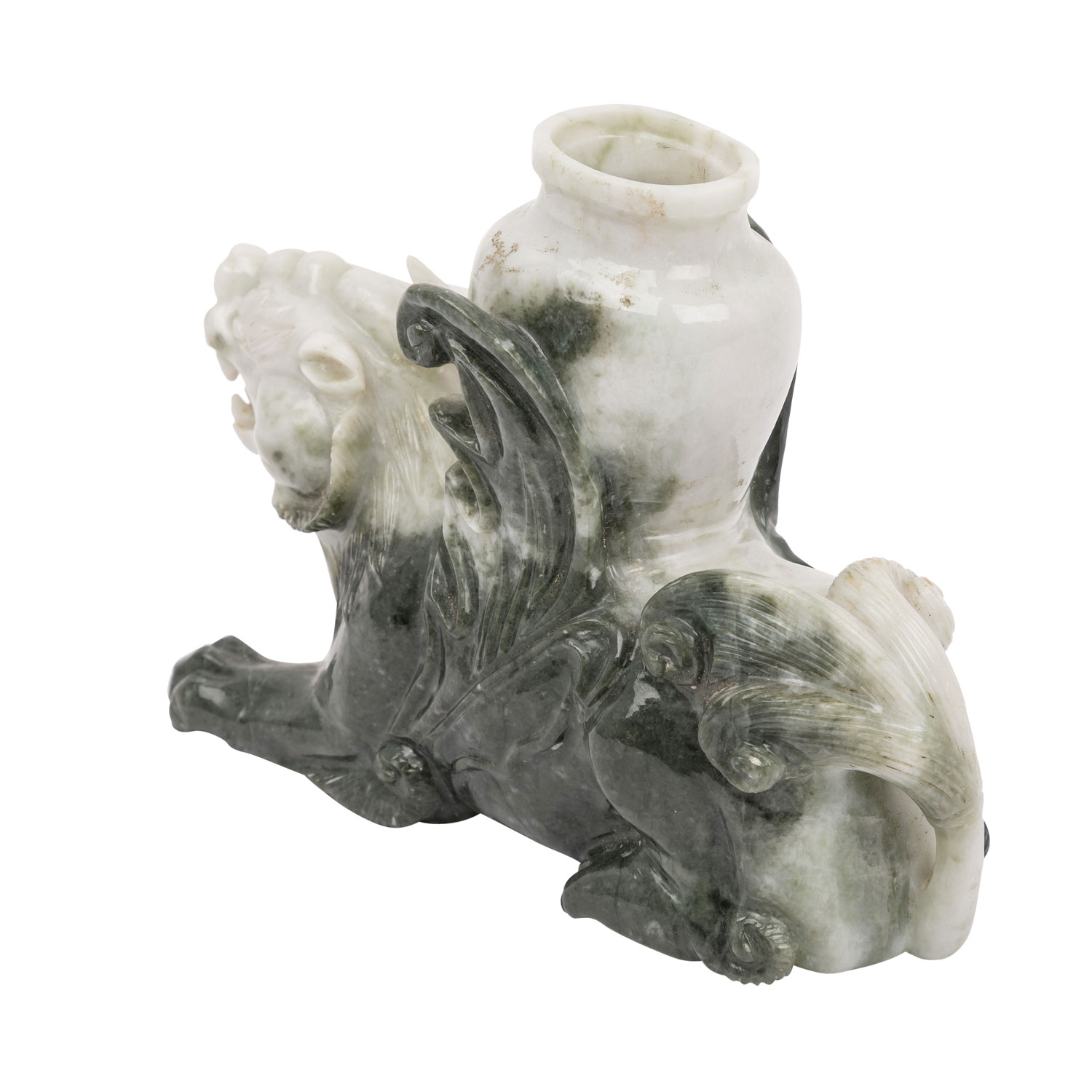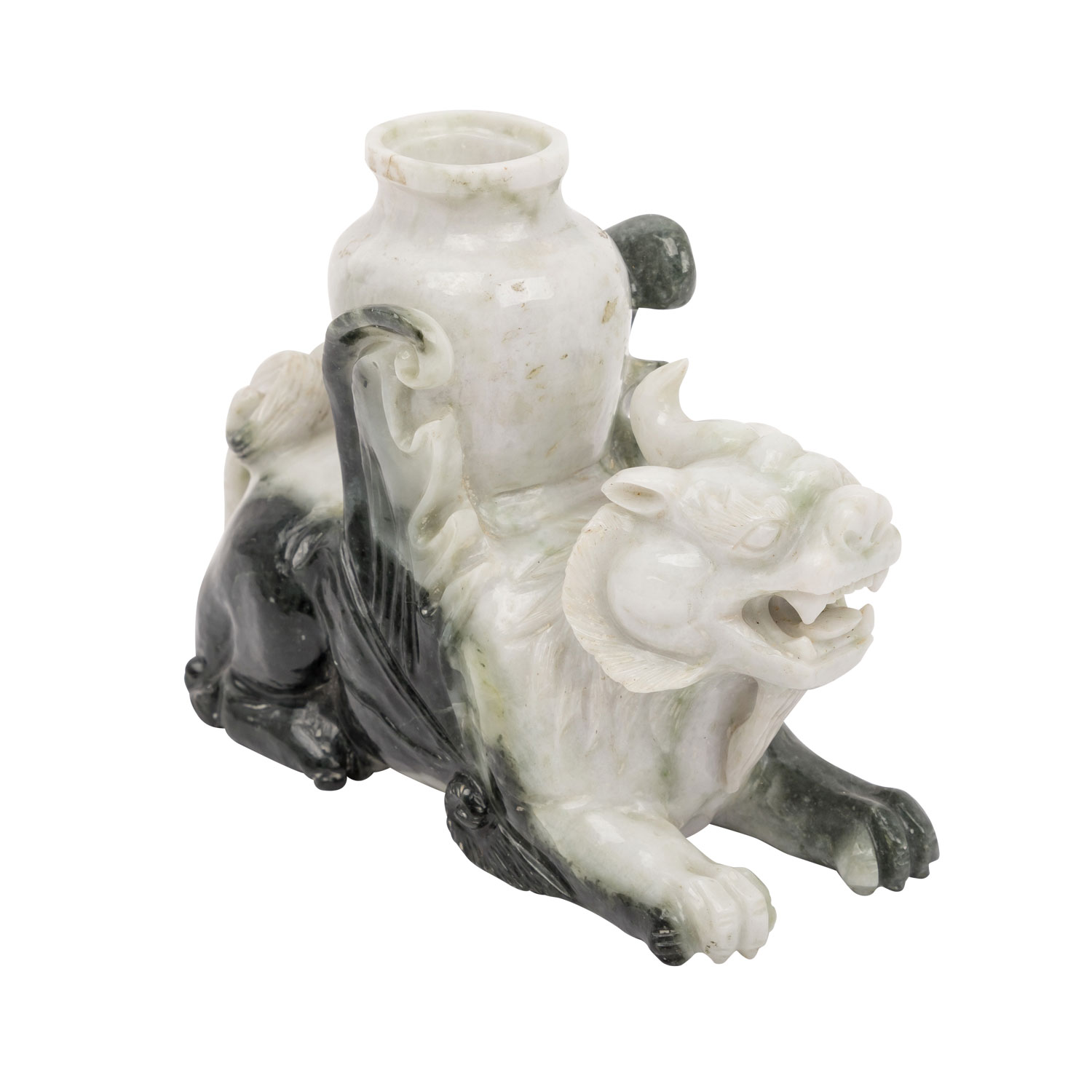 1 Wächterlöwe als Väschen aus Moosachat, H: 10 cm und 1 Pinselwaschgefäß aus Speckstein, H: 9 cm, besch.