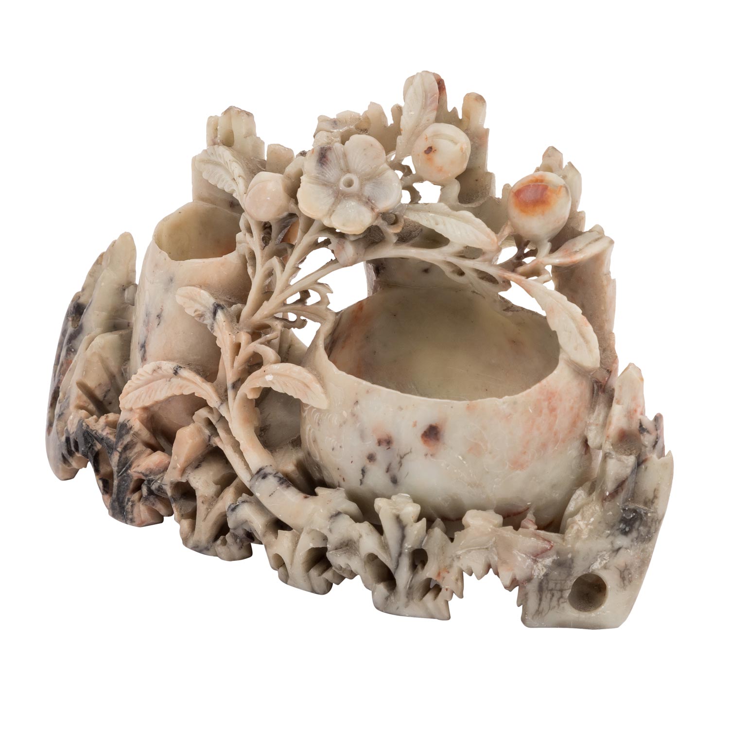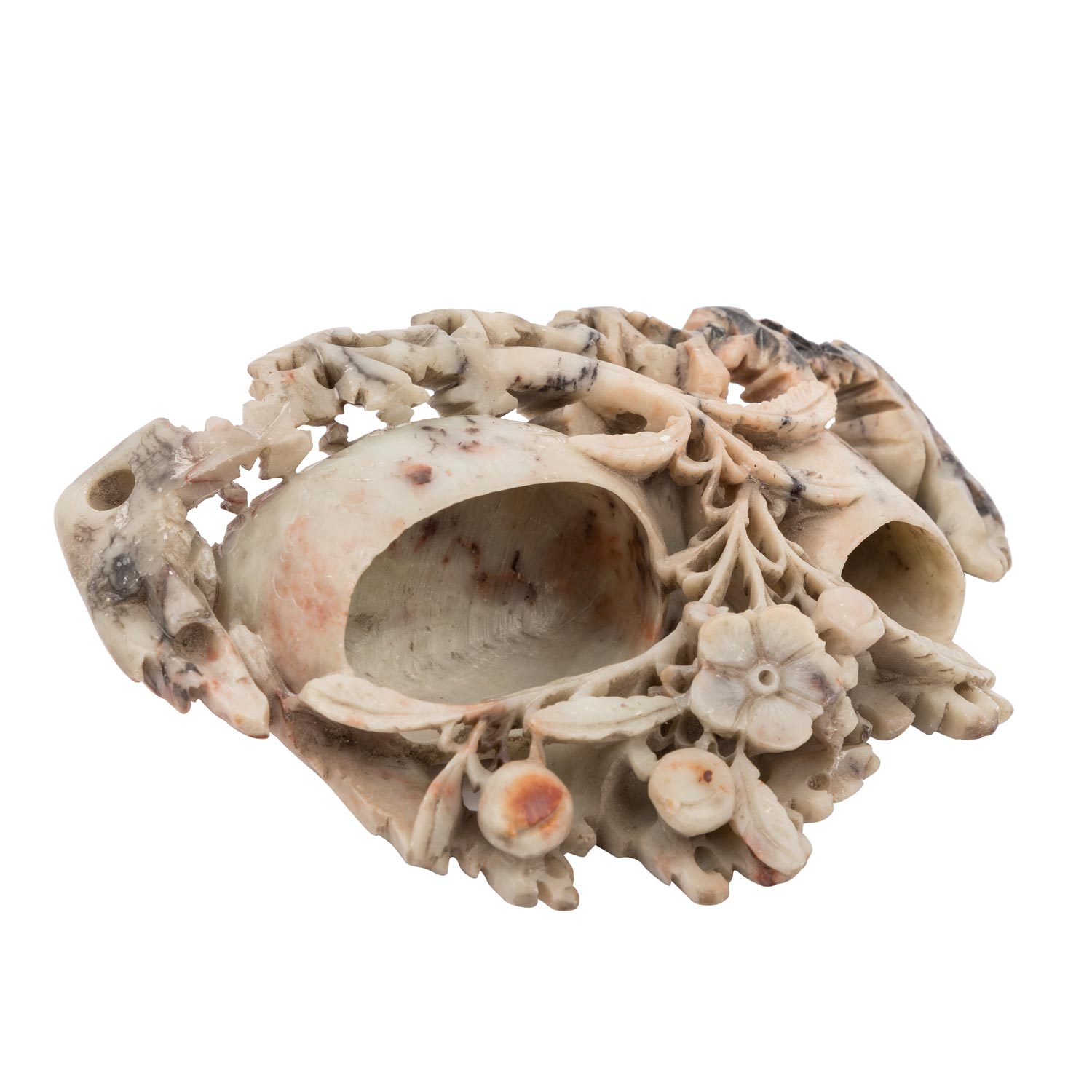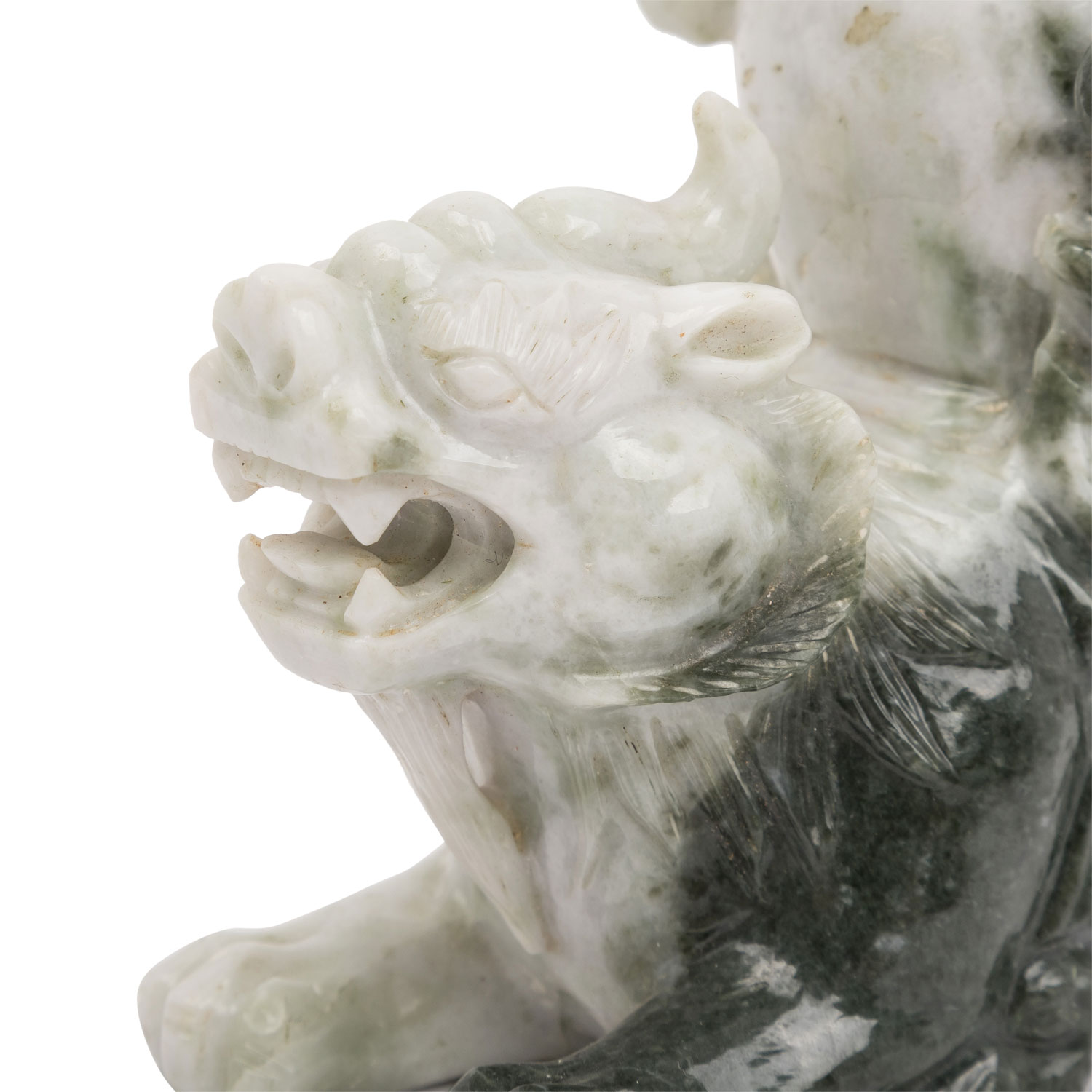 1 Wächterlöwe als Väschen aus Moosachat, H: 10 cm und 1 Pinselwaschgefäß aus Speckstein, H: 9 cm, besch.