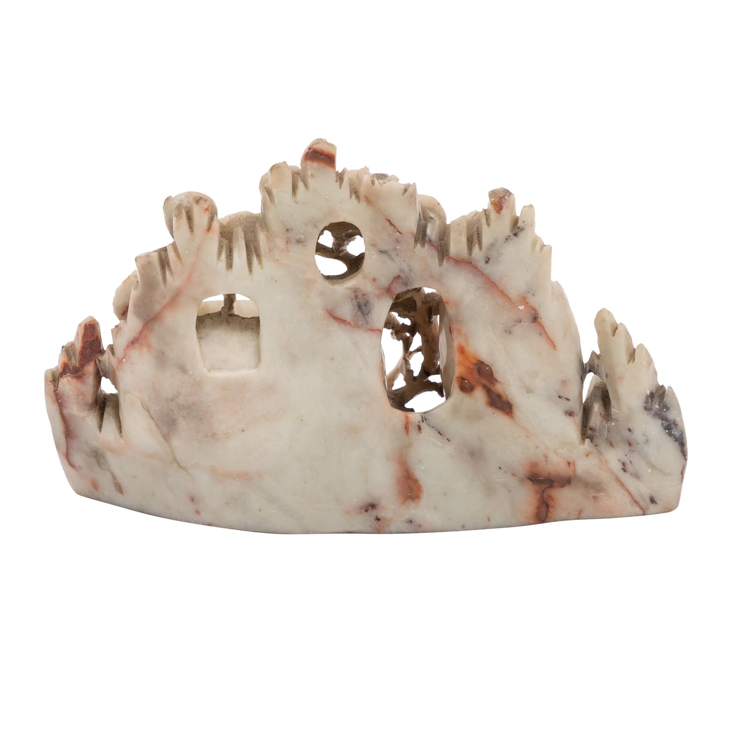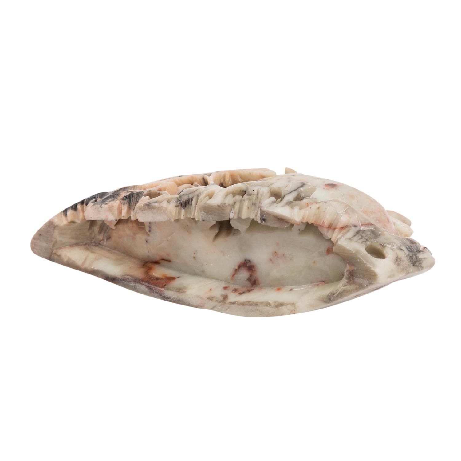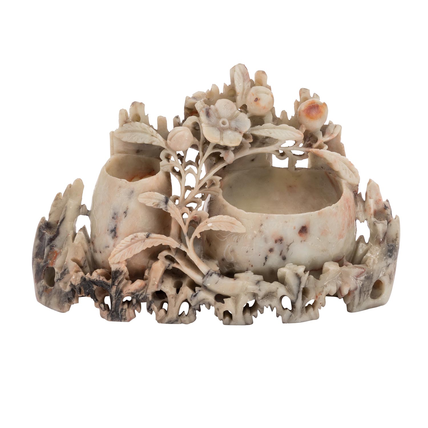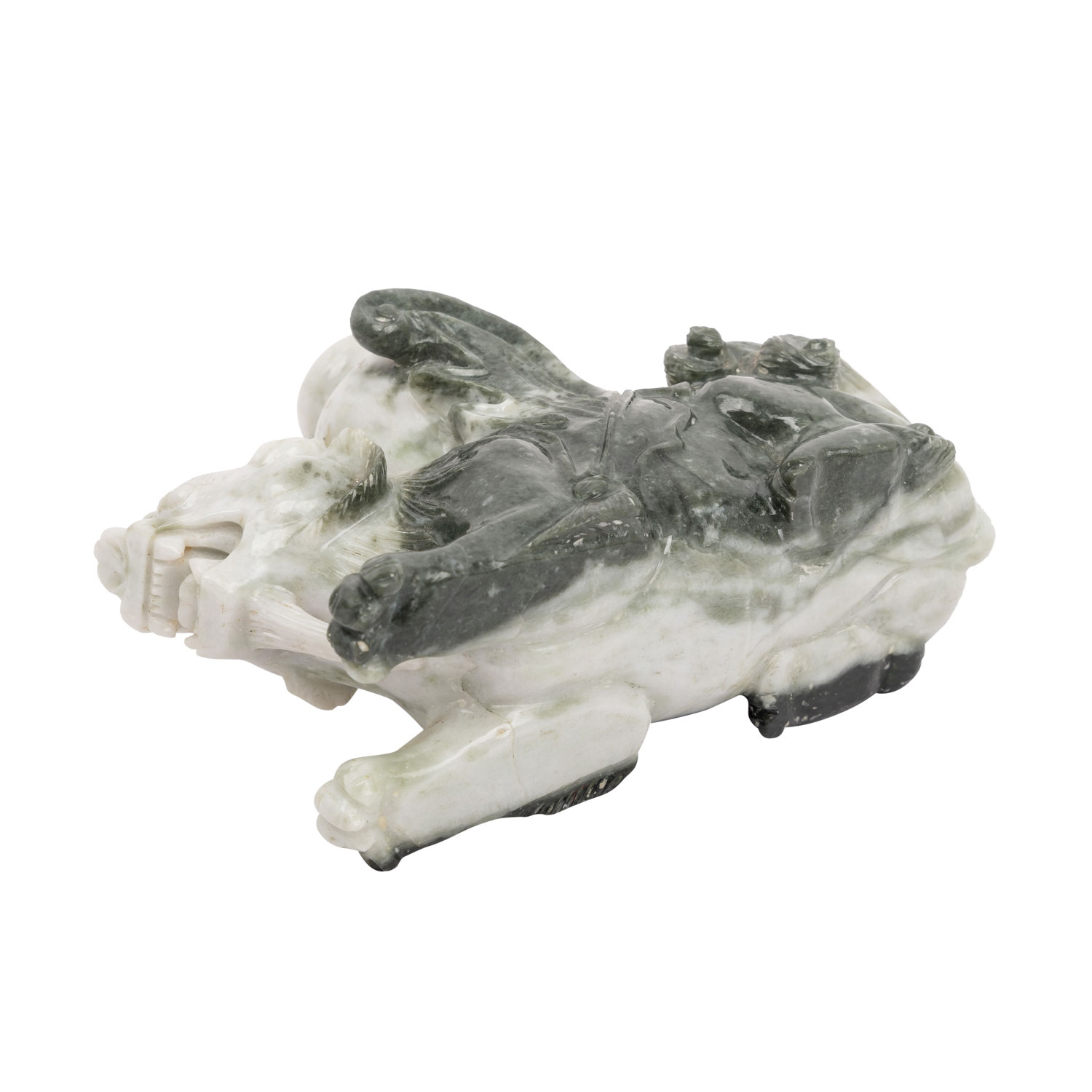 1 Wächterlöwe als Väschen aus Moosachat, H: 10 cm und 1 Pinselwaschgefäß aus Speckstein, H: 9 cm, besch.