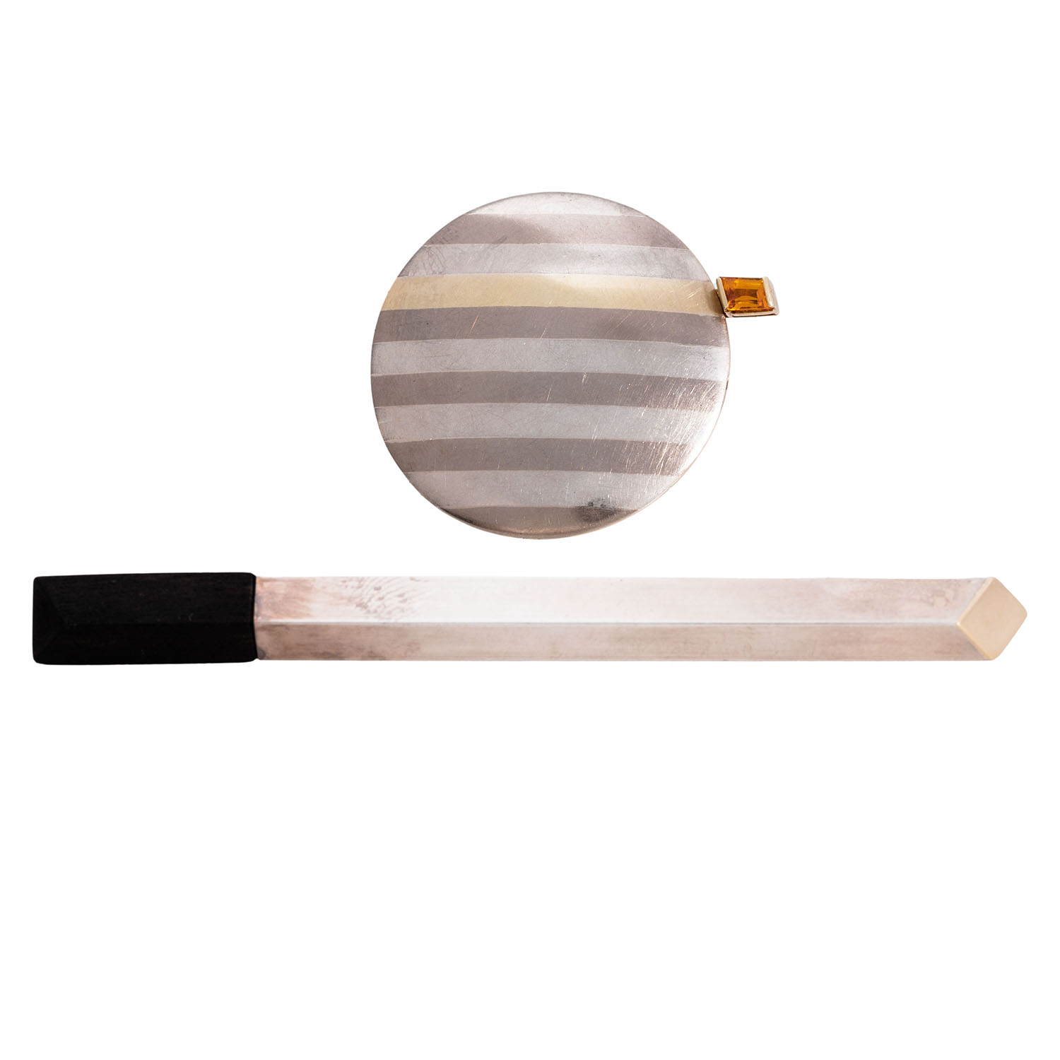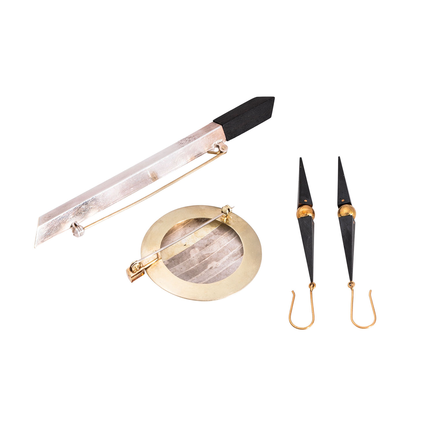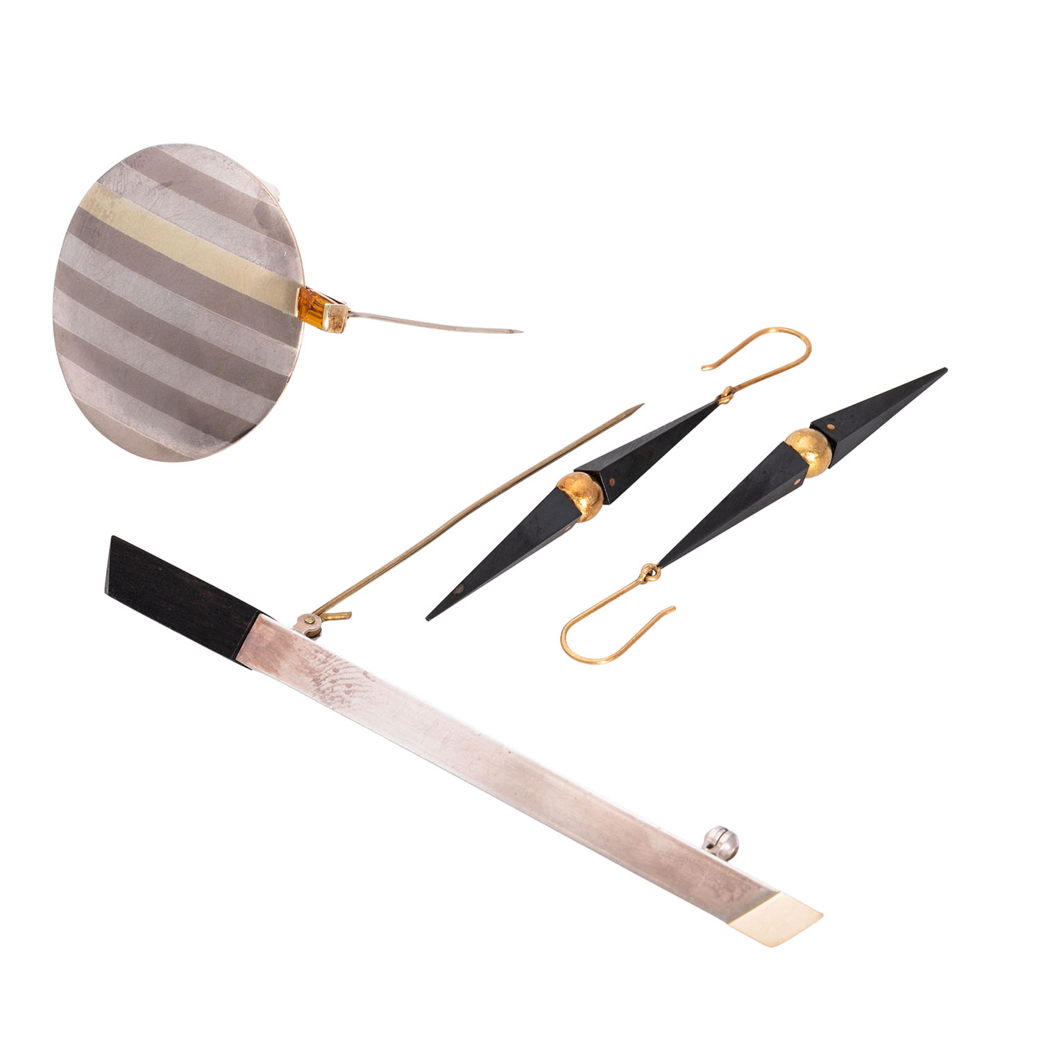bestehend aus Ohrhängern, GG 18K mit brüniertem Eisen, 7,7 g, L: 7,3 cm, 1 Kreisbrosche D: 4,2 cm aus Streifenblech, Silber, Palladium, GG 14K, mit Farbstein, 12,8 g und 1 Stabbrosche aus Silber mit kleiner Goldauflage und Ebenholz, 8,2 g, L: 10,5 cm, 6x6 mm, um 1990, Tragespuren, tlw. deutlich.