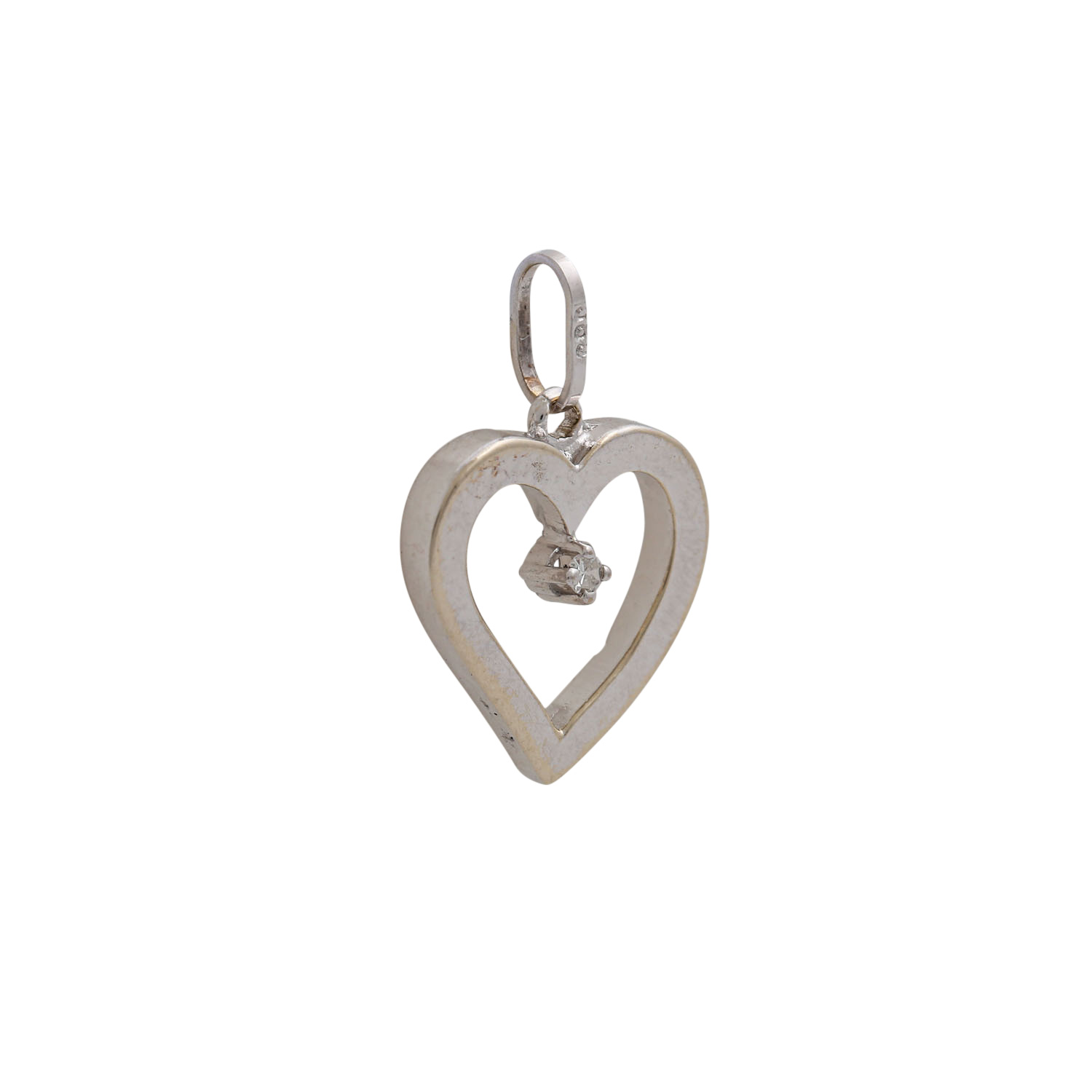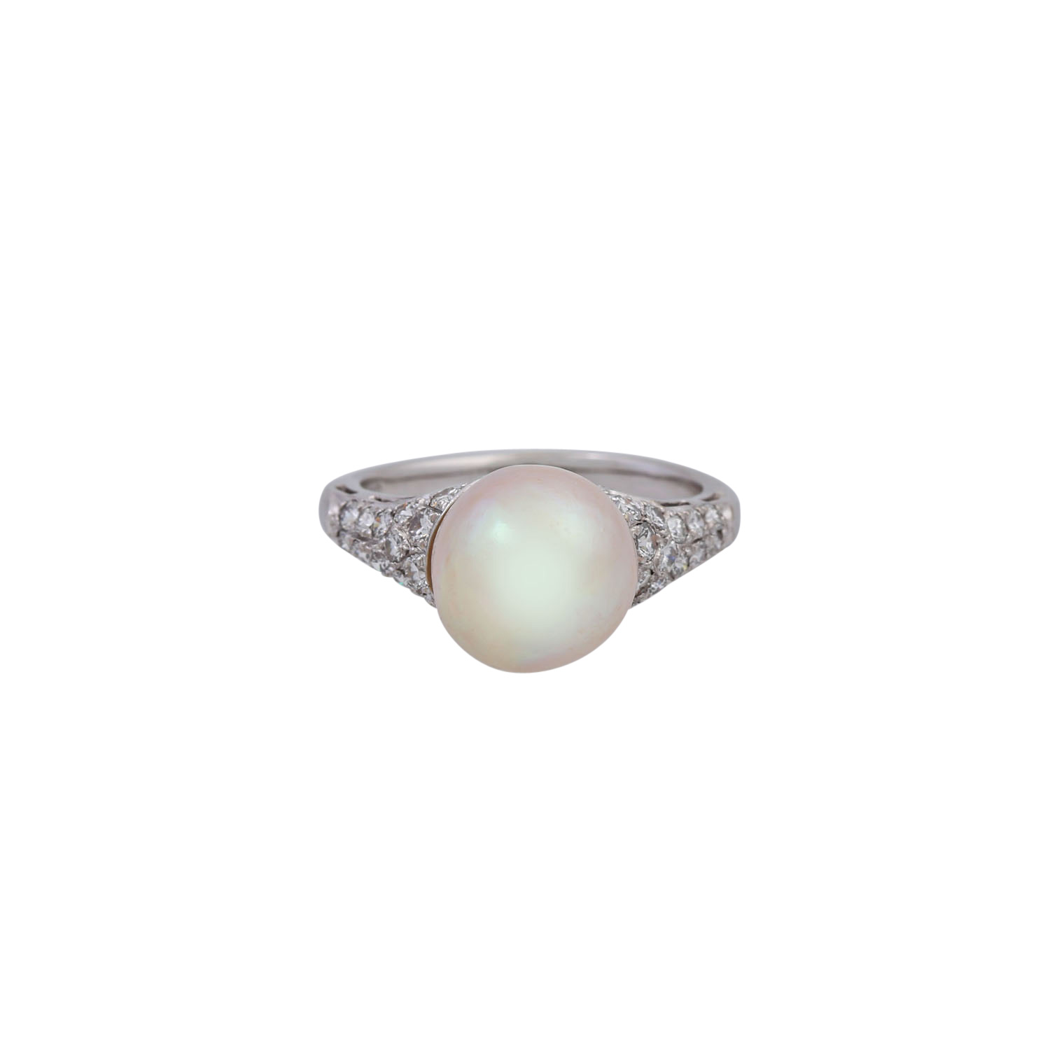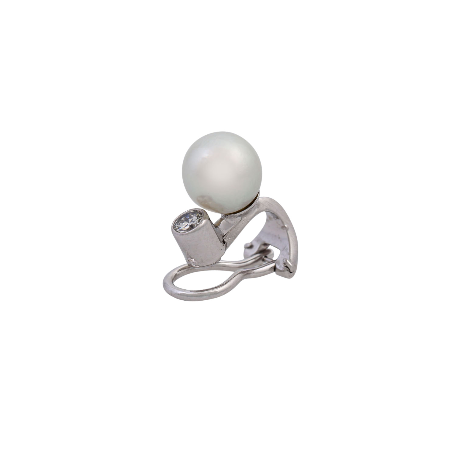 alle zus. ca. 0,5 ct, ca. WEISS-GW (H-L)/VS-SI, bestehend aus Herzanhänger und einzelnem Ohrclip mit Akoya Zuchtperle 8 mm, beides WG 14K, zus. 4,3 g und Ring mit Zuchtperle 10 mm aus WG 18K, 4,5 g, RW: 51, 2. H. 20. Jh., tlw. mit Tragespuren. (31)