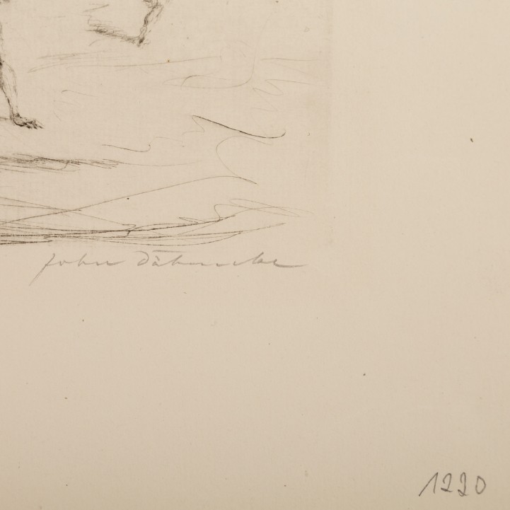 Konvolut 3 Zeichnungen und Grafiken: DÄHMCKE, STEINBECK, WENCK, 1920er/30er Jahre, 1x JOHN DÄHMCKE (1887-1969), ""Überfall"", Radierung/Bütten (Wasserzeichen am Rand: Johann Wilhelm), u.re. mit Bleistift von Hand signiert, u.li. mit Bleistift num. 49-50, am unteren Rand bezeichnet, HxB: Platte ca. 12,5x19 cm, Blatt ca. 23x31 cm; 1x ALBERT STEINBECK (1897-?), ""Weiblicher Akt"", Aquarell über Bleistift/grautoniges Papier (linker Rand perforiert), u.li. signiert und datiert 1936, HxB: ca. 34,5x24,5 cm; 1x ERNST WENCK (1865-1929), Bewegungsstudie ""Weiblicher Akt"", Tusche/Pergamentpapier (rechter Rand perforiert, linksseitig tlw. montiert), u.re. signiert, HxB: ca. 45x36,5 cm. Je leicht gebräunt, Knicke, part. Flecken, Einrisse am Rand.