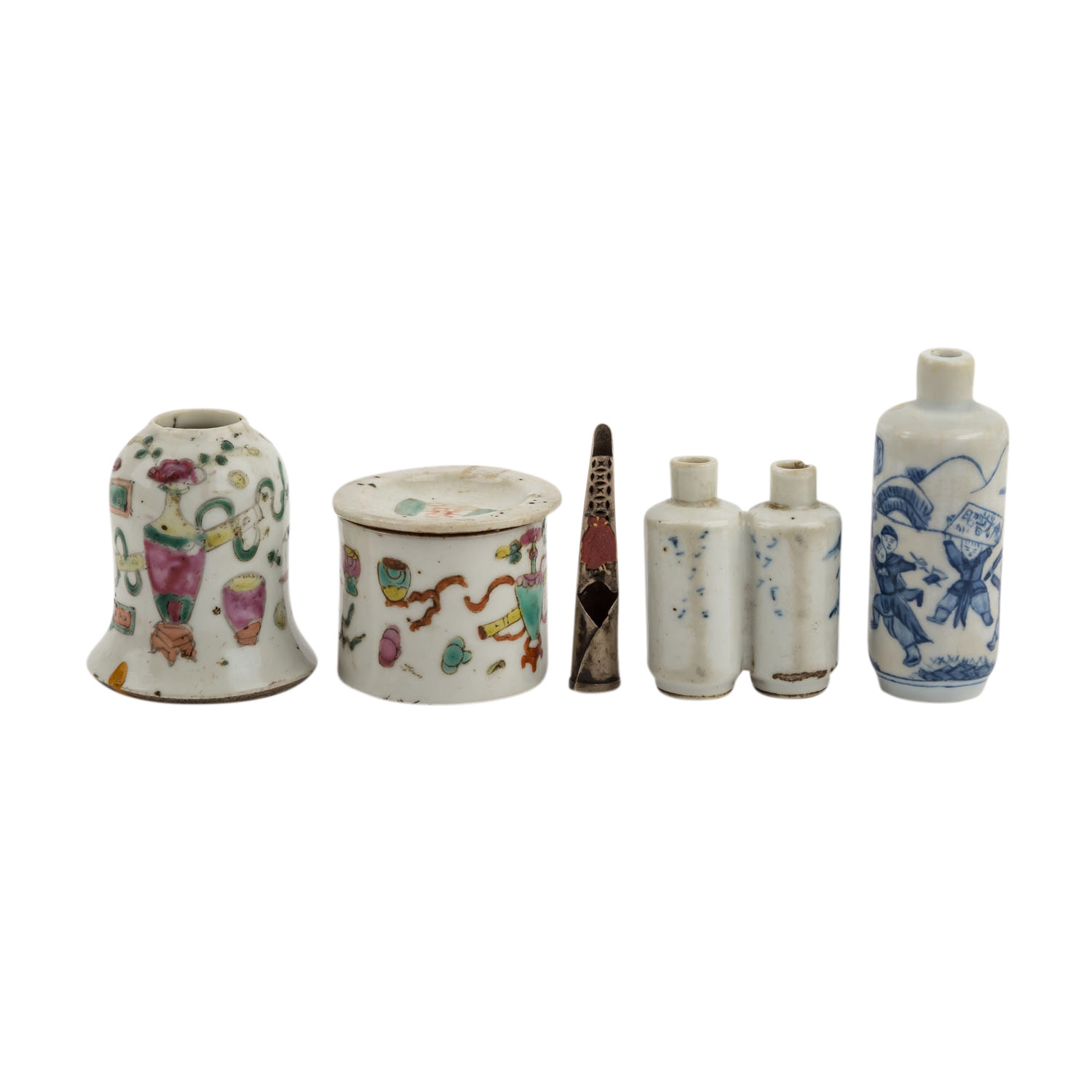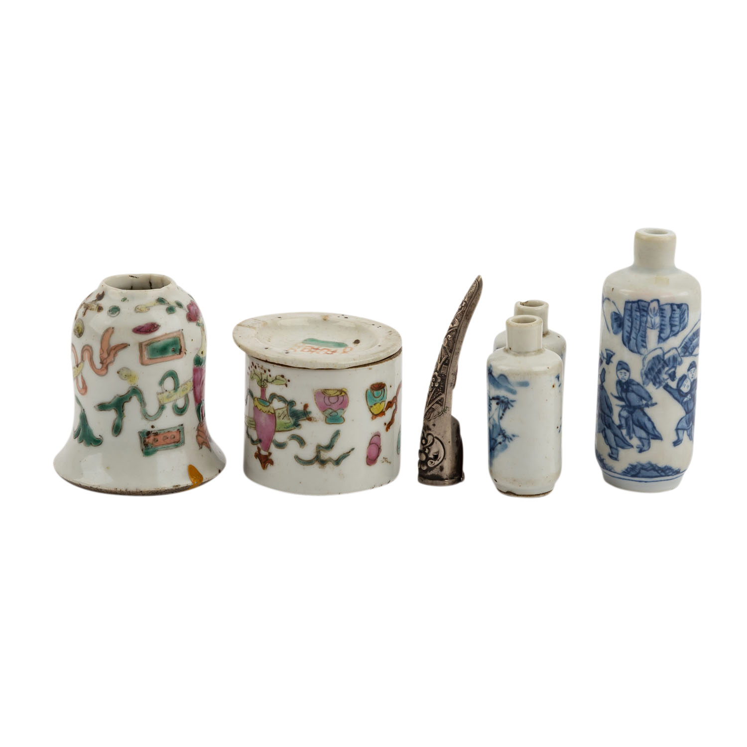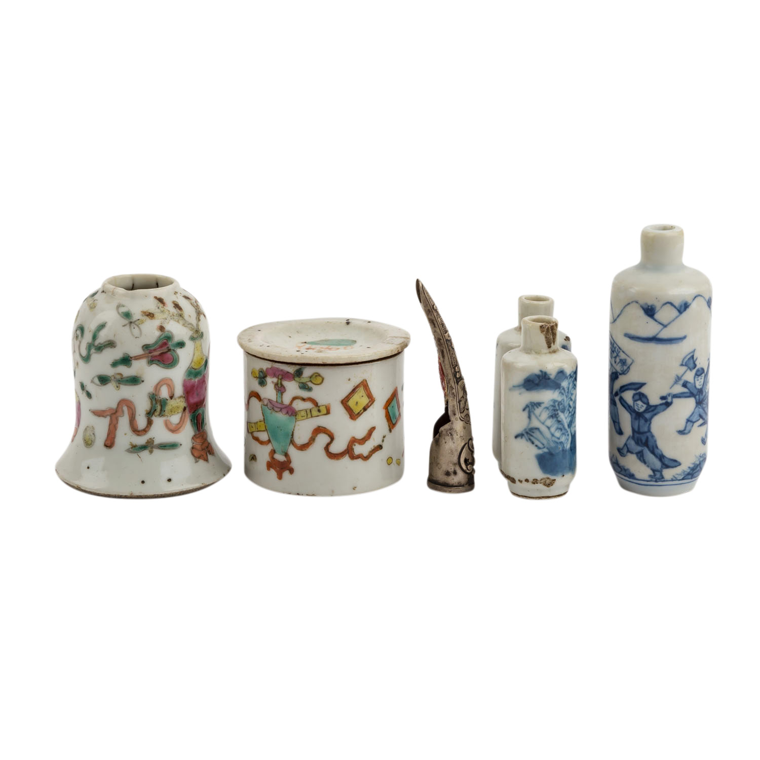 Konvolut: 5-tlg., CHINA, um 1900 und älter. 1 Deckeldöschen, H 4,5 cm und 1 glockenförmiges Väschen, H 6,5 cm, jeweils aus Porzellan, bunt bemalt mit buddhistischen Emblemen/2 blau-weisse Fläschchen bzw. Snuffbottles aus Porzellan, ohne Deckel, H 6-8 cm/1 Kralle aus Metall mit Gravurdekor, zum Aufstecken auf den kleinen Finger, L ca. 6,5 cm.