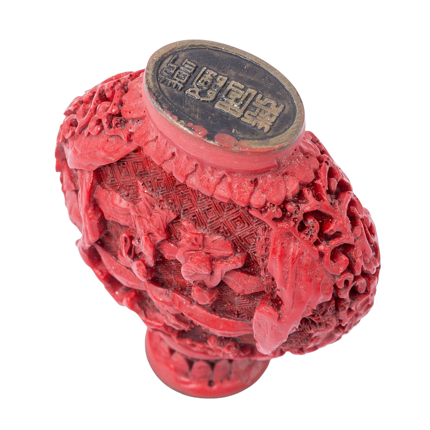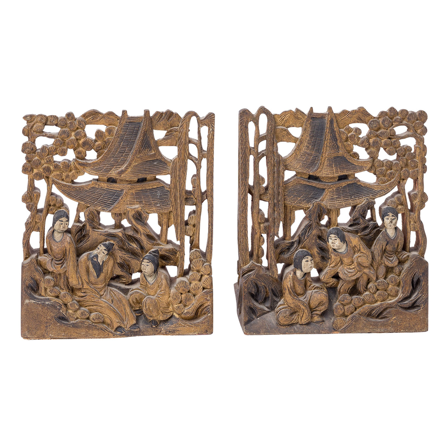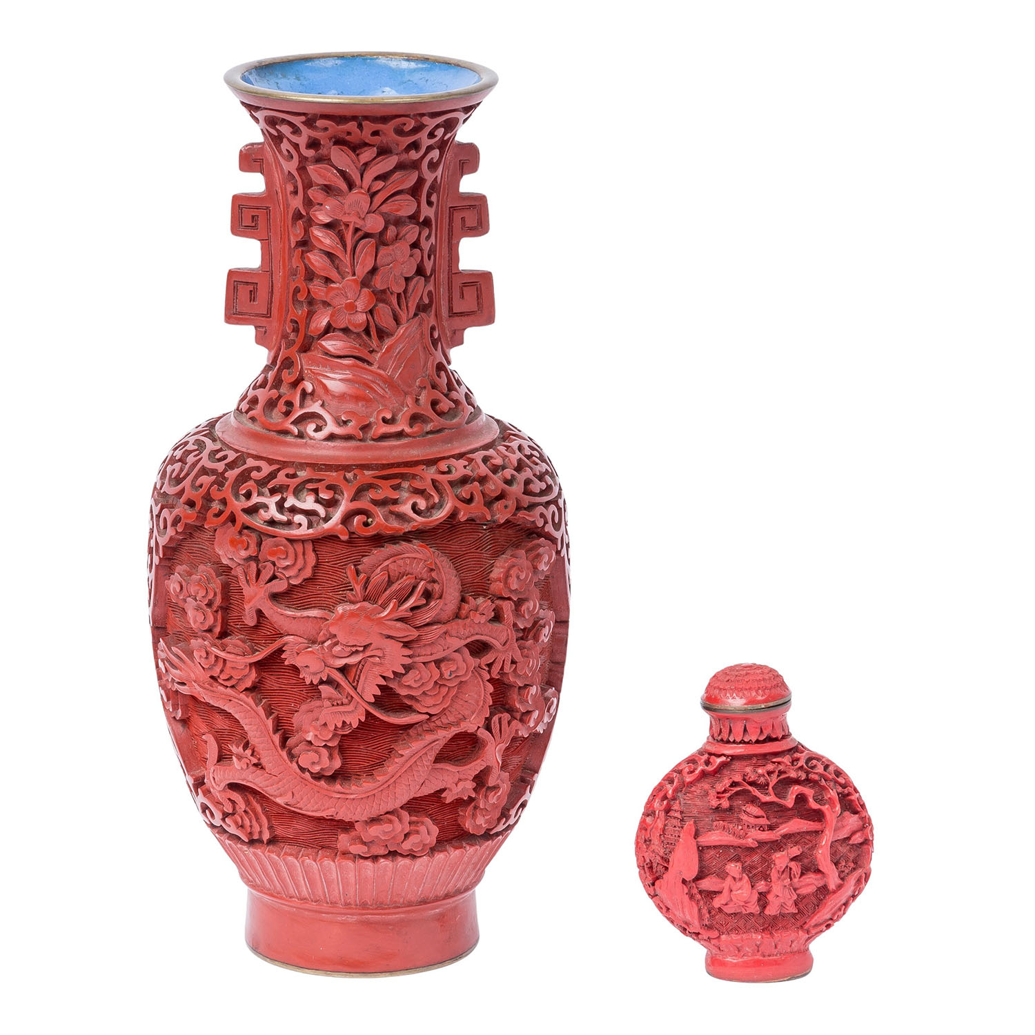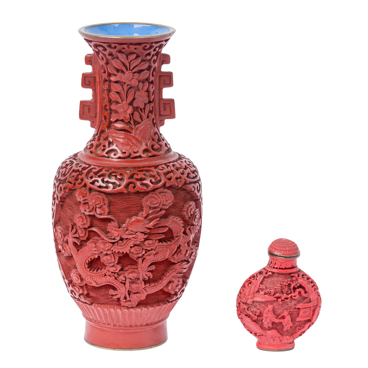 1.) 3 Teller aus Porzellan, D: 22,5 cm. 2.) Rotlack-Vase, H: 18 cm. 3.) Rotlack-Snuffbottle, H: 6,5 cm. 4.) Paar beschnitzte Buchstützen, H: 16 cm. Tlw. mit Alters- und Gebrauchsspuren.