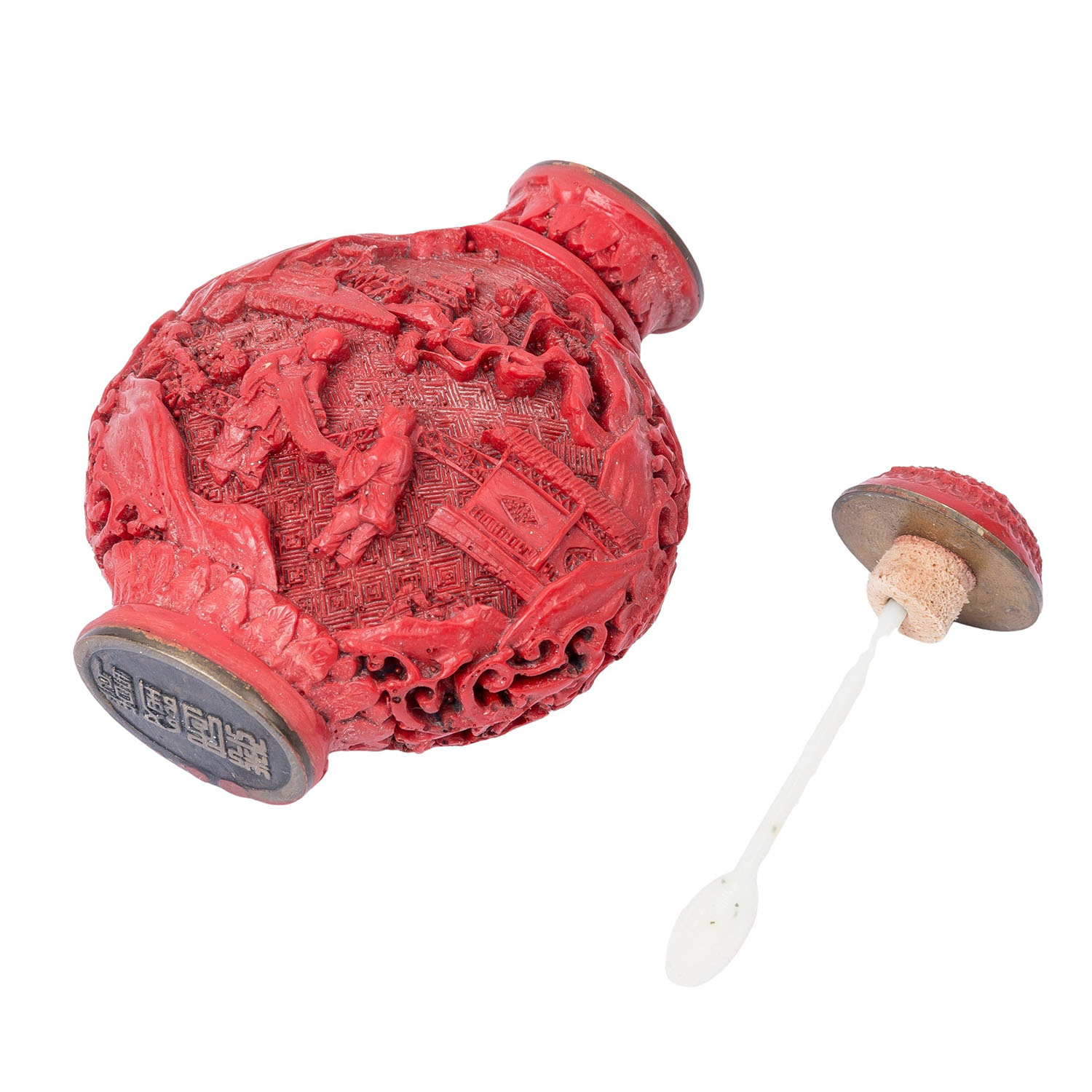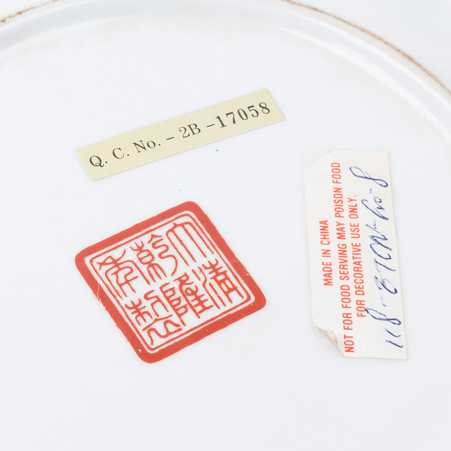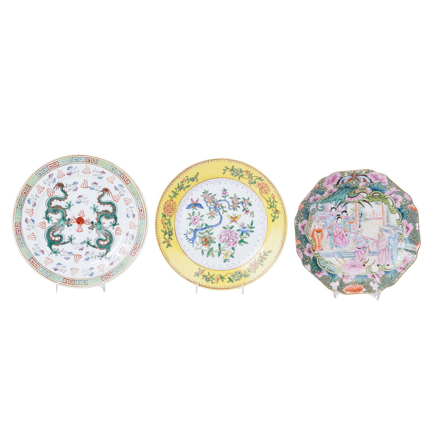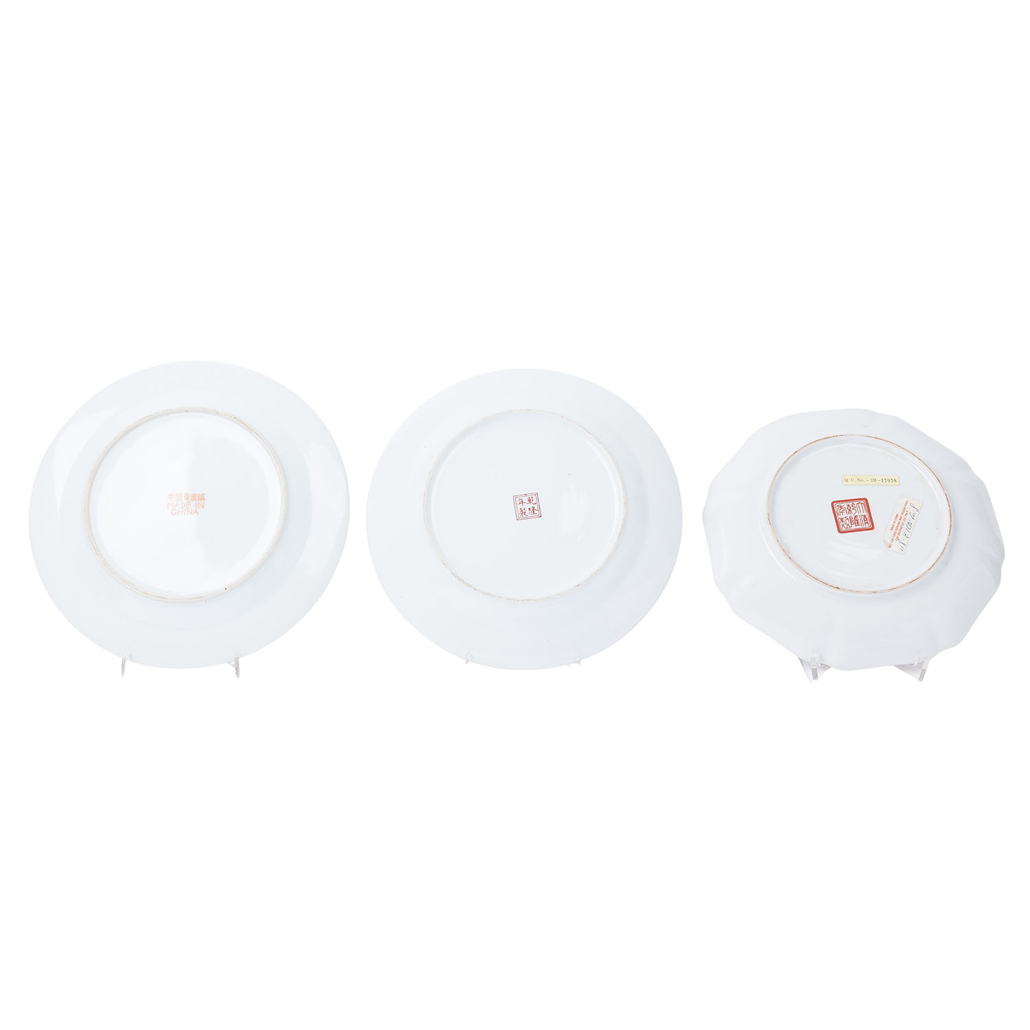 1.) 3 Teller aus Porzellan, D: 22,5 cm. 2.) Rotlack-Vase, H: 18 cm. 3.) Rotlack-Snuffbottle, H: 6,5 cm. 4.) Paar beschnitzte Buchstützen, H: 16 cm. Tlw. mit Alters- und Gebrauchsspuren.