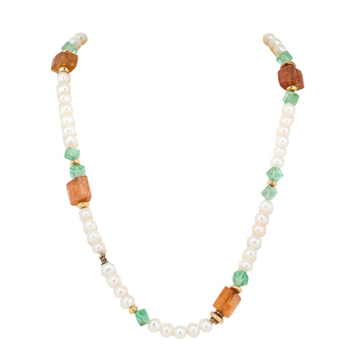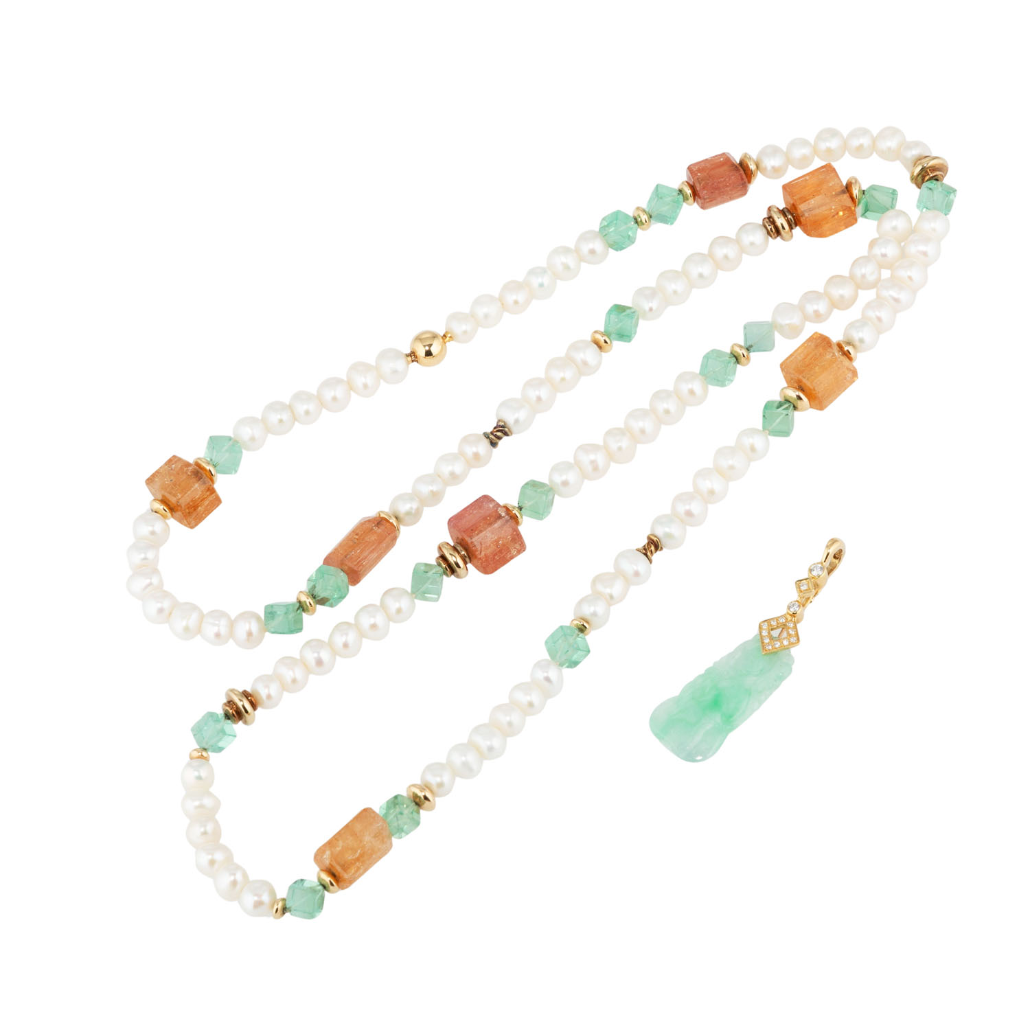 Kette aus Süßwasser Zuchtperlen kombiniert mit 7 Imperialtopaskristallen poliert, 17 Fluoritwürfeln und Goldzwischenteilen sowie Bajonettwechselschließe aus verschiedenen Legierungen 14/18/19,2K, L: 90 cm, dazu Clip-Anhänger aus GG 18K mit gravierter Jade und Brillanten, 20./21. Jh., guter Erhalt.