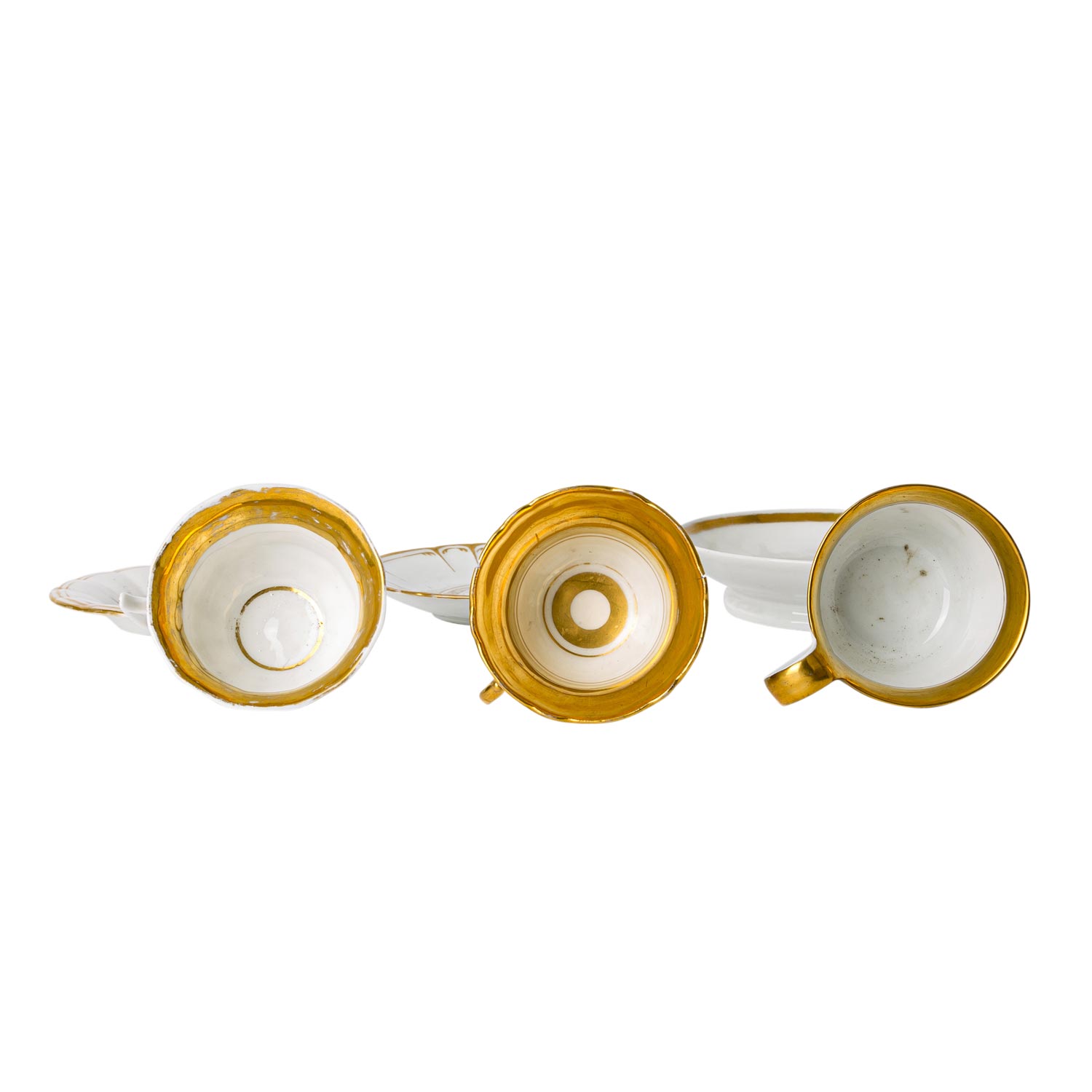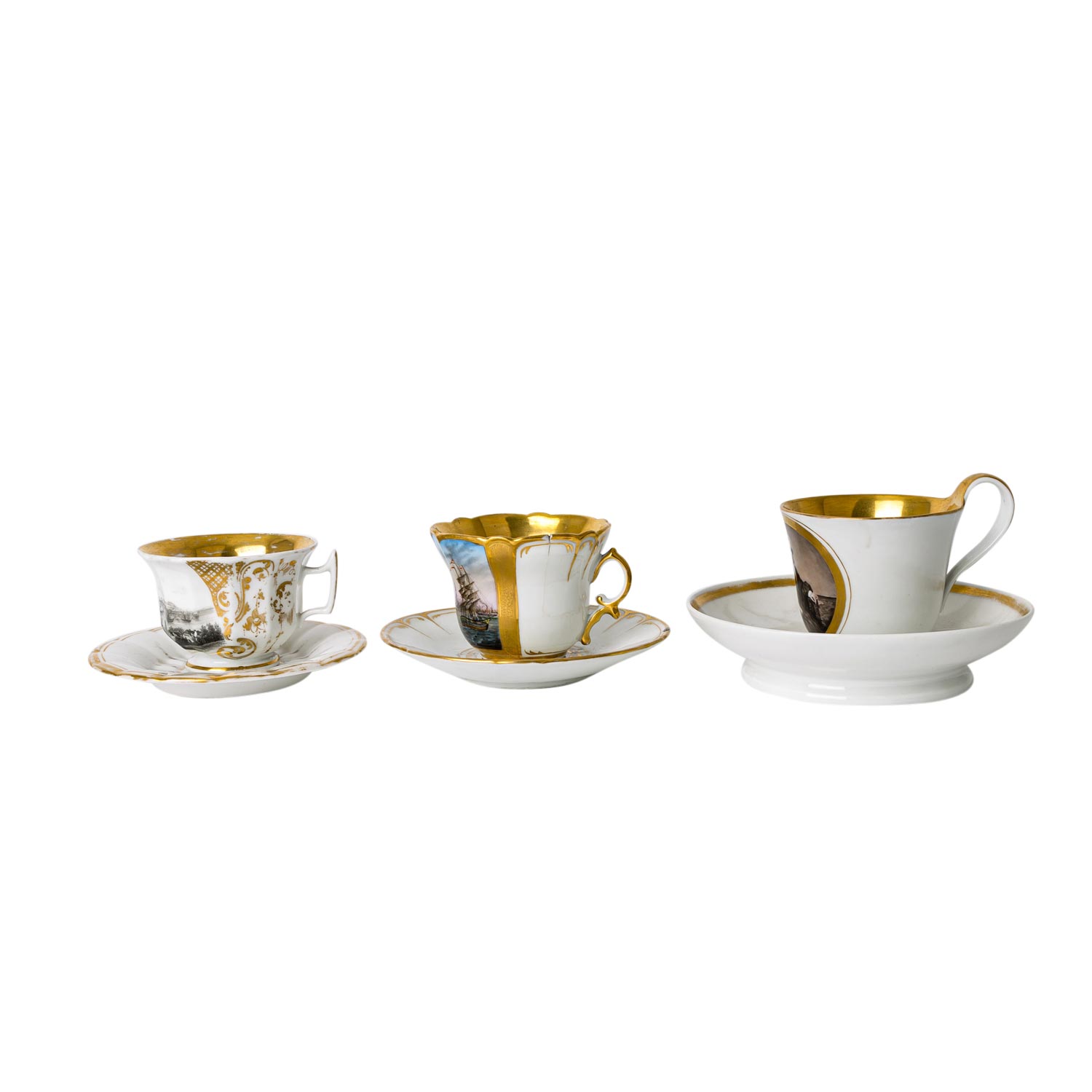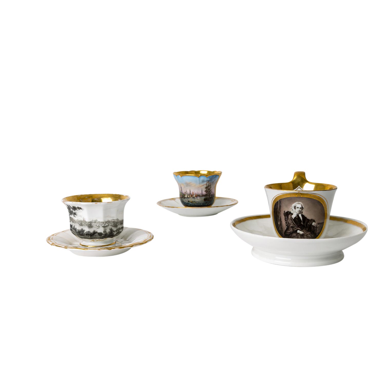 Konvolut von drei Tassen mit Untertassen, 19. Jh., bestehend aus Porträttasse/UT: staffiertes schwarz-weiß Porträt einer älteren Dame, wohl aus hanseatischem Bürgertum des 19. Jhs., runde Umrahmung sowie innerer Lippenrand und Henkel mit Vergoldung, ungemarkt bzw. Marke nicht lesbar, H der Tasse: ca. 9 cm (mit Henkel), Vergoldung berieben; Ansichtentasse "Kiel" mit schauseitiger schwarz-weiß Malerei der Kieler Bucht, polygonale Tassenform und übergroße Untertasse, D 17 cm, ungemarkt, Vergoldung stark berieben, dazu Ansichtentasse "Hamburg": schauseitige, polychrome Lupenmalerei und Bez. "Hamburg's Hafen", Vergoldung innen, besch. (Chip am Lippenrand), berieben (hauptsächlich UT), D Tasse 9,5 cm.