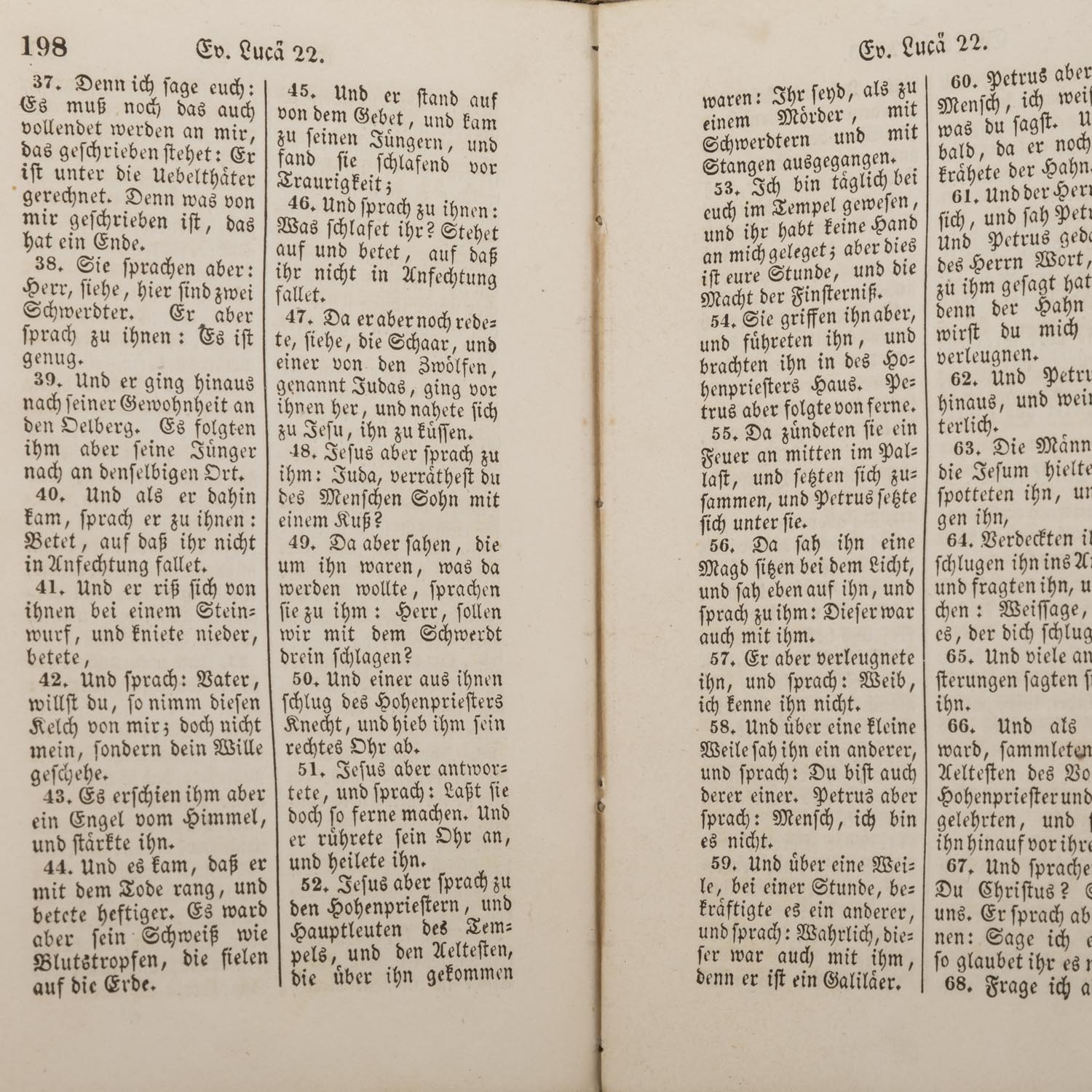 datiert 1846, nach der deutschen Übersetzung Dr. Martin Luthers, Verlag, gedruckt bei Heinrich Ludwig Bönner / Frankfurt am Main, Hardcover, Altdeutsche Schrift, Sprache Deutsch, 596 Seiten. HxBxT: 14,6/10/3,5 cm. Alters- und Gebrauchsspuren, Seiten leicht gebräunt.