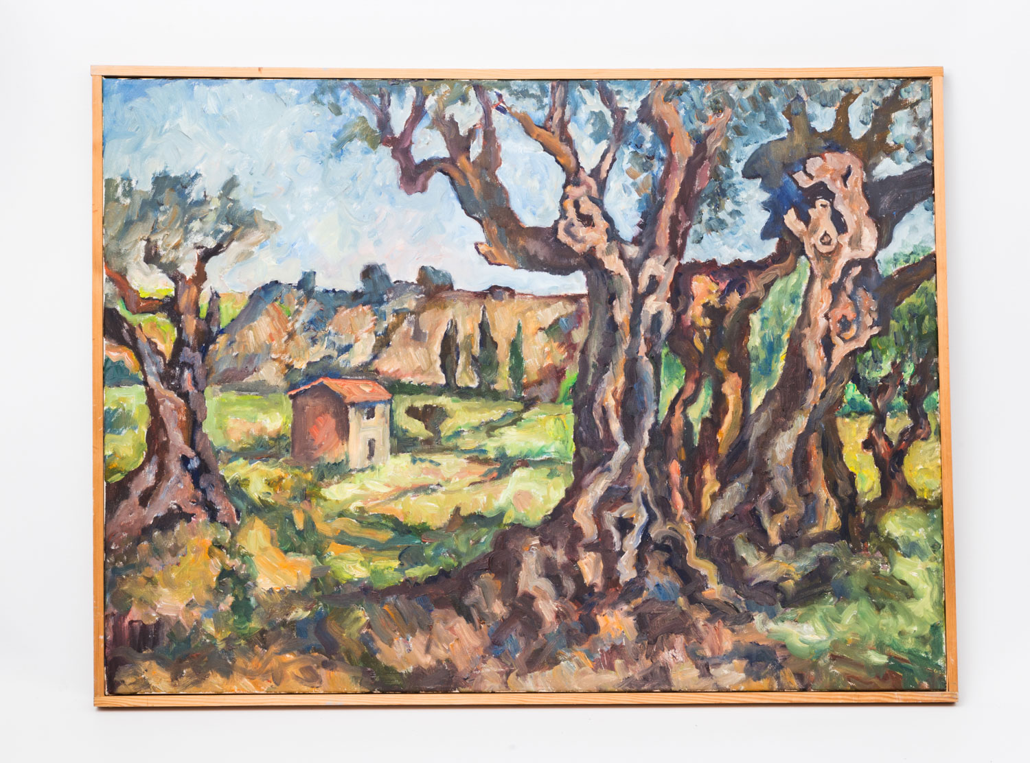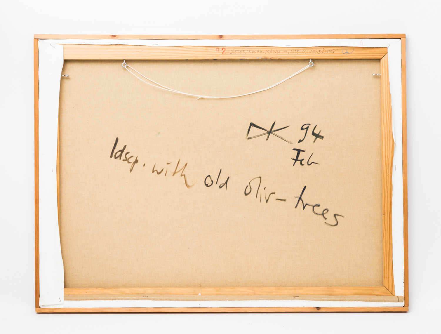 mediterrane Landschaft mit alten Olivenbäumen, verso monogr., dat. (19)94 u. betitelt, Öl auf Lw., ca. 60x81 cm (63x84 cm mit Rahmen). Mit Rahmen. Leichte Altersspuren.