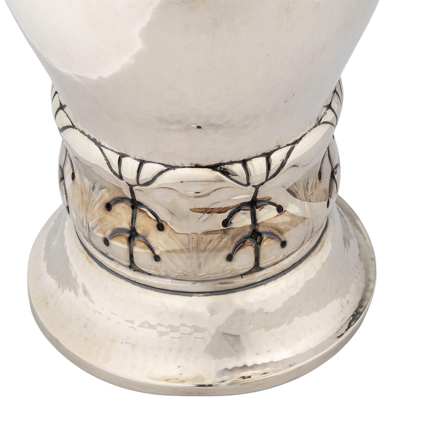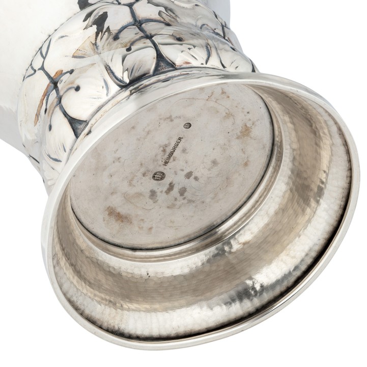 Handgearbeitete Vase mit profiliertem Rundstand und einem breiten reliefierten Band mit vegetabilem Dekor, mit Hammerschlagdekor, Stadtmarke, Meisterzeichen HEIMBÜRGER (Fritz Heimbürger), Beschaumeister CHRISTIAN F. HEISE, H. ca. 26 cm, Gewicht ca. 502 g. Leicht gedellt, Alters- und Gebrauchsspuren.