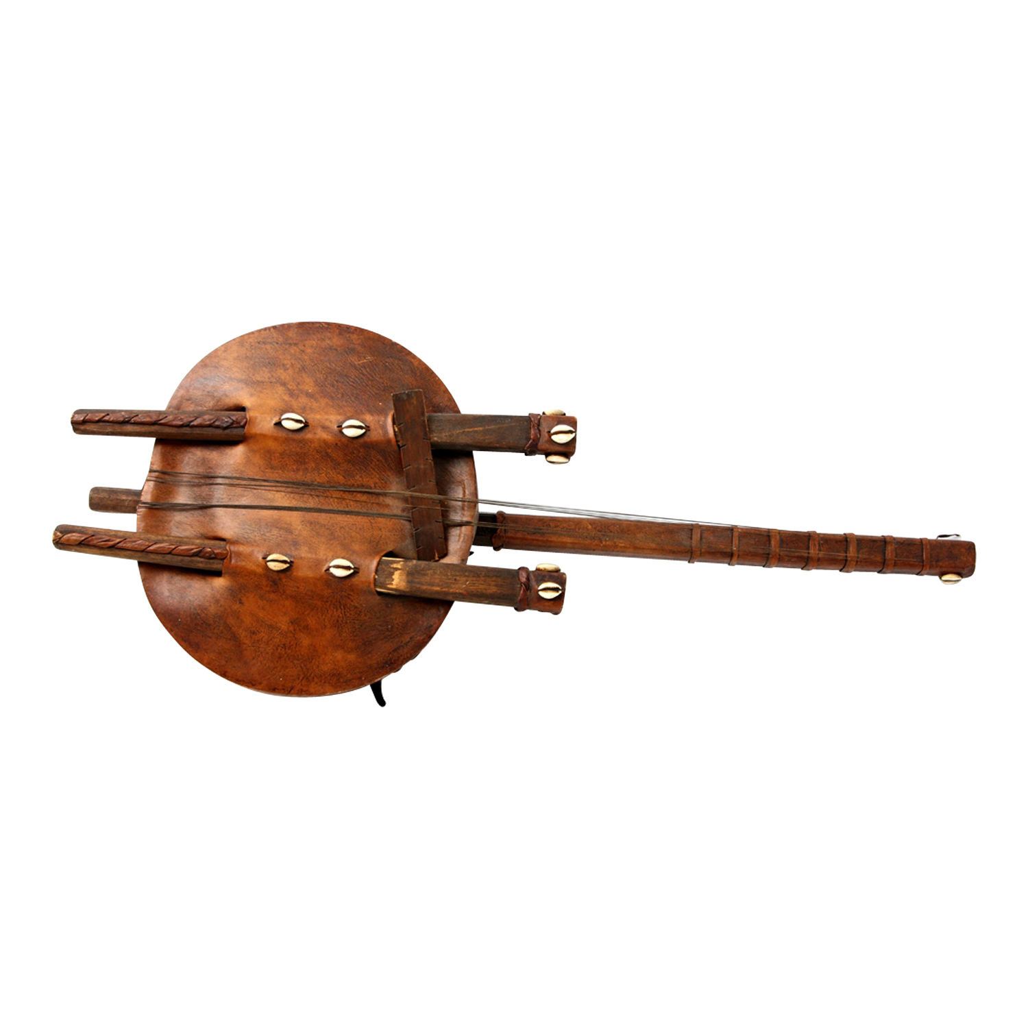 Kora/Stegharfe. AFRIKA 20. Jh. Riesenkürbis mit Lederhaut überzogen, geschmückt u.a. mit Hörnern und Muscheln, L ca. 90 cm, besch., u.a. abgebrochener Steg (anbei), Alters. und Gebrauchsspuren.