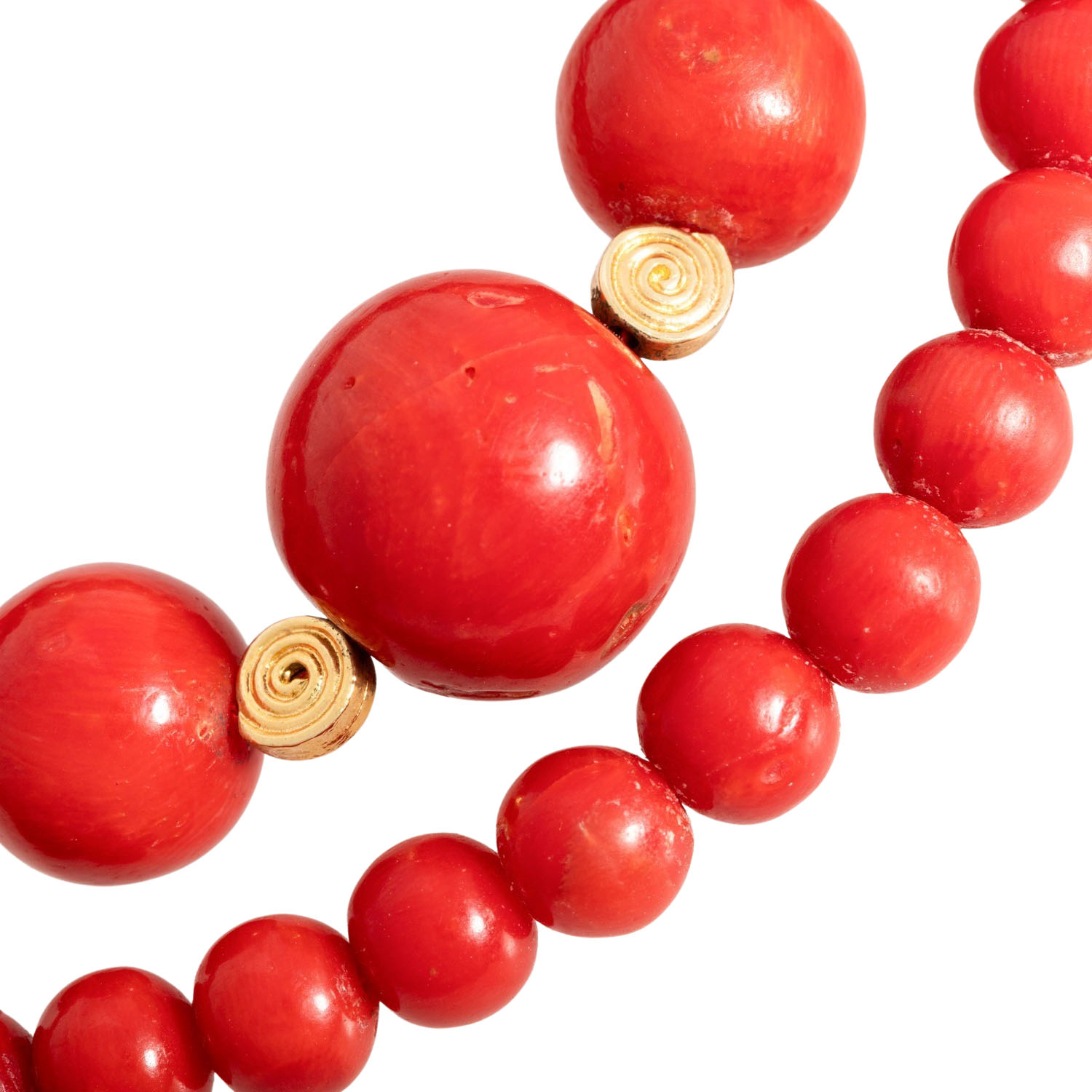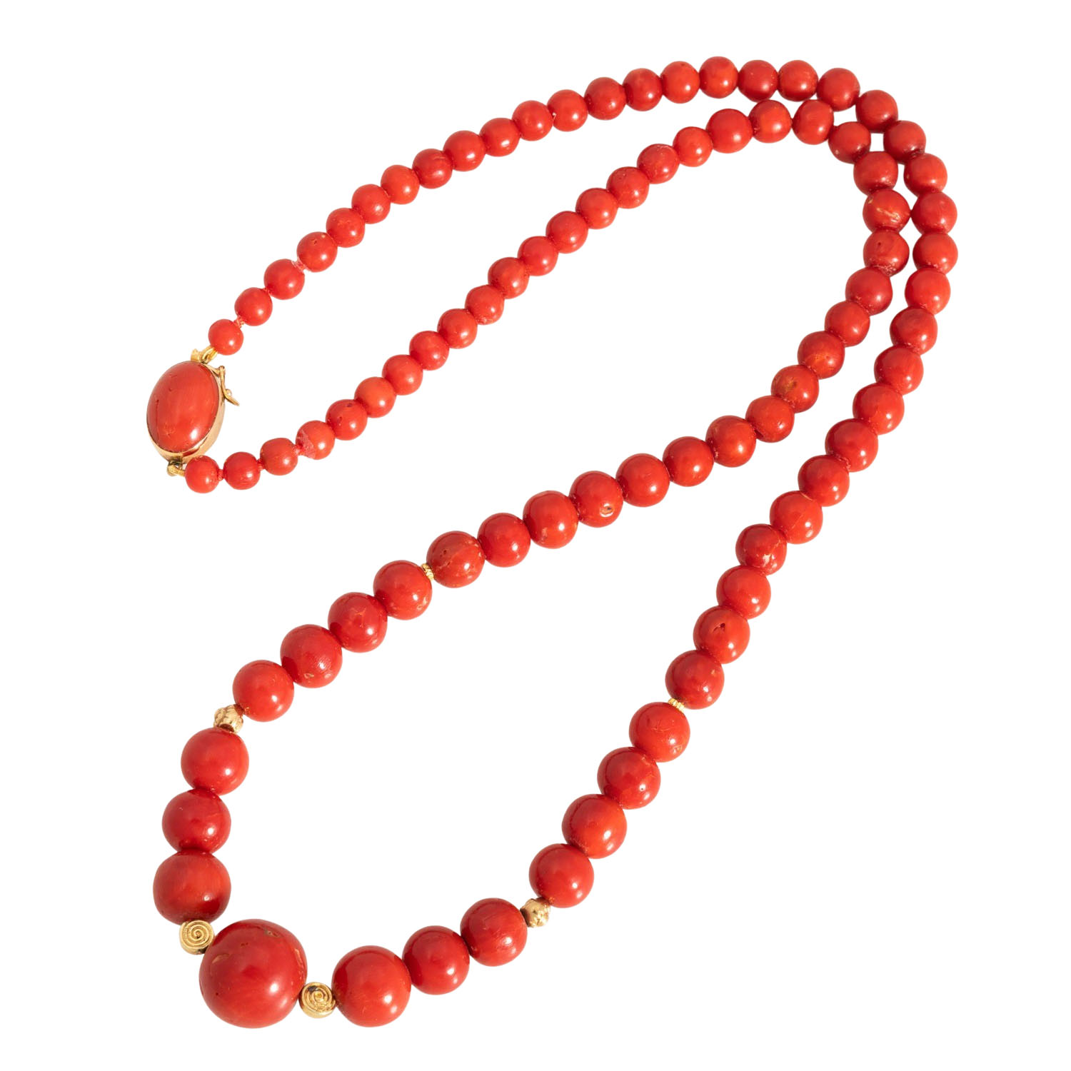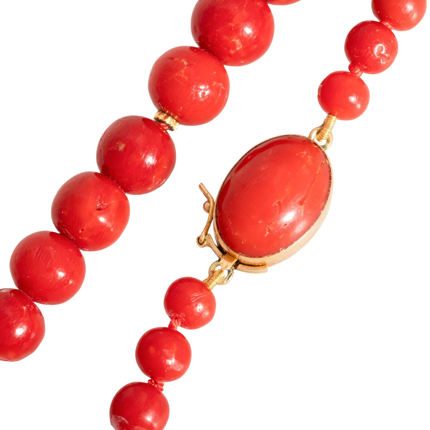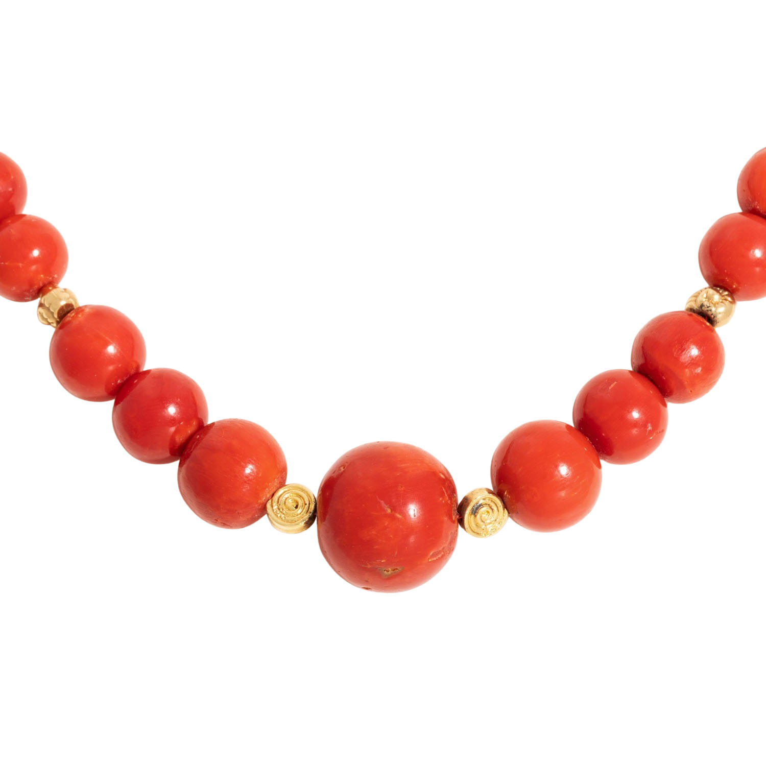 Kugeln 5,3-14,2 mm im Verlauf, 49,8 g, Schließe 18K, Zwischenteile 14K, Länge ca. 60 cm, 2. Hälfte 20. Jh., Tragespuren. KEIN EXPORT AUSSERHALB DER EU!