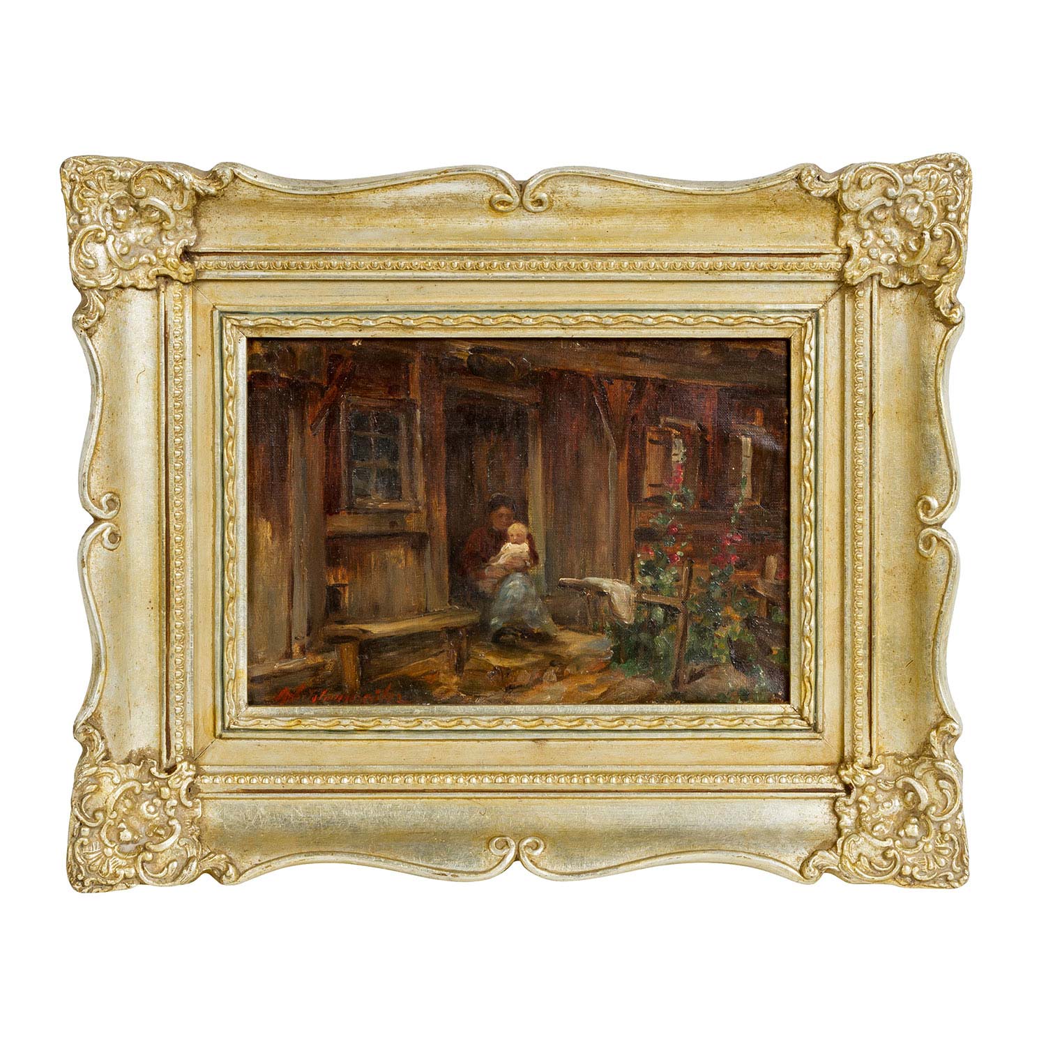 KOTSCHENREITER, G. HUGO (1854-1908), ""Young mother with child in the door of a house"", signed, oil / canvas, HxW: approx. 20x30 cm (40x50 cm with frame). Signs of age and wear on the edges. With frame.
