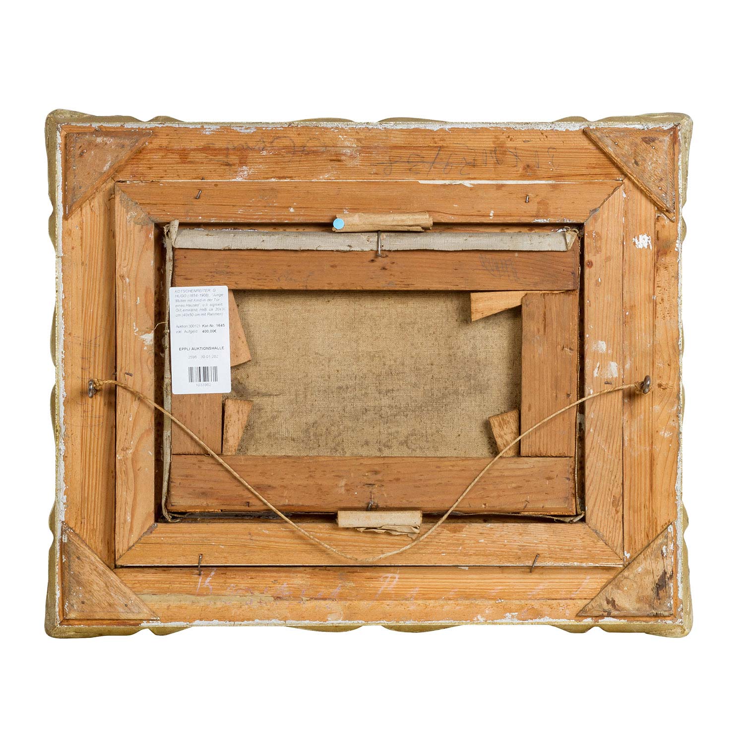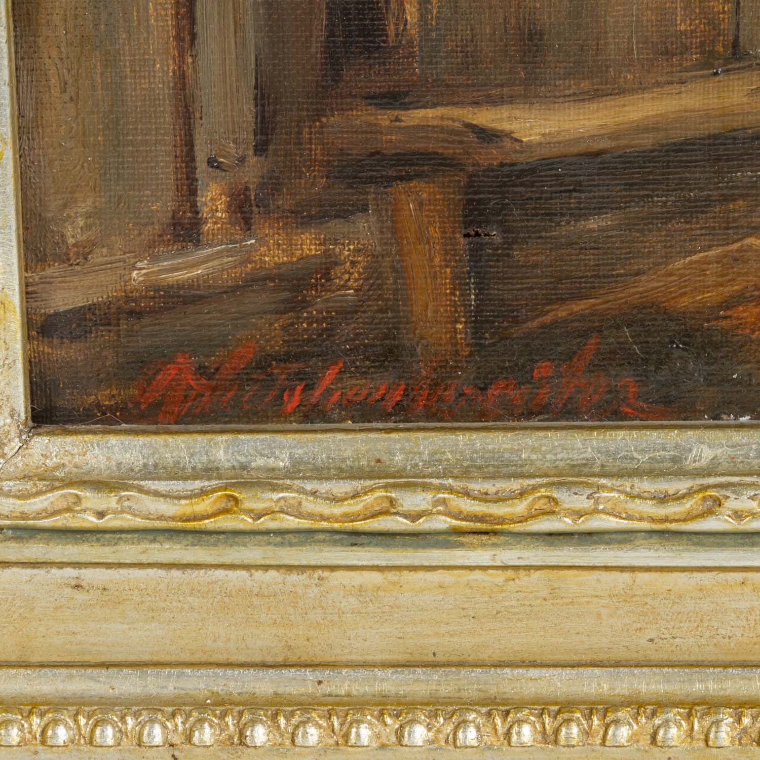 KOTSCHENREITER, G. HUGO (1854-1908), ""Junge Mutter mit Kind in der Tür eines Hauses"", u.li. signiert, Öl/Leinwand, HxB: ca. 20x30 cm (40x50 cm mit Rahmen). Altersspuren und Berieb an den Rändern. Mit Rahmen.