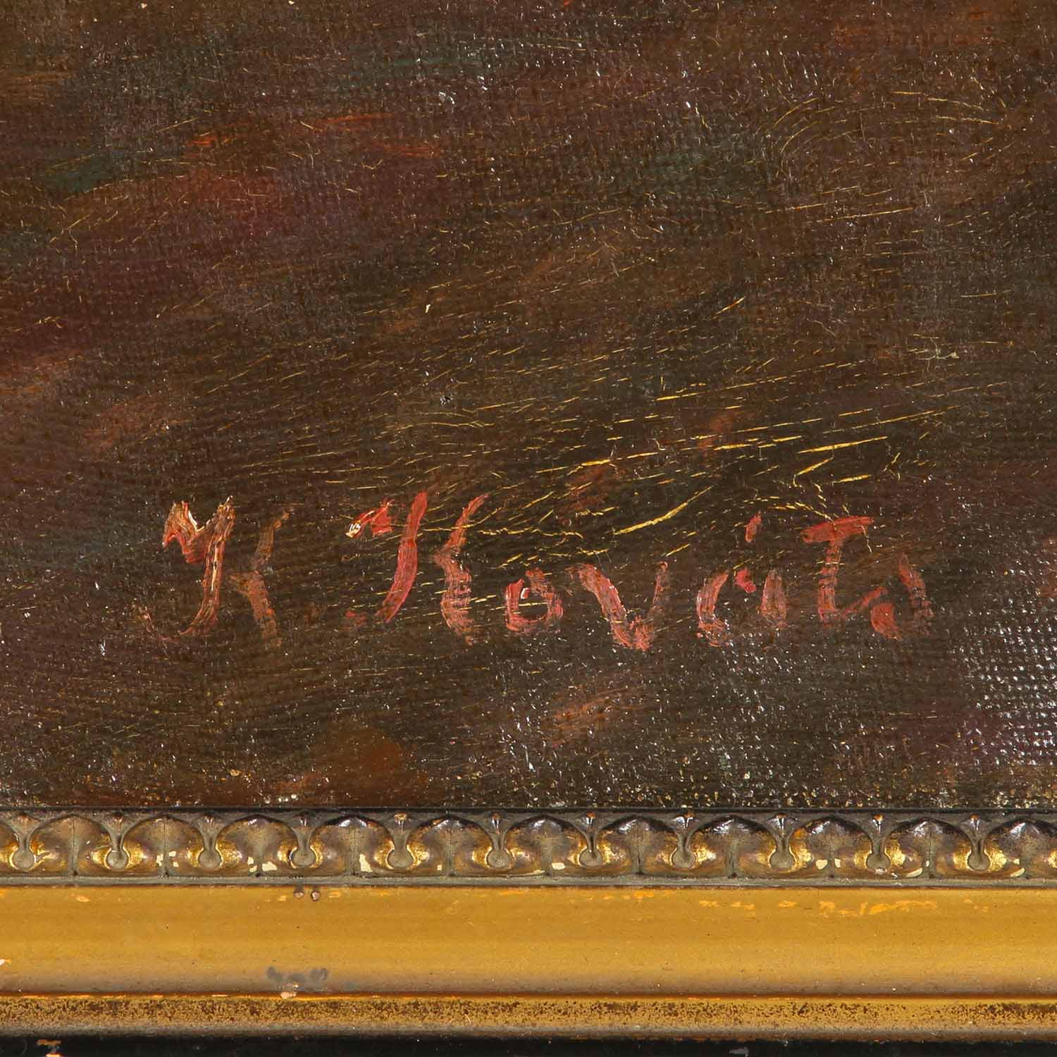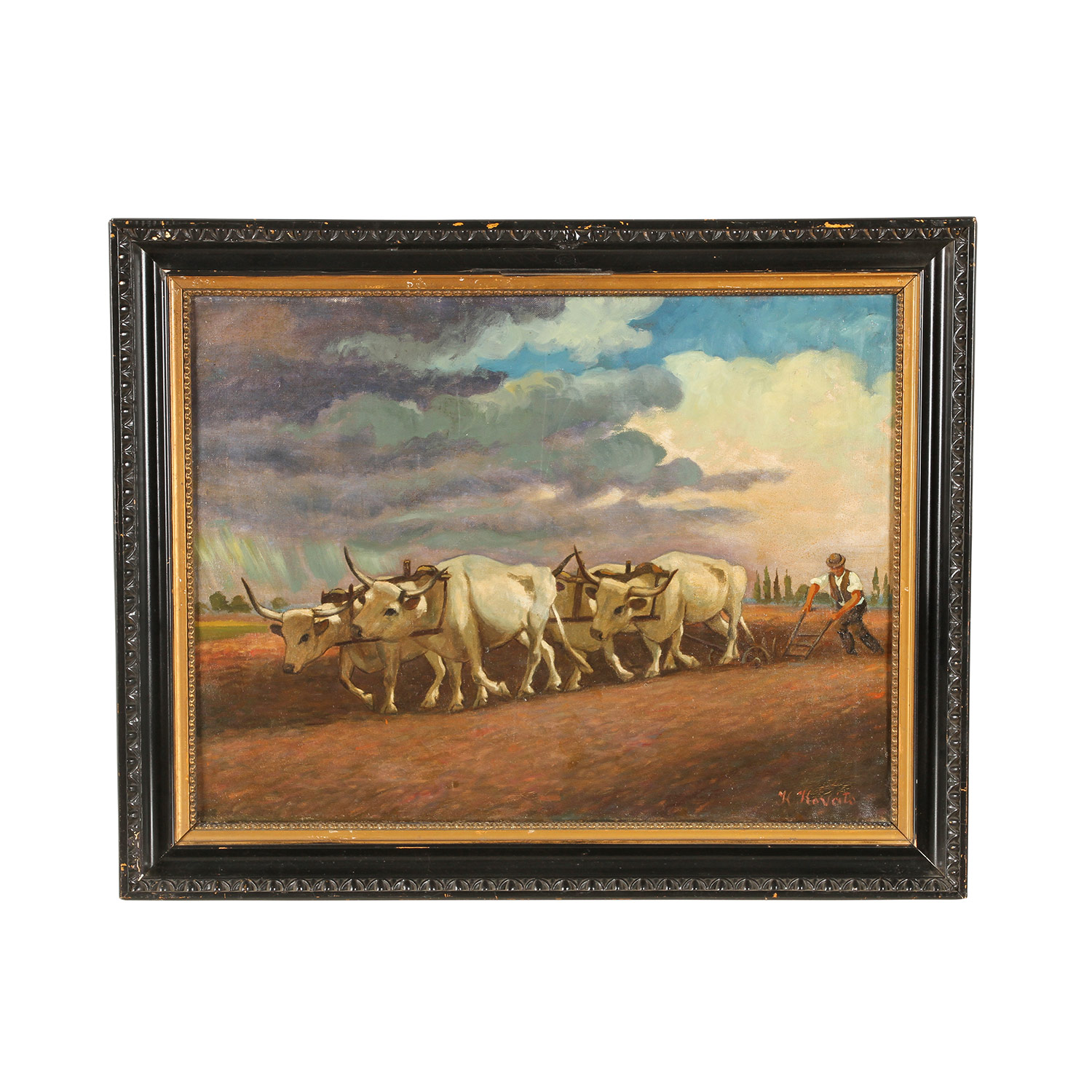 KOVATS, K., wohl KAROLY (1875-?), "Pflügender Bauer mit Ochsengespann", Pustalandschaft in Gewitterstimmung, u.re. sign., Öl/Leinwand, HxB: 59x79 cm (75x94 cm mit Rahmen). Druckstelle u. Berieb am Rand. Mit Rahmen (besch.).