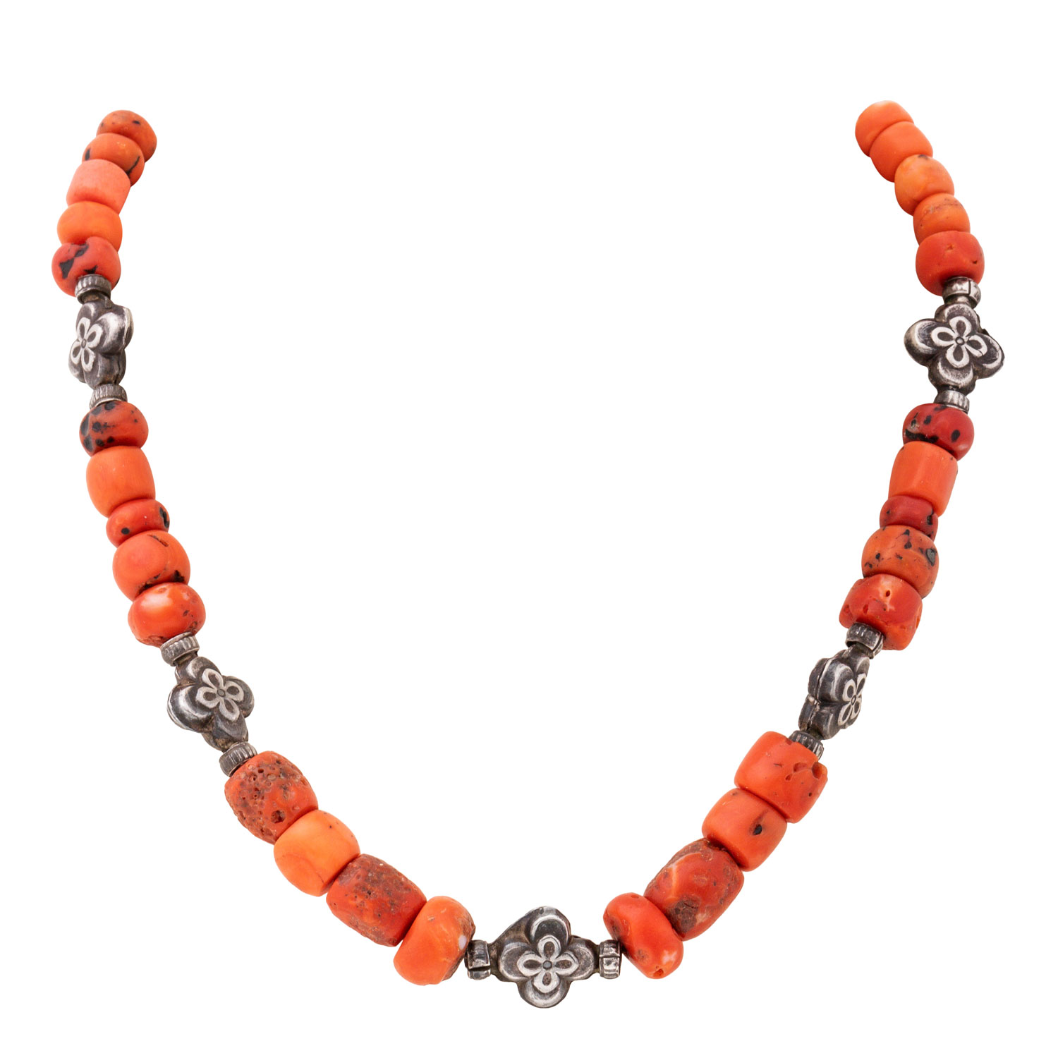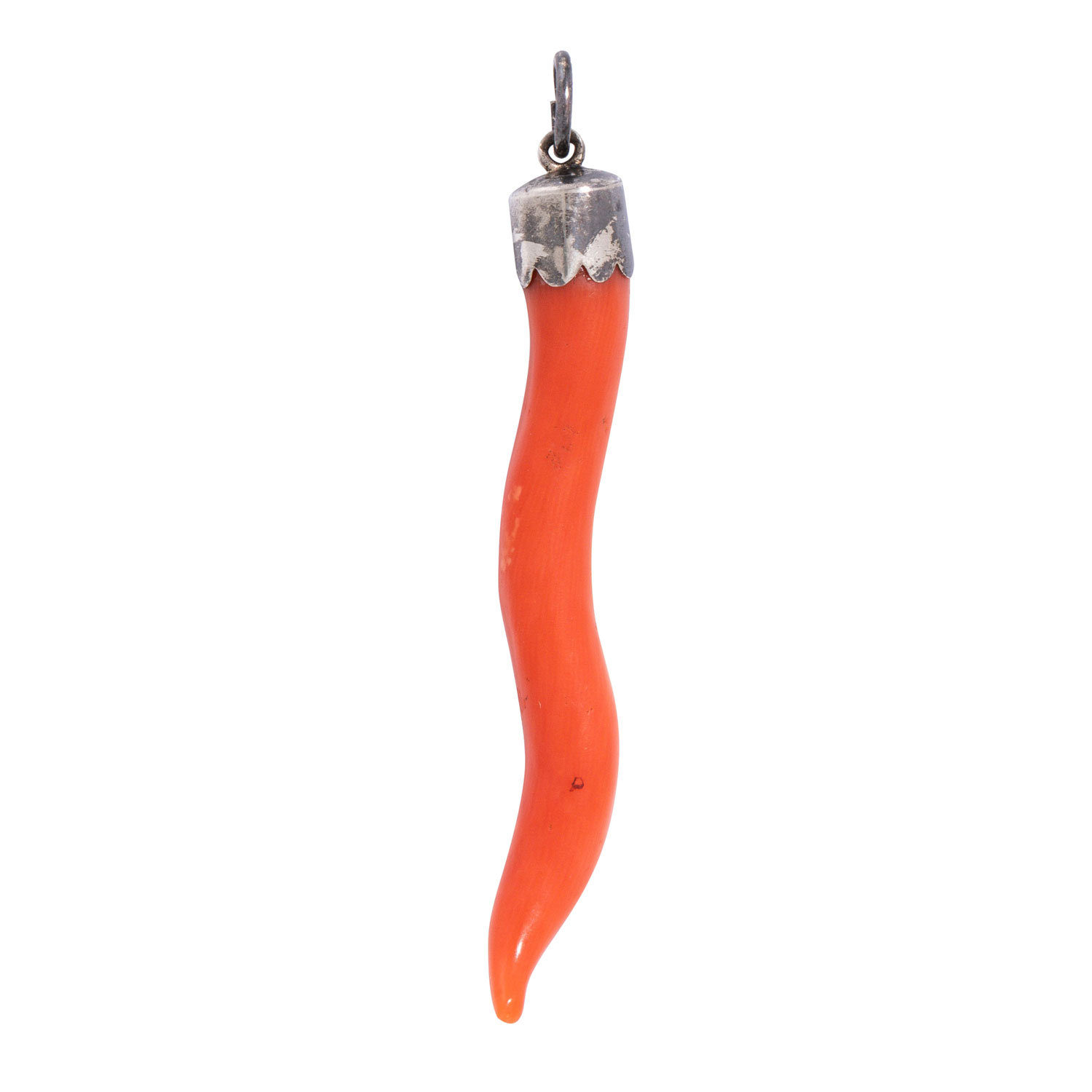 bestehend aus Kette L: 43 cm und Anhänger L: 5,5 cm, 58,7 g, Korallen 7-12 mm tlw. rissig, 20. Jh., Tragespuren. KEIN VERSAND AUSSERHALB DER EU!(12)