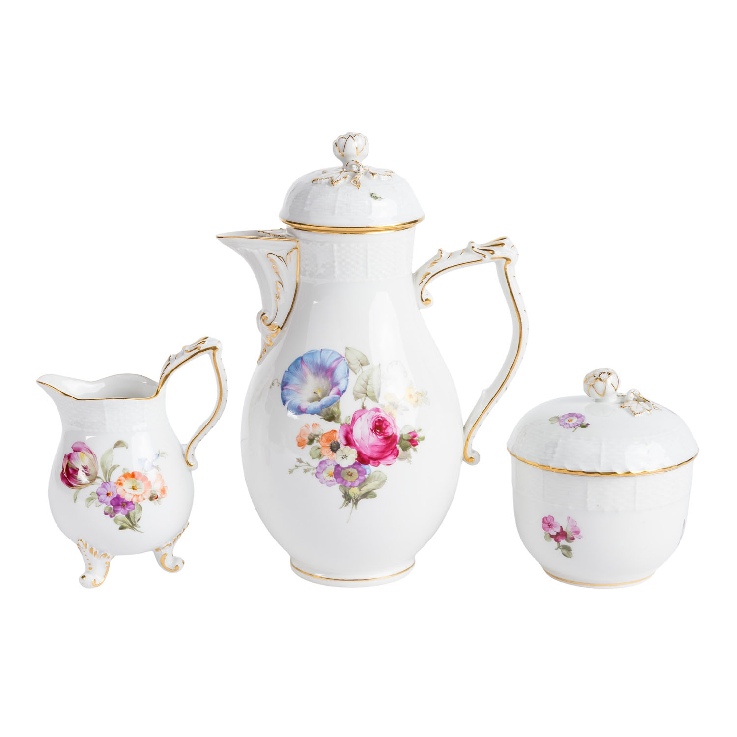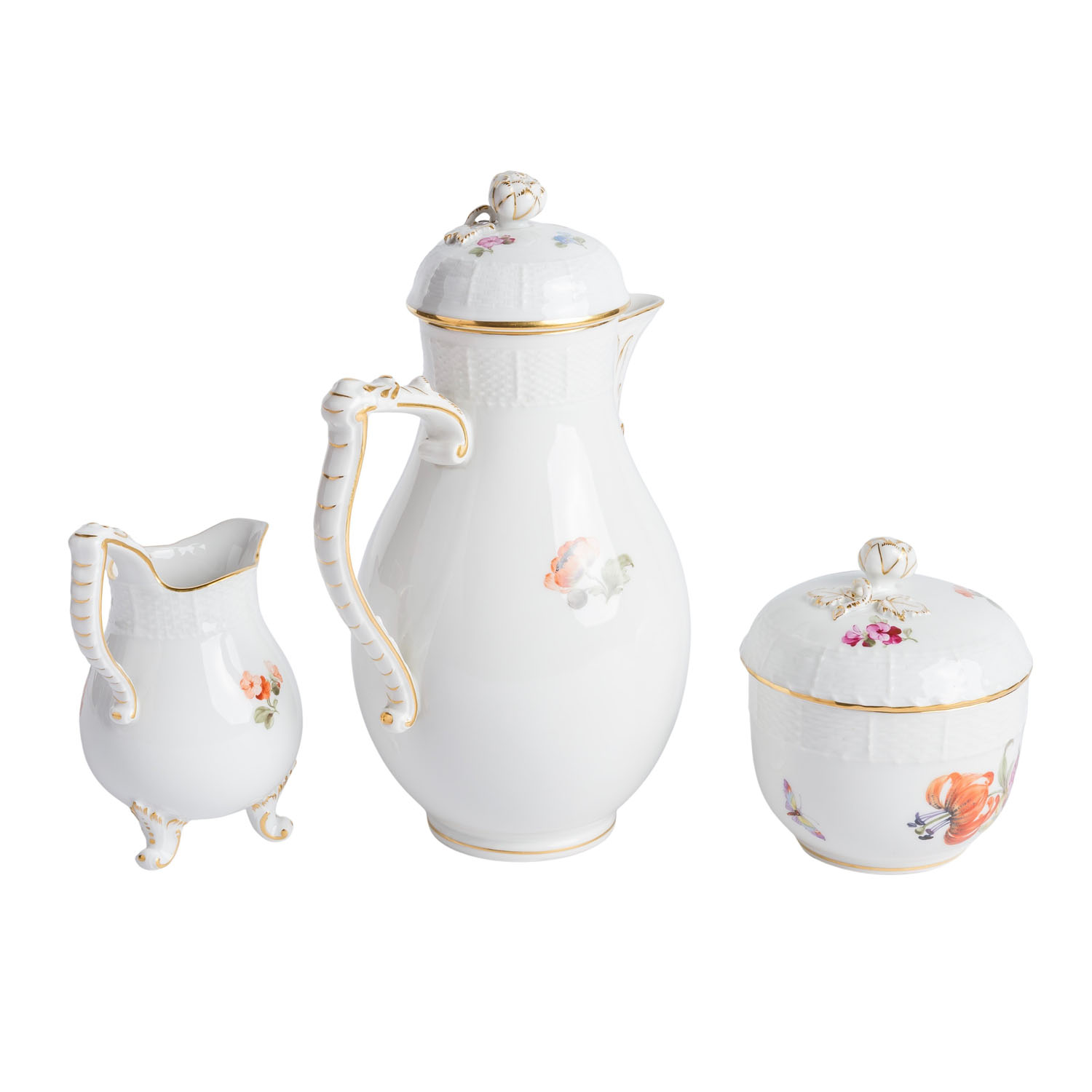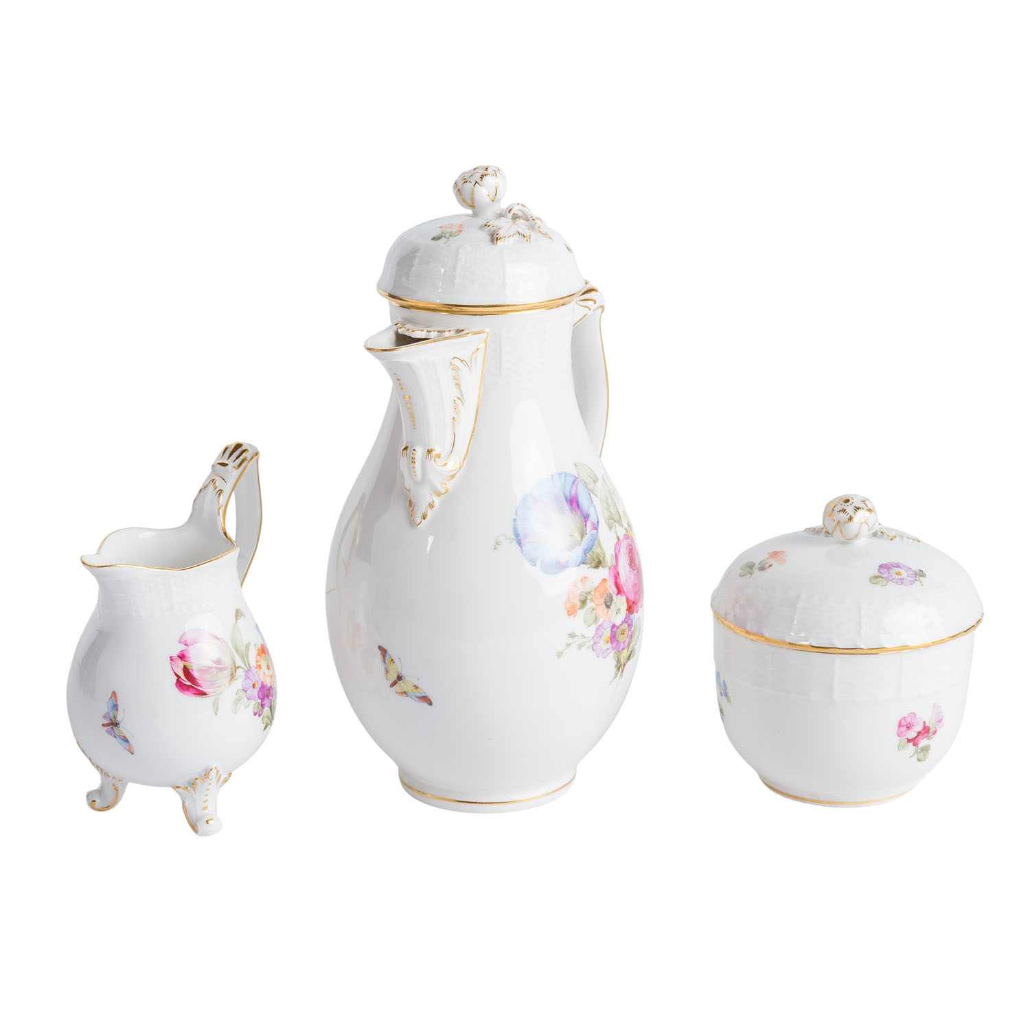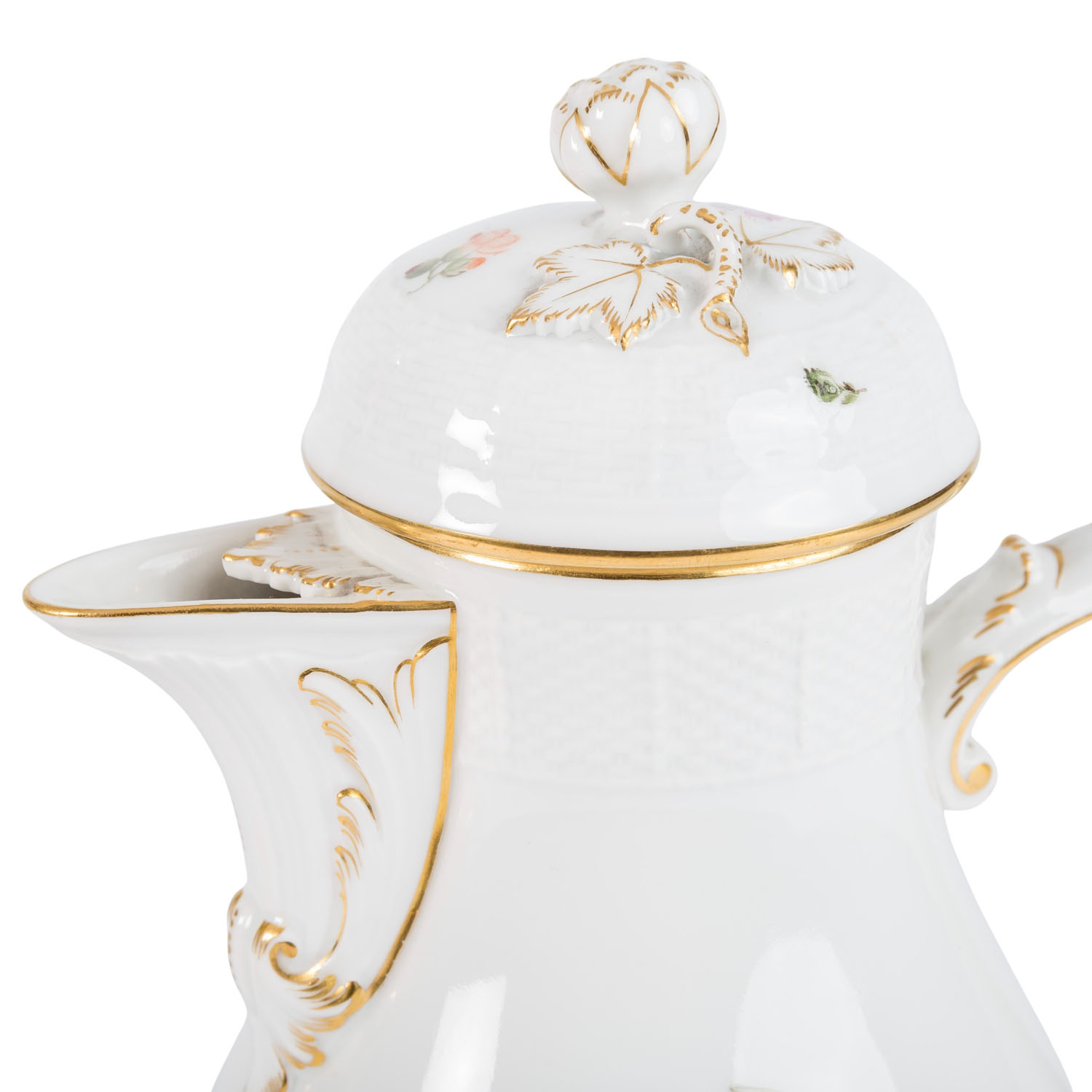 insgesamt 11 Teile. Korbrandrelief mit polychromer Staffage von Blumen und Insekten, bestehend aus geschweiftem Tablett mit ornamentalen Handhaben, L 43, 5 cm, kleine Kaffeekanne mit Rosenknauf, Zuckerdose, D 8, 5 cm und 1 Milchkännchen, H 11, 5 cm, 2 halbkugelige Tassen mit Untertassen und 2 Kuchenteller, D 20 cm, dazu 1 Zierteller mit aufwendiger Randvergoldung, je blaue Zeprtermarke und rote Reichsapfelmarke 1. Wahl, tlw. Alters- und Gebrauchsspuren.