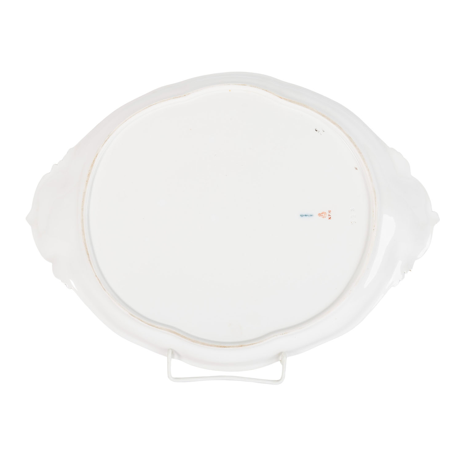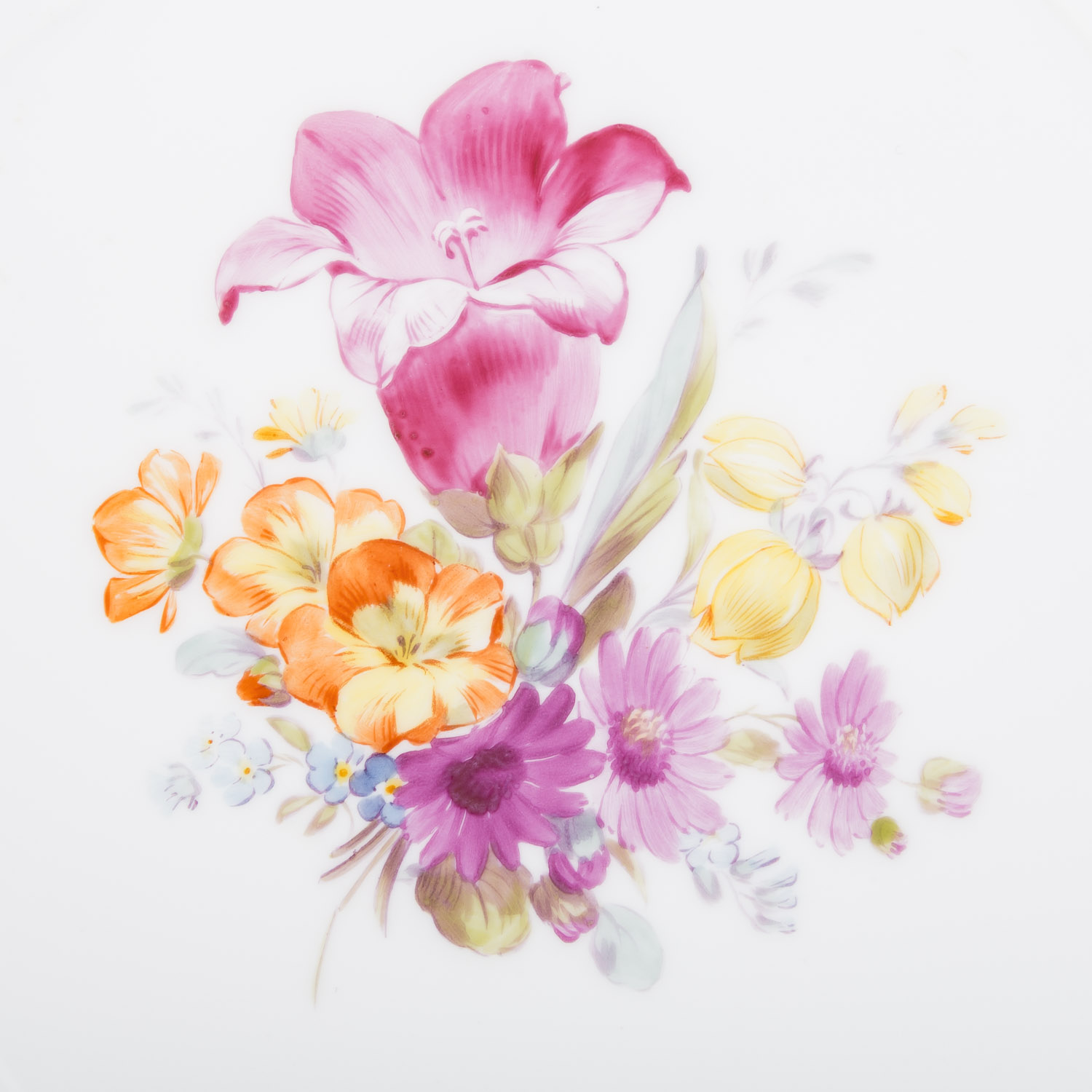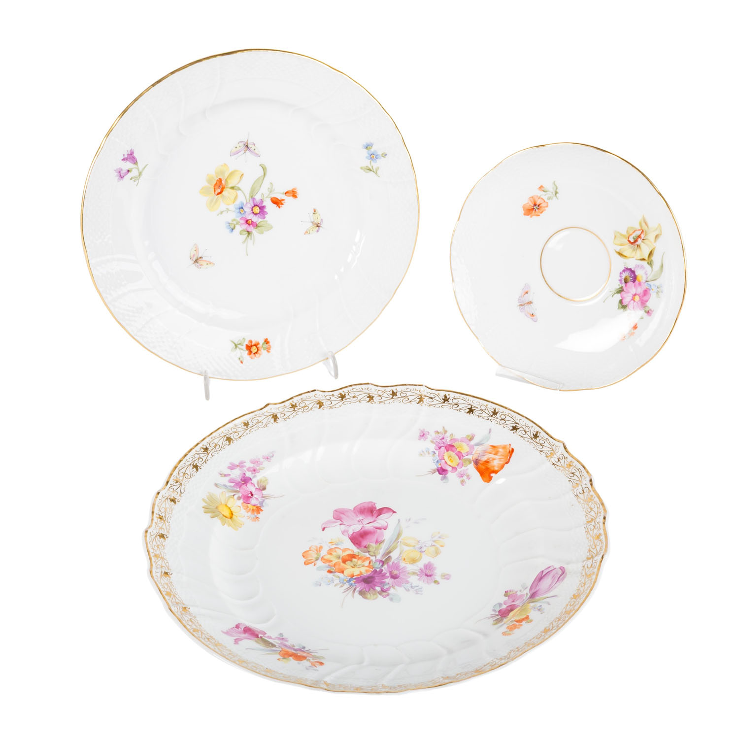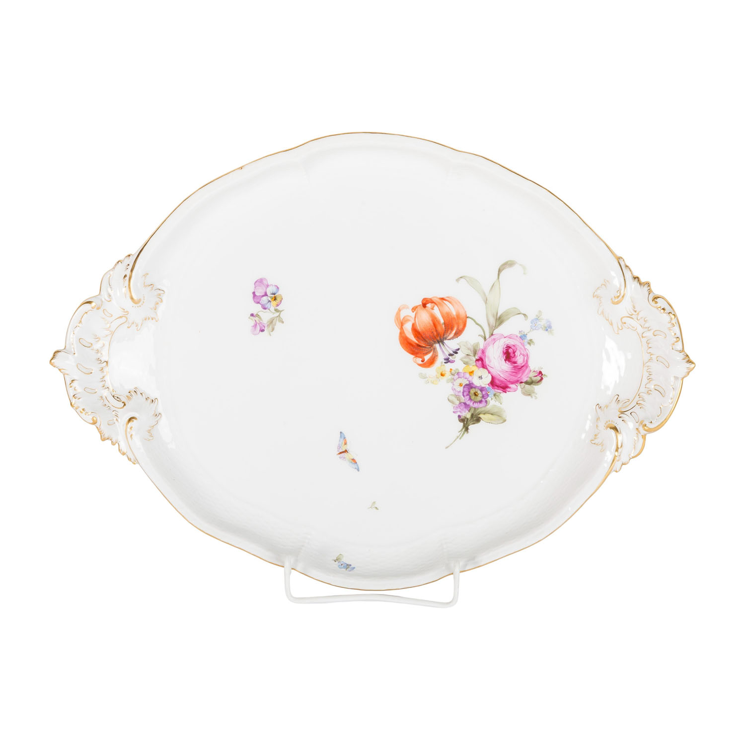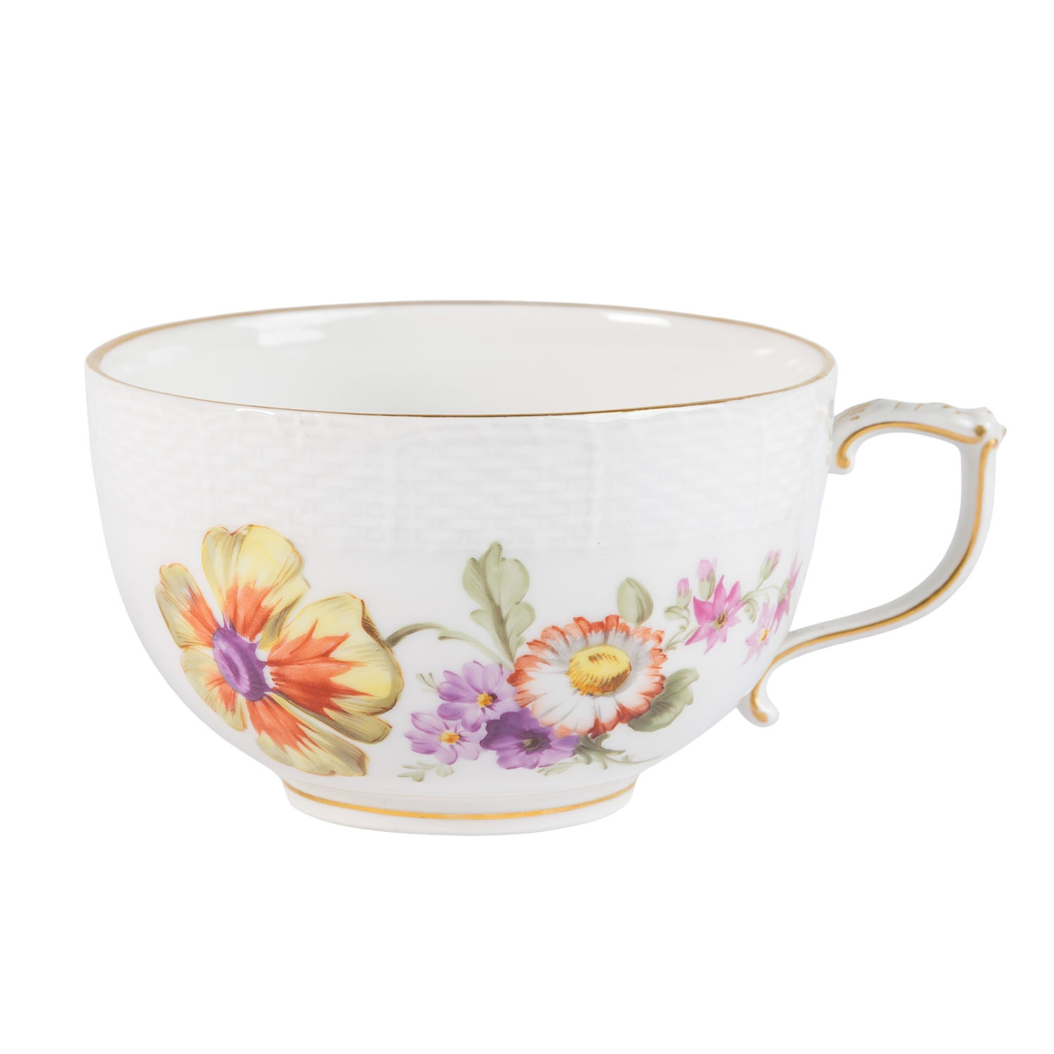 insgesamt 11 Teile. Korbrandrelief mit polychromer Staffage von Blumen und Insekten, bestehend aus geschweiftem Tablett mit ornamentalen Handhaben, L 43, 5 cm, kleine Kaffeekanne mit Rosenknauf, Zuckerdose, D 8, 5 cm und 1 Milchkännchen, H 11, 5 cm, 2 halbkugelige Tassen mit Untertassen und 2 Kuchenteller, D 20 cm, dazu 1 Zierteller mit aufwendiger Randvergoldung, je blaue Zeprtermarke und rote Reichsapfelmarke 1. Wahl, tlw. Alters- und Gebrauchsspuren.