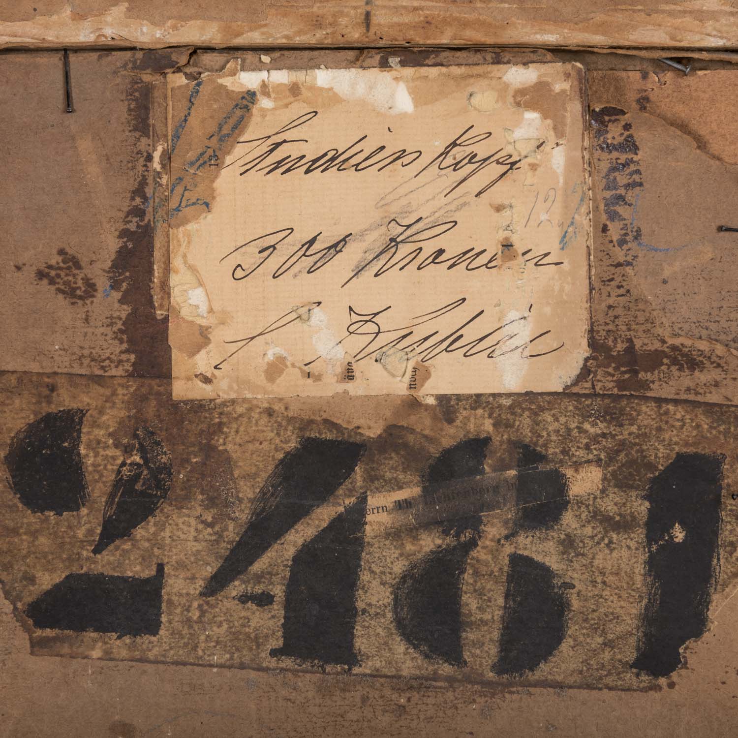 Mischtechnik auf Papier, Verso mit handgeschriebenes Papieretikett: 'Studienkopf, 330 Kronen, L.Kubler' HxB: 31/24 cm. Krakeliert. Rahmen, HxB: 45/36 cm.