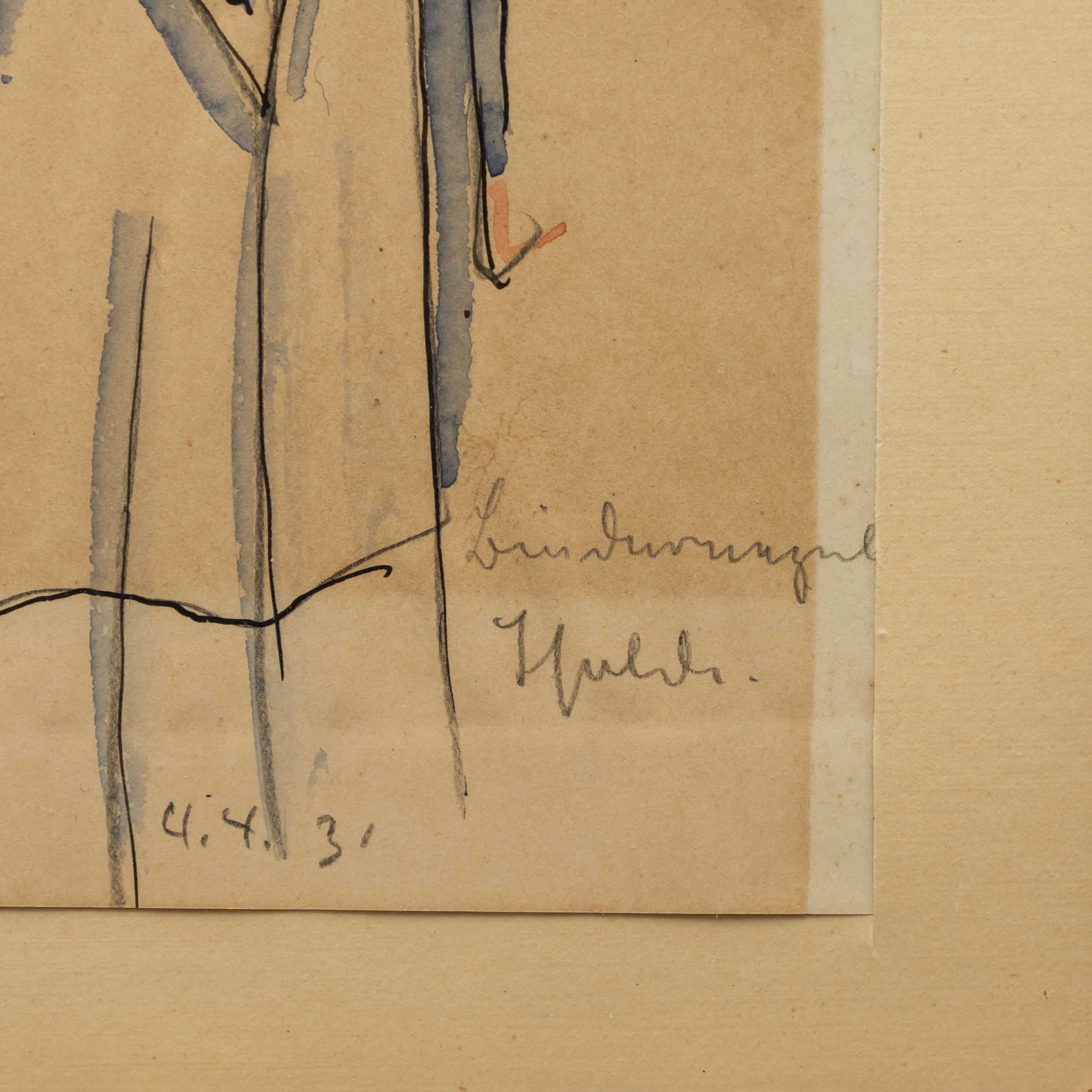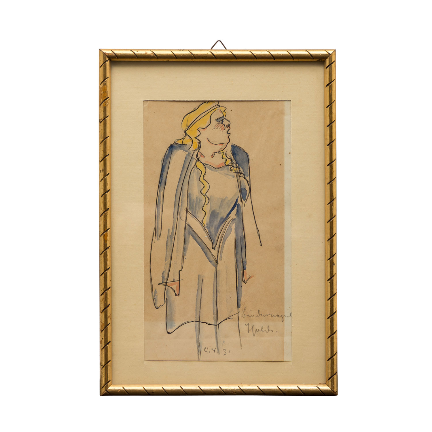 ARTIST 1st half of the 20th century, "Liederengel", Portrait of a standing lady in a blue robe with blonde long hair, inscribed and indistinctly signed Held ?, dated 4.4.31, watercolor and ink pen over pencil, HxW: about 20x13 cm (25x17.5 cm with frame,) tinted and light edge, slightly spotty, framed behind glass in passe-partout.