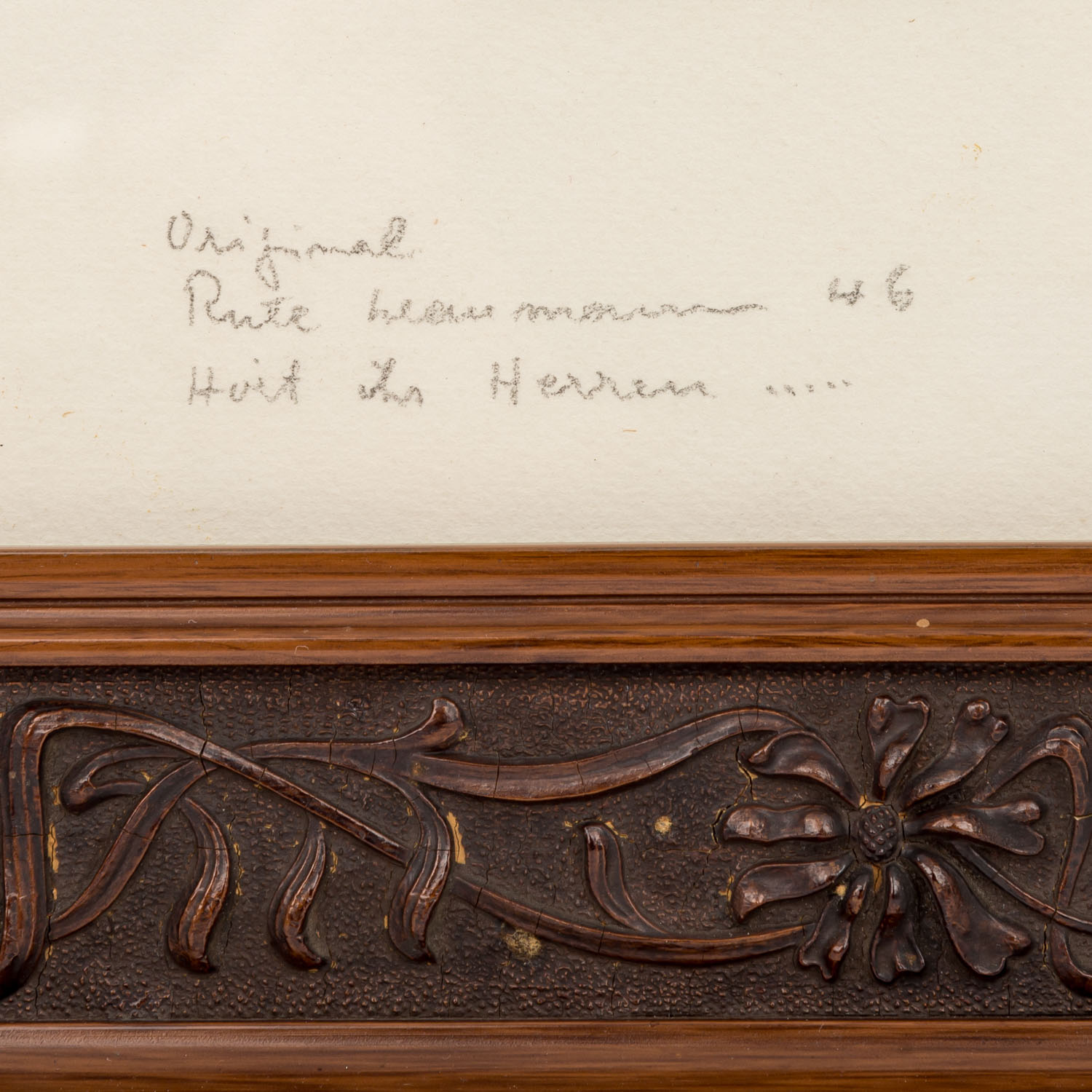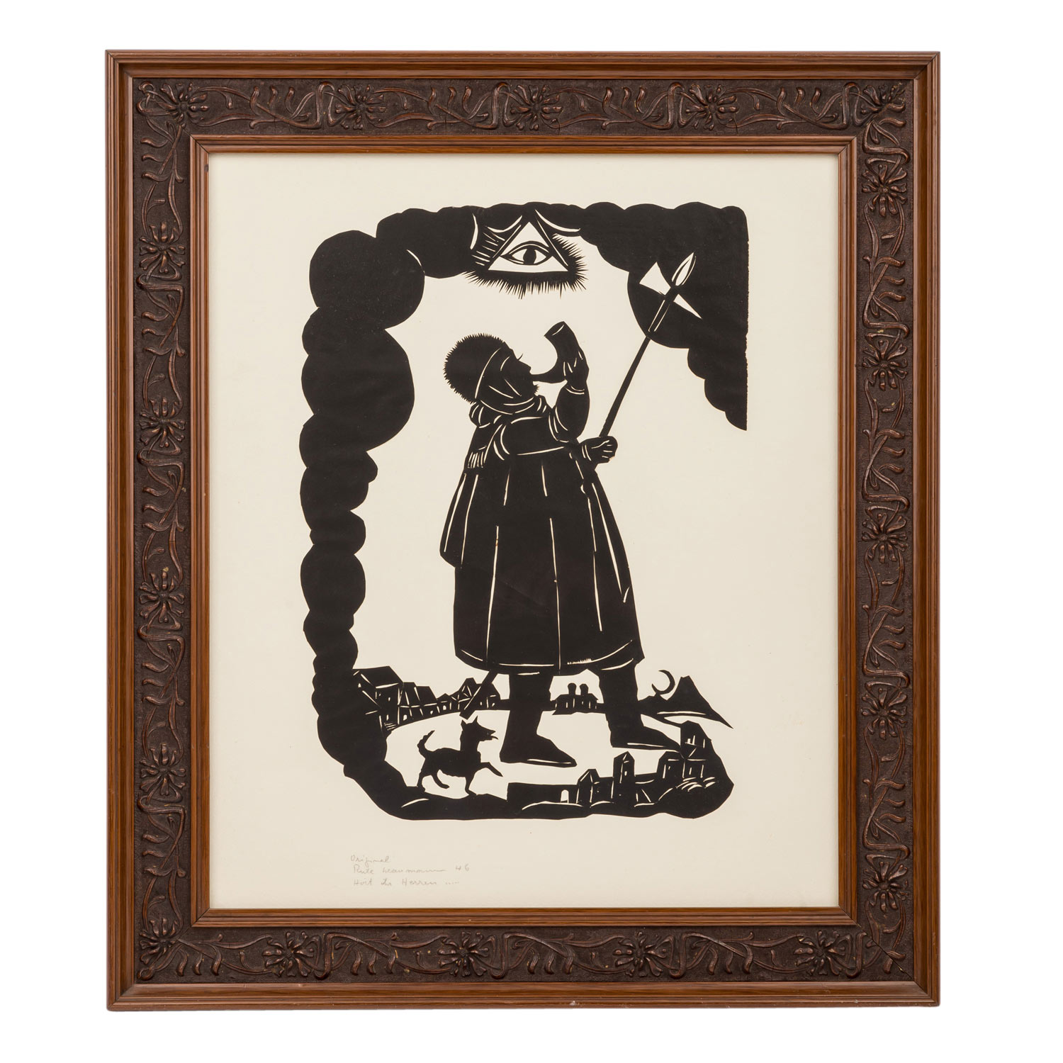 Artist in the 1st half of the 20th century, SCISSOR CUT ""Do you hear gentlemen ..."", depiction of a night watchman in the city, under the watchful eye of God, silhouette / paper, including indistinct artist's name 'Original, Ruth Baumann'? and title, HxW: silhouette approx. 37x27 cm, sheet approx. 46x38 cm, external dimensions frame approx. 57x49 cm. Minim. wavy, signs of age and crease. With glazed frame.