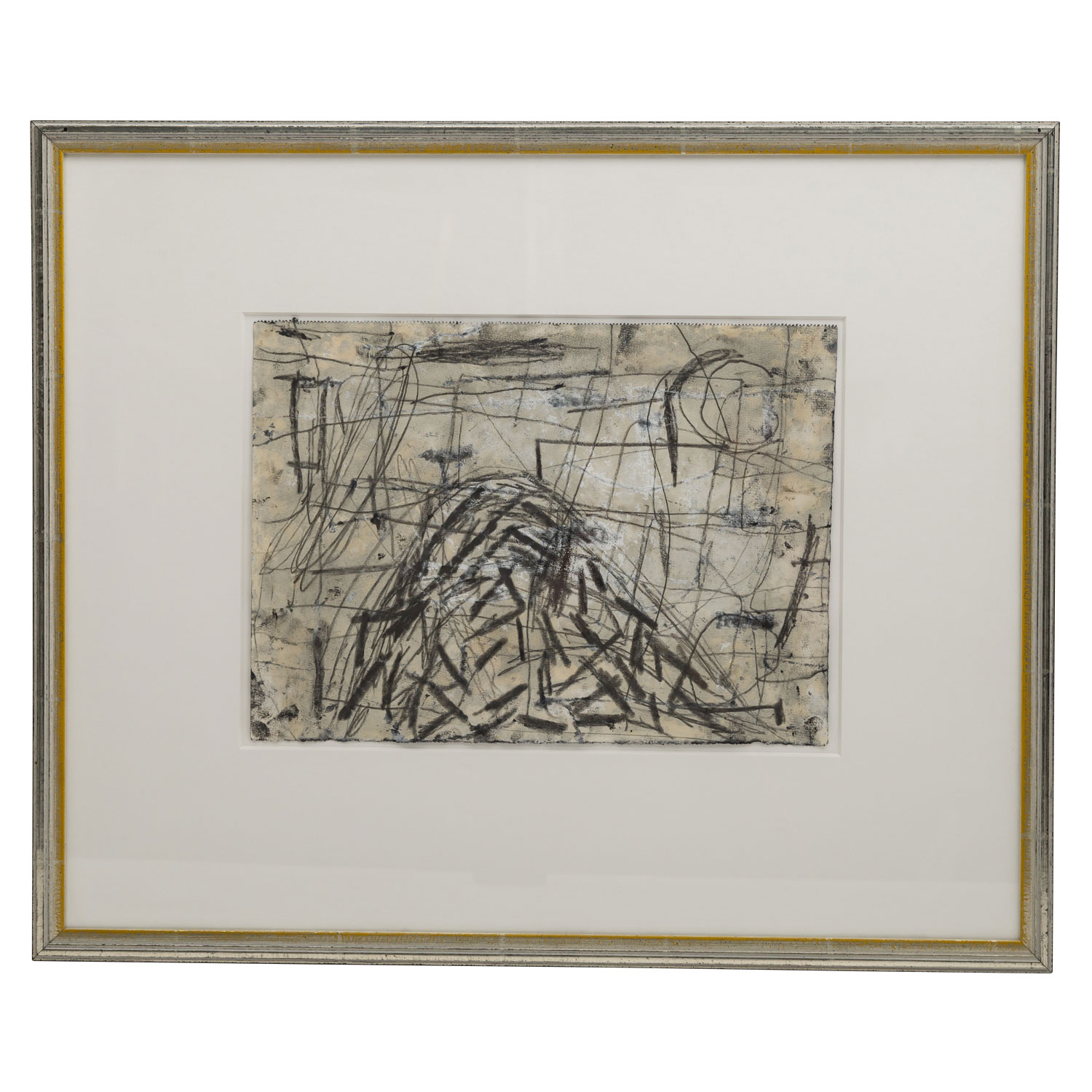 ARTIST 20th century, ""ohne Titel"", abstract composition in shades of gray, unsigned, mixed media / laid paper (upper edge perforated), HxW: approx. 22.5x31 cm (45x54 cm with frame). Wavy (probably process-related). Framed behind glass with passepartout.
