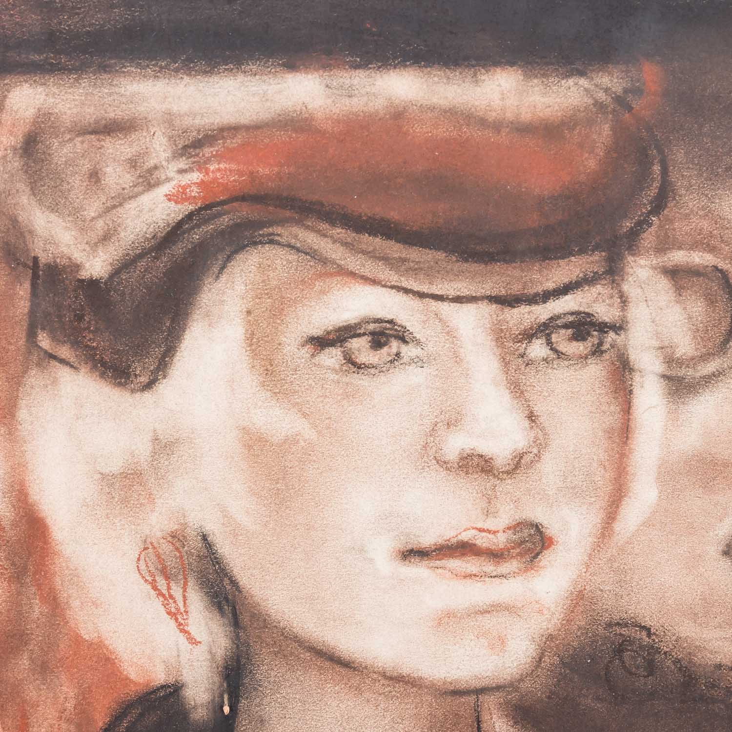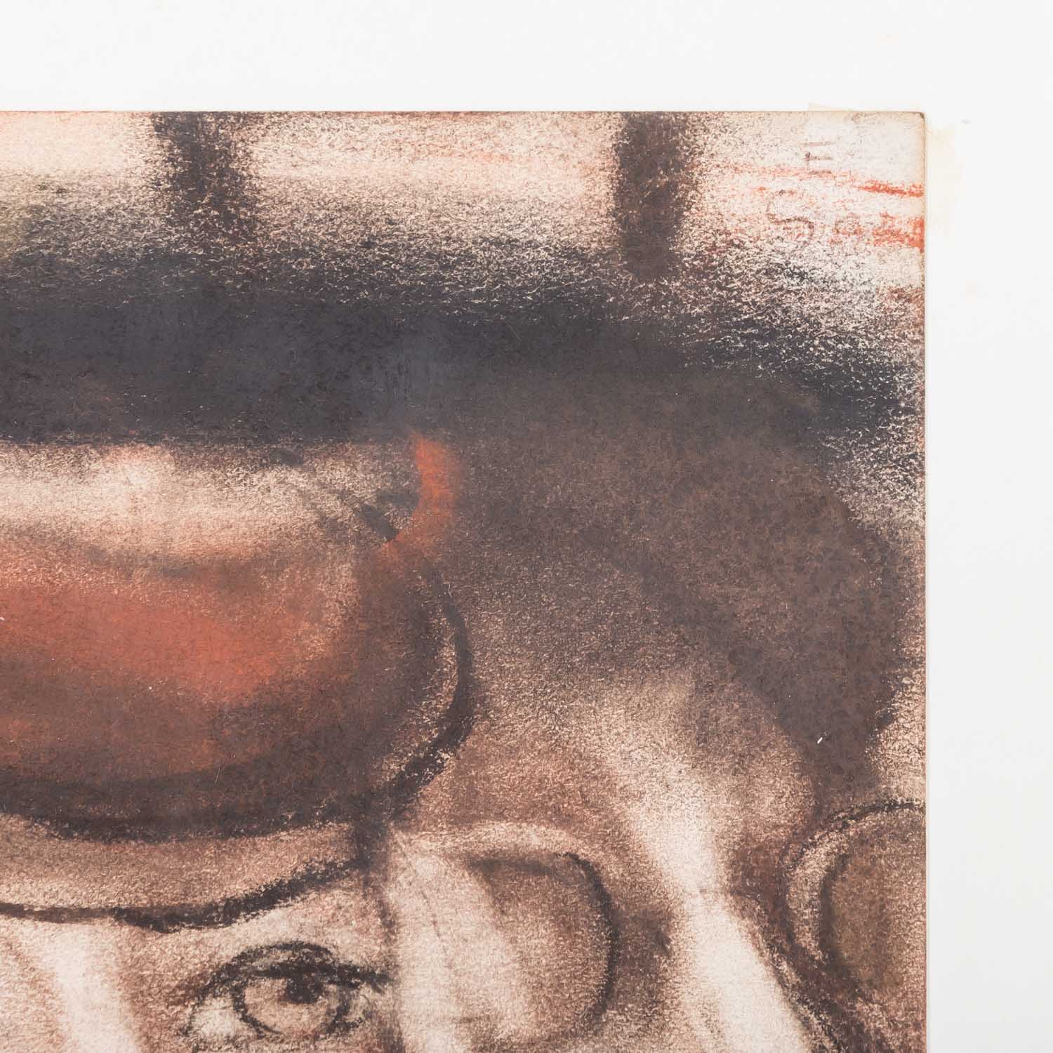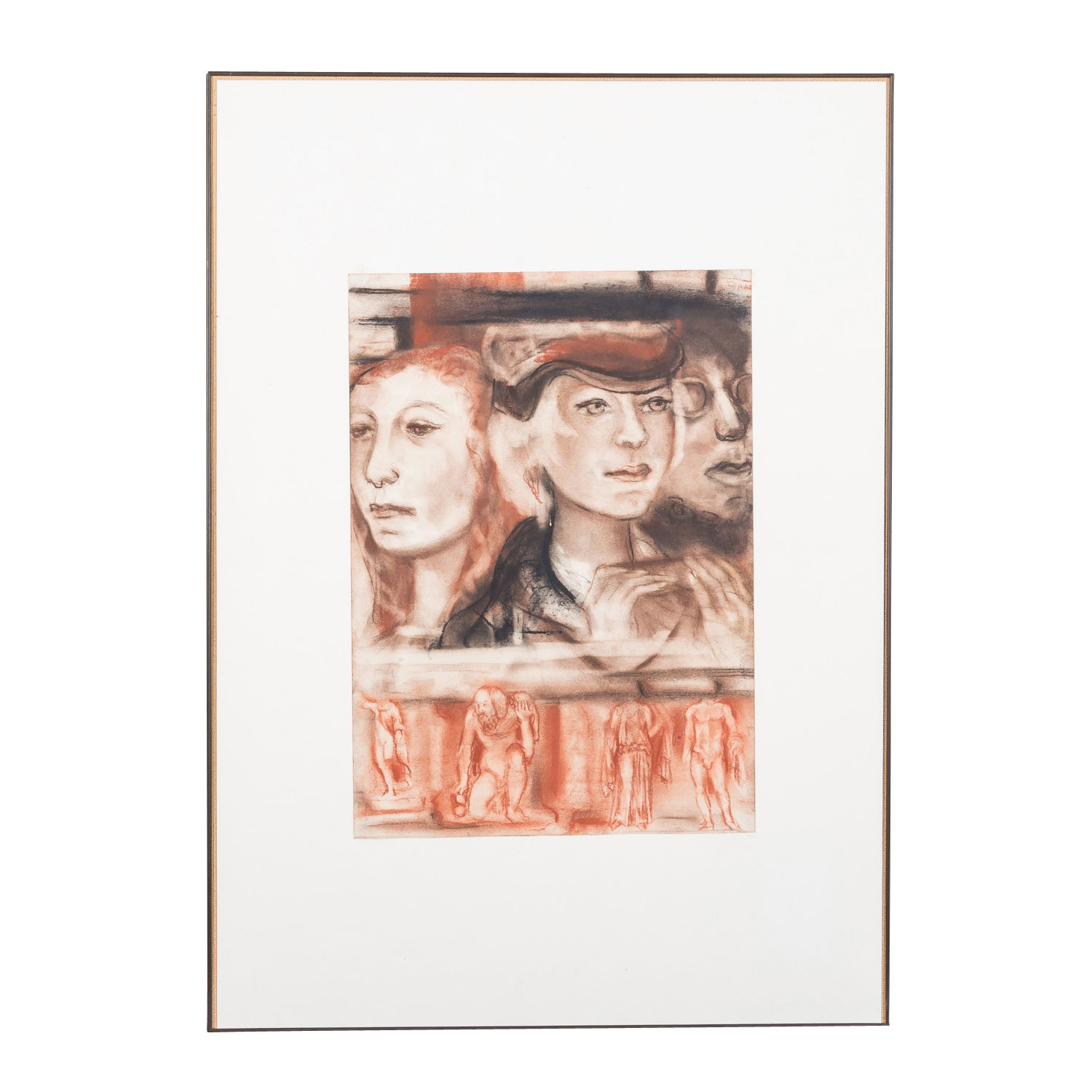 drei Personen oberhalb eines Antikenfrieses, o.re. undeutliche Restsignatur/Monogramm 'E. S...', Pastell/Papier, HxB: ca. 41,5x29,5 cm (70x50 cm mit Rahmen). Altersspuren. Auf Unterlagenkarton hinter Glas gerahmt.