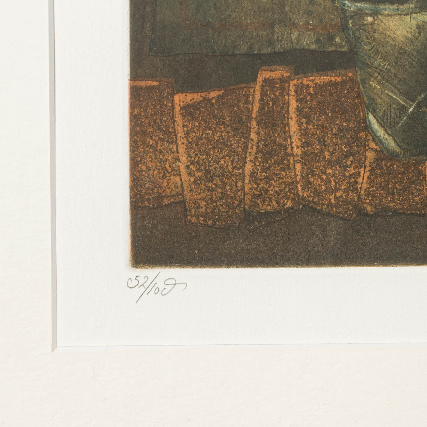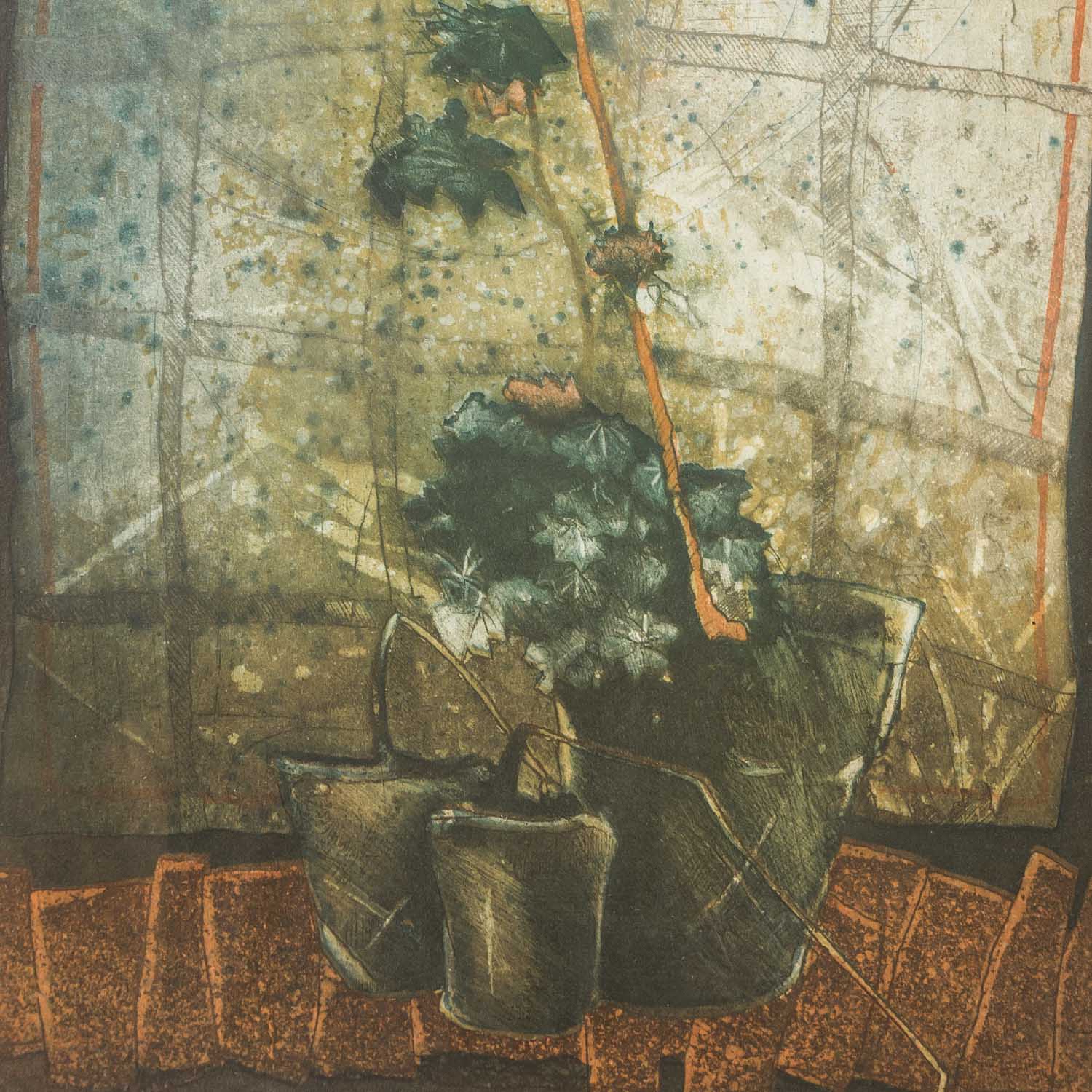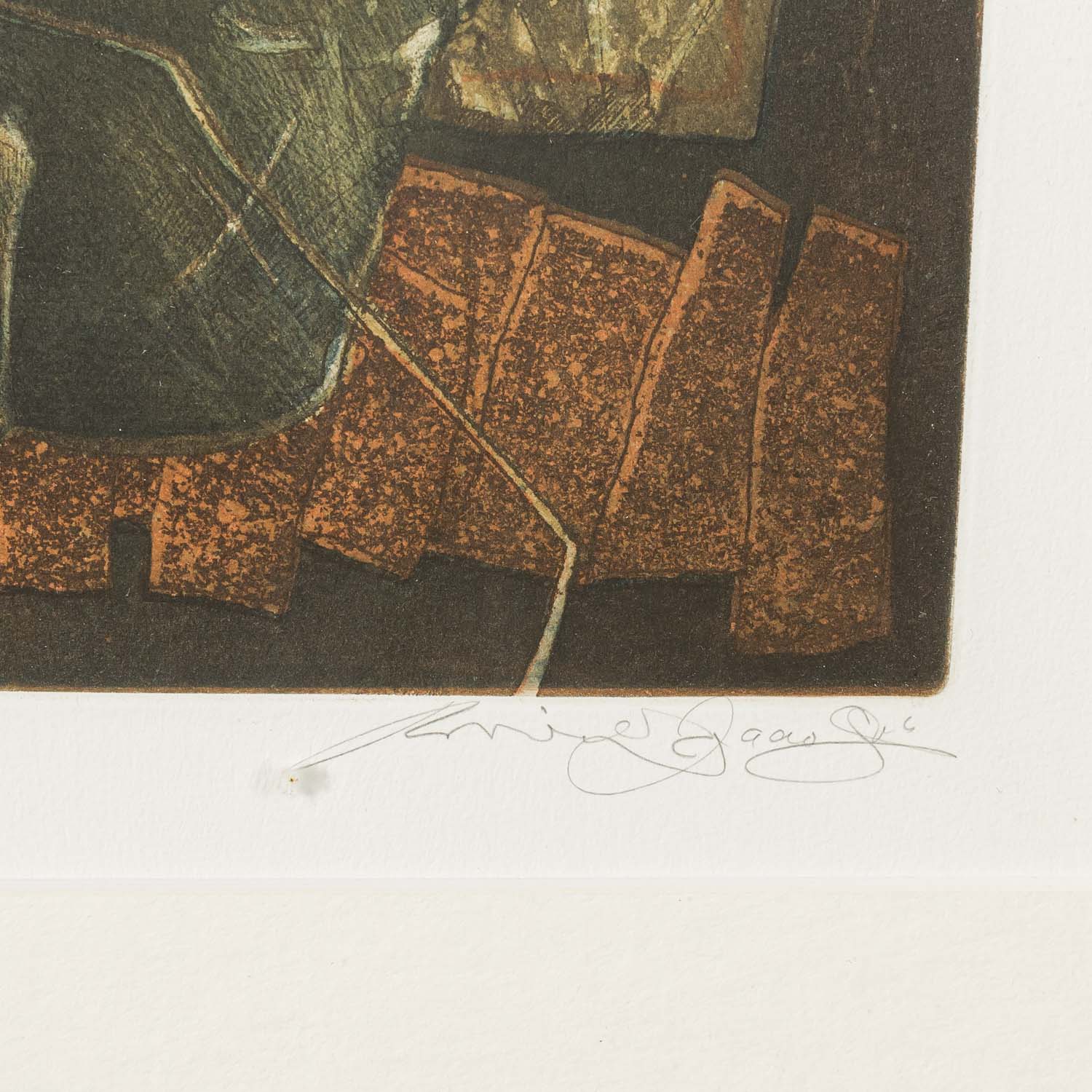 Farbaquatinta/Papier, u.re. mit Bleistift von Hand undeutlich signiert, u.li. mit Bleistift num. 52/100, HxB: Platte ca. 59x30 cm, Passepartoutausschnitt ca. 65x36 cm, Außenmaße Rahmen ca. 89x56 cm. Leichte Altersspuren. Im Passepartout hinter Glas gerahmt.