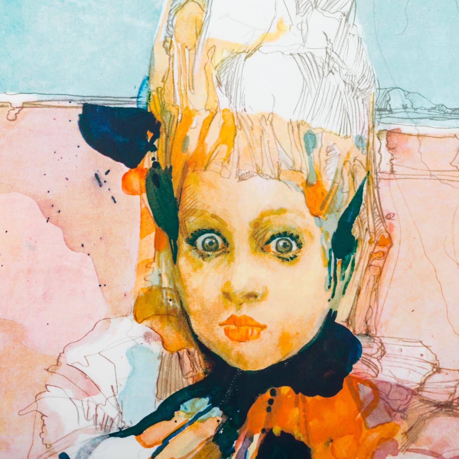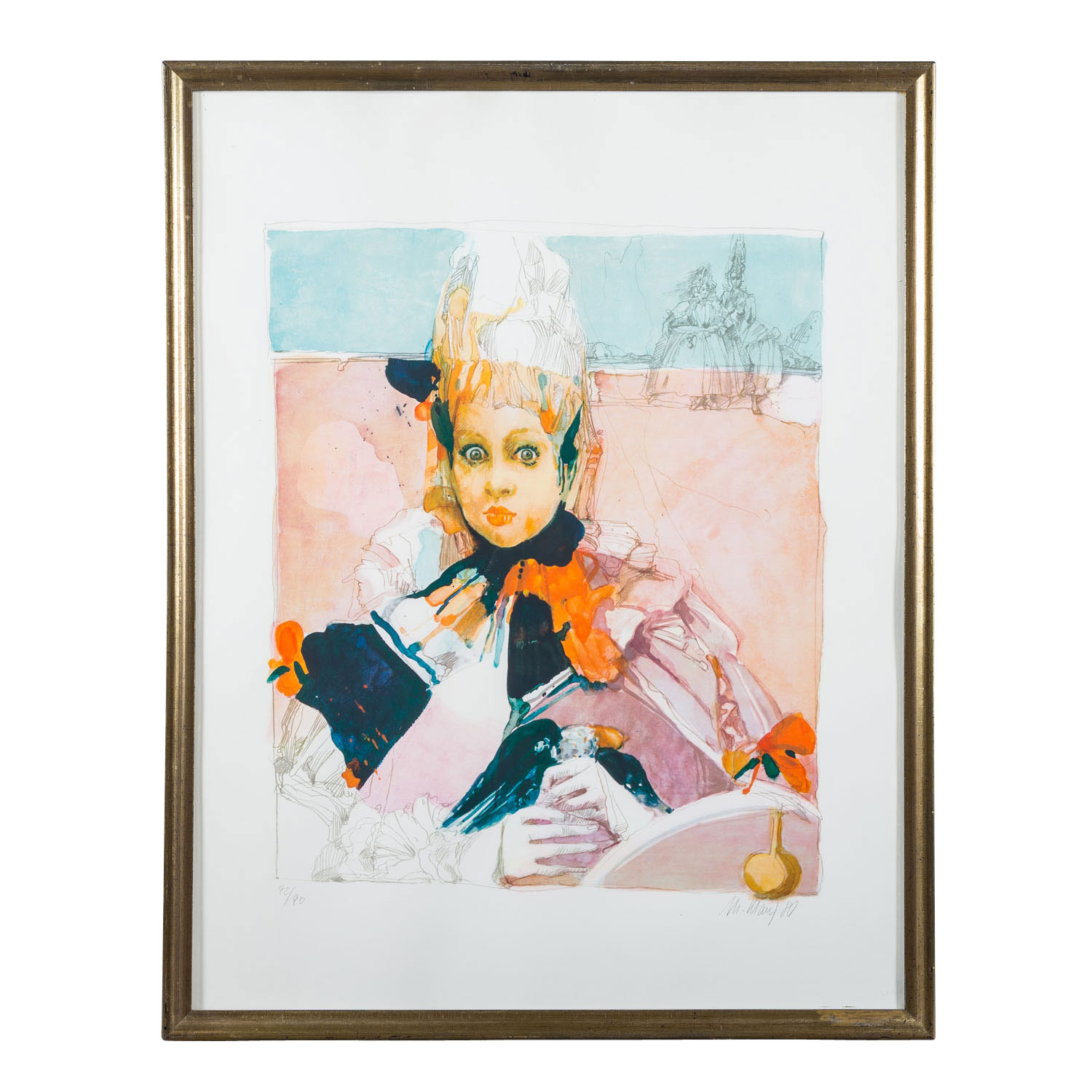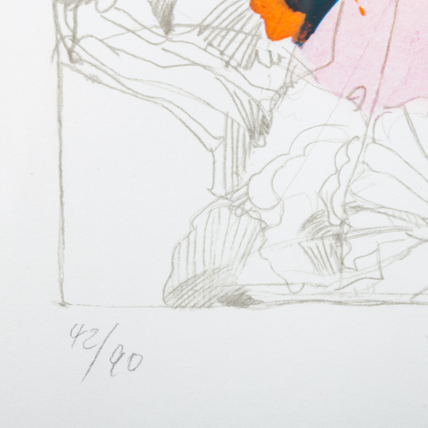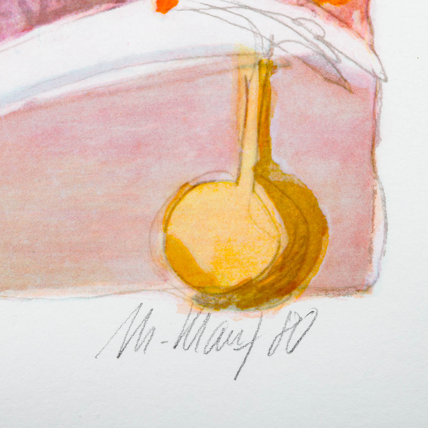 Farblithographie/Papier, u.re. mit Bleistift von Hand undeutlich signiert 'M. Marx'? und datiert (19)80, u.li. mit Bleistift num. 42/90, HxB: Platte ca. 49x41 cm, Blatt ca. 67x53 cm, Außenmaße Rahmen ca. 71x56 cm. Leichte Altersspuren. Mit verglastem Rahmen.