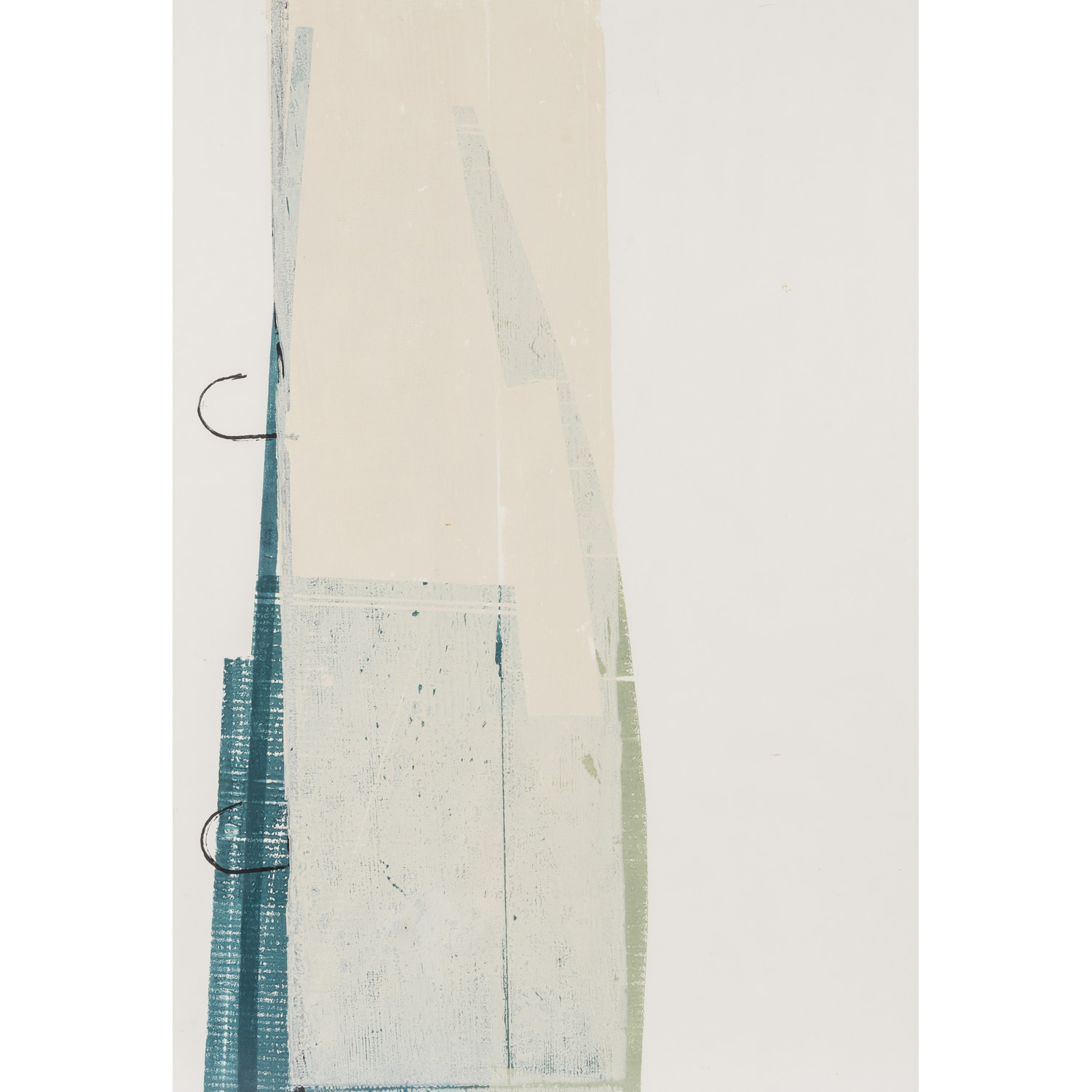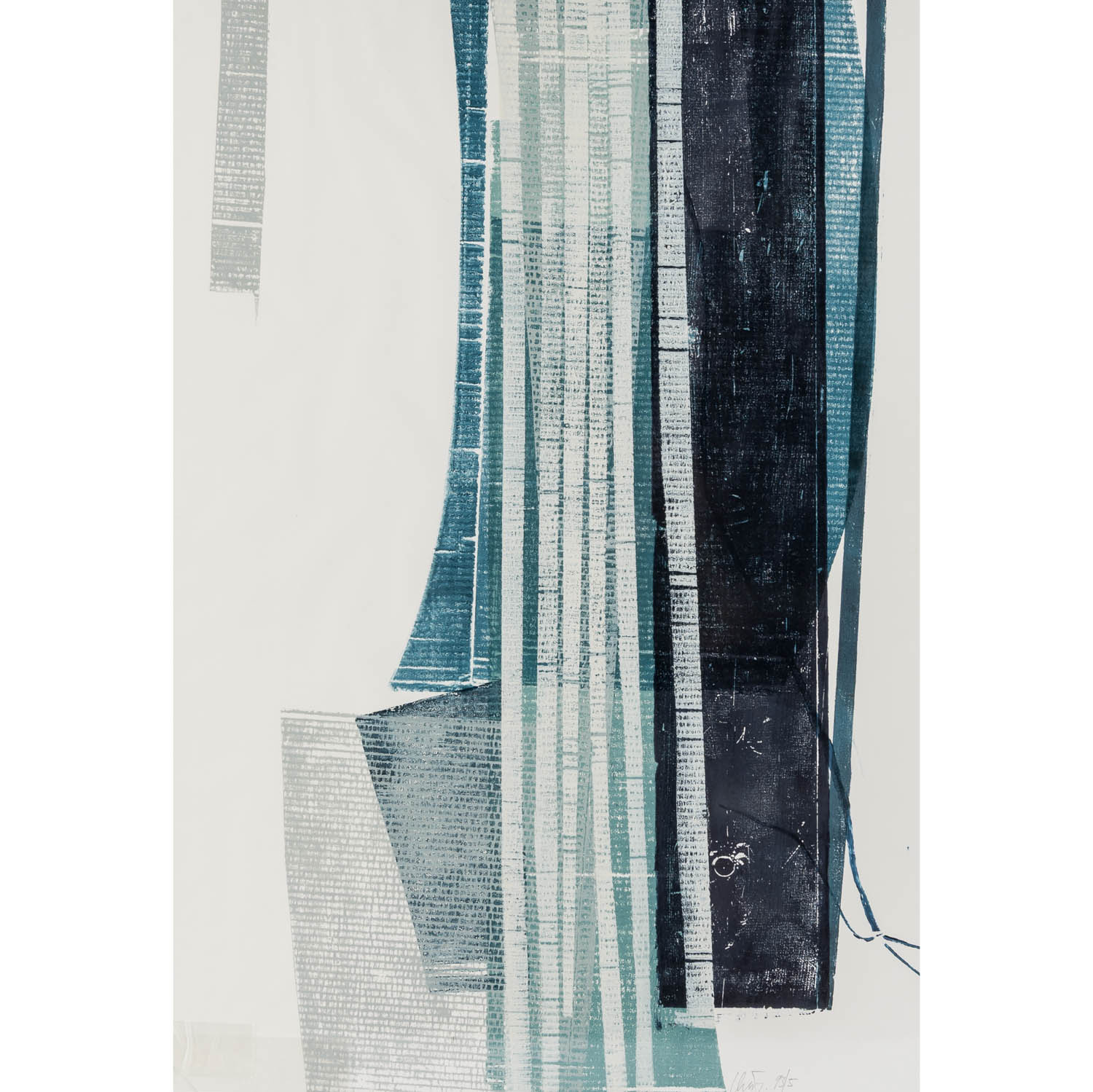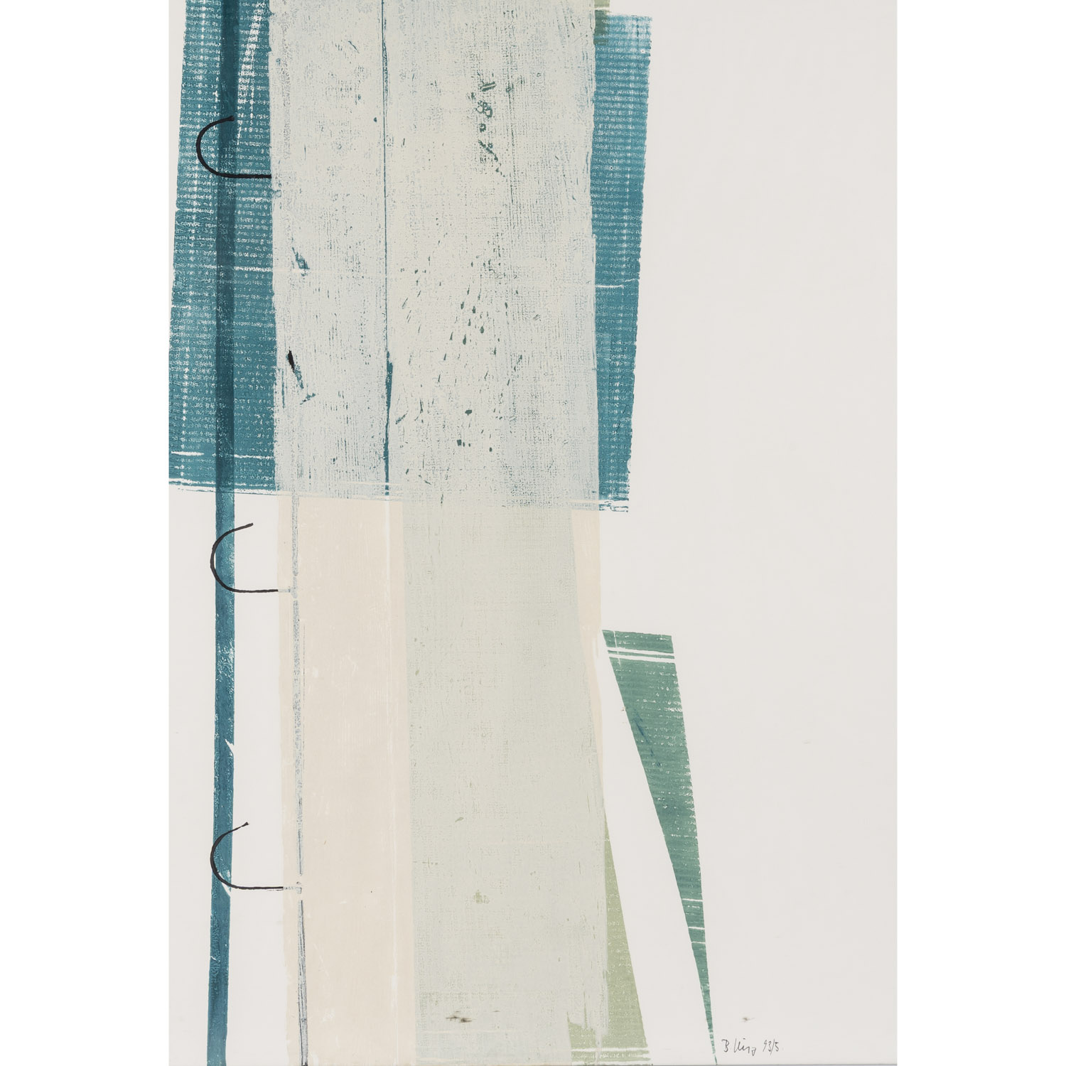 2x u.re. mit Bleistift von Hand signiert und datiert '93/5', 2x unsigniert, je Monotypie/Papier, HxB: Platte von 99,5x39,5 cm bis 99,5x64 cm, Blatt ca. 99,5x69,5 cm, Außenmaße Rahmen ca. 100,5x70 cm. Alters- und Beriebsspuren, gewellt, gebräunt, Knickspuren. Mit verglastem Rahmen (Alters- und Beriebsspuren, Gläser tlw. besch.). VERSO handschriftl. Notizen zur urspr. Hängung.