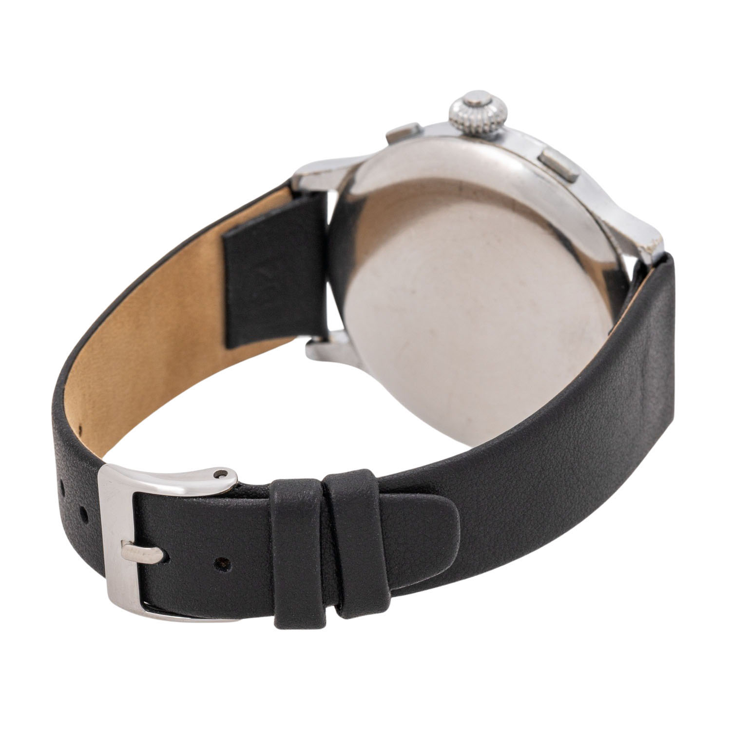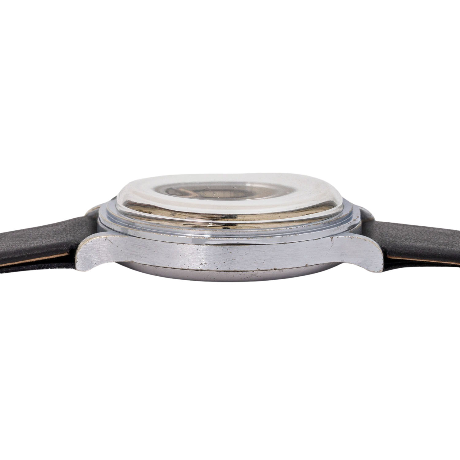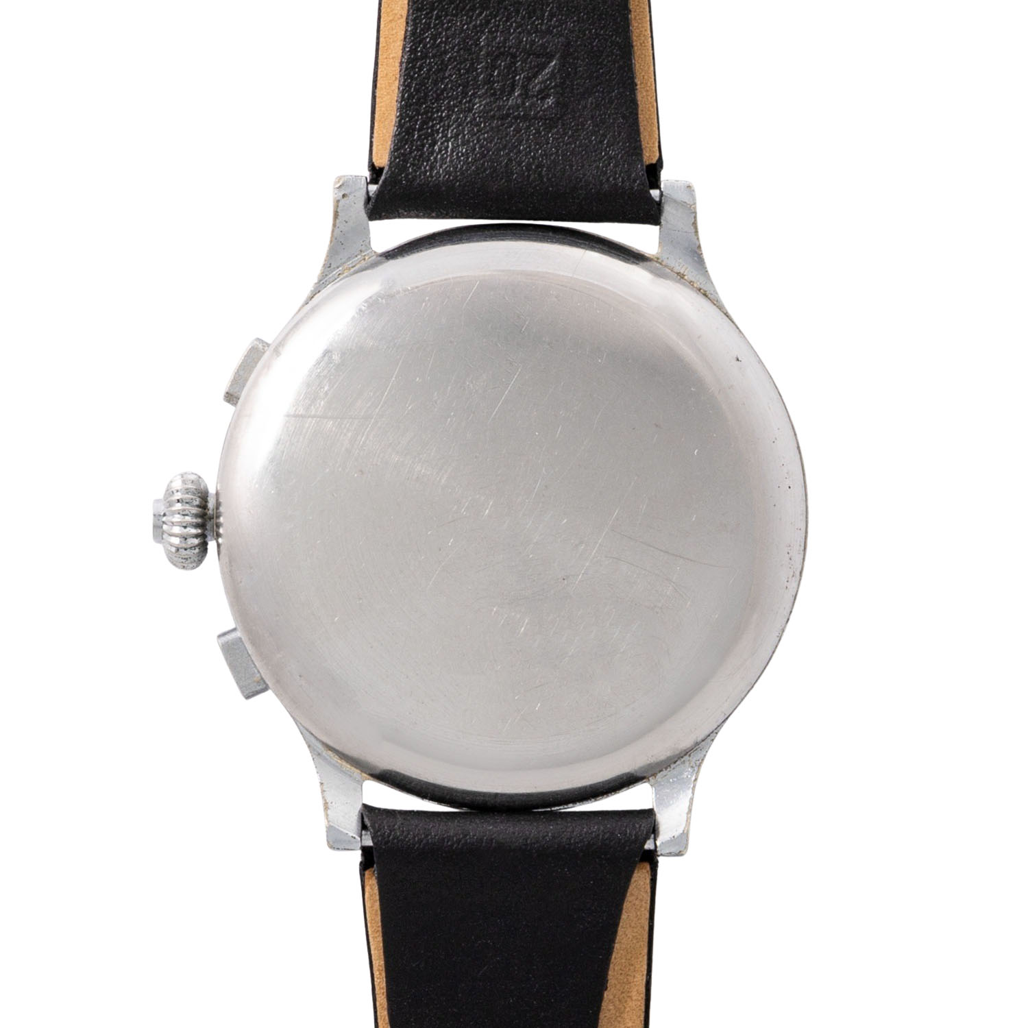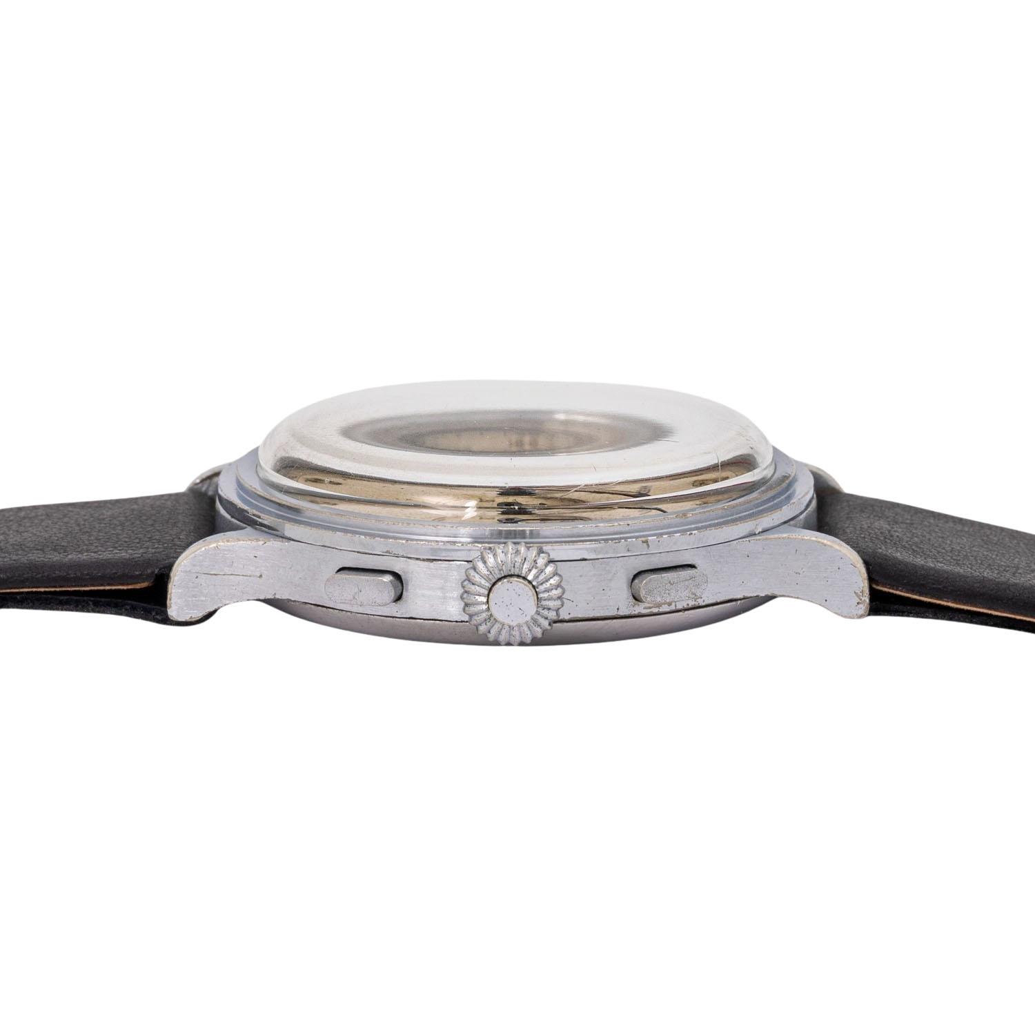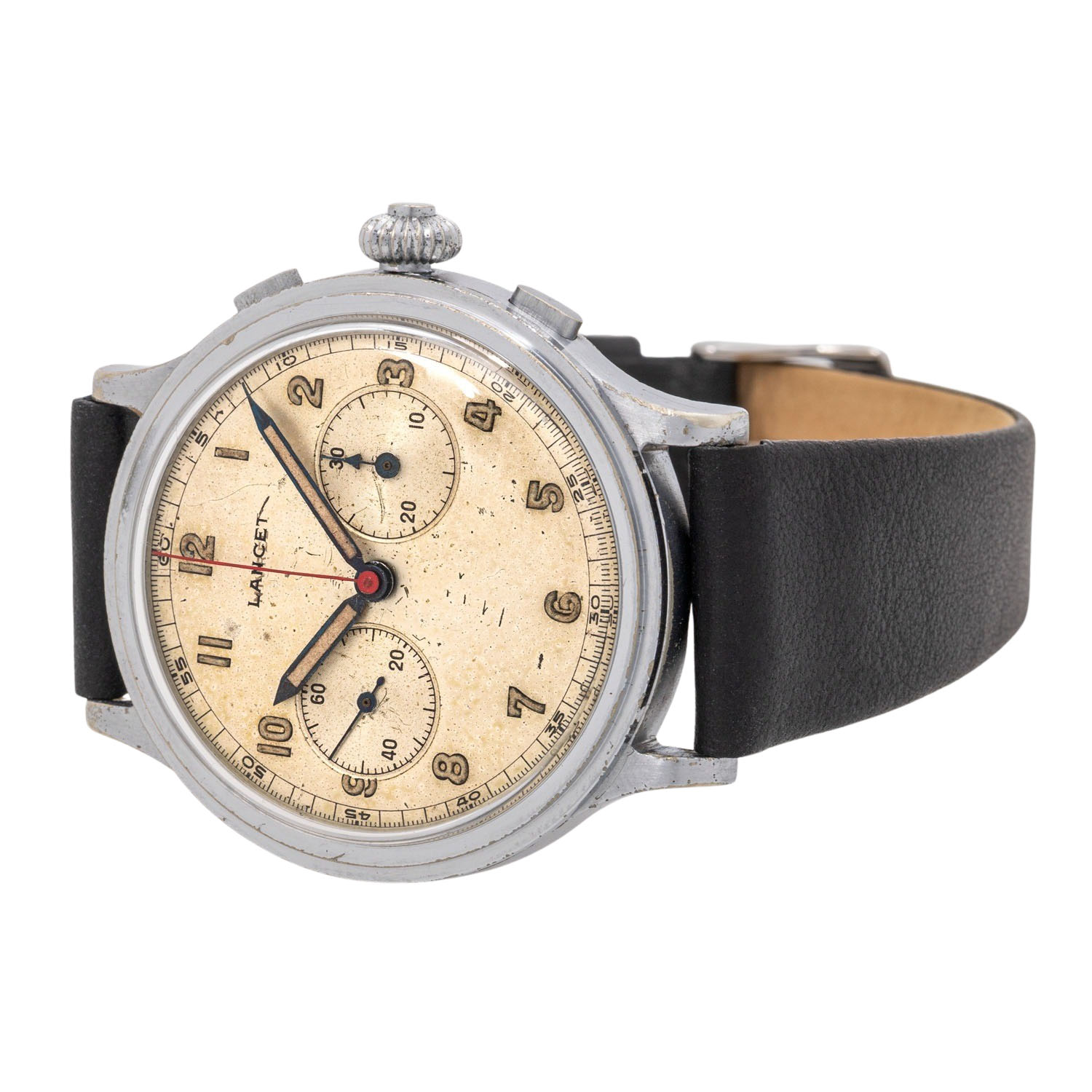 Verchromt, Seriennummer 746127. Mechanisches Werk mit Handaufzug Landeron 47 mit ausgezeichneten Gangwerten (+0 s/d, 328° Amplitude). Beiges Zifferblatt mit schöner Patina, arabischen Ziffern, zwei Hilfszifferblättern und zentraler Stoppsekunde. Neues, schwarzes Lederarmband mit Dornschließe. Gebrauchter Zustand mit Tragespuren. Durchmesser ca. 40 mm gemessen ohne Krone.