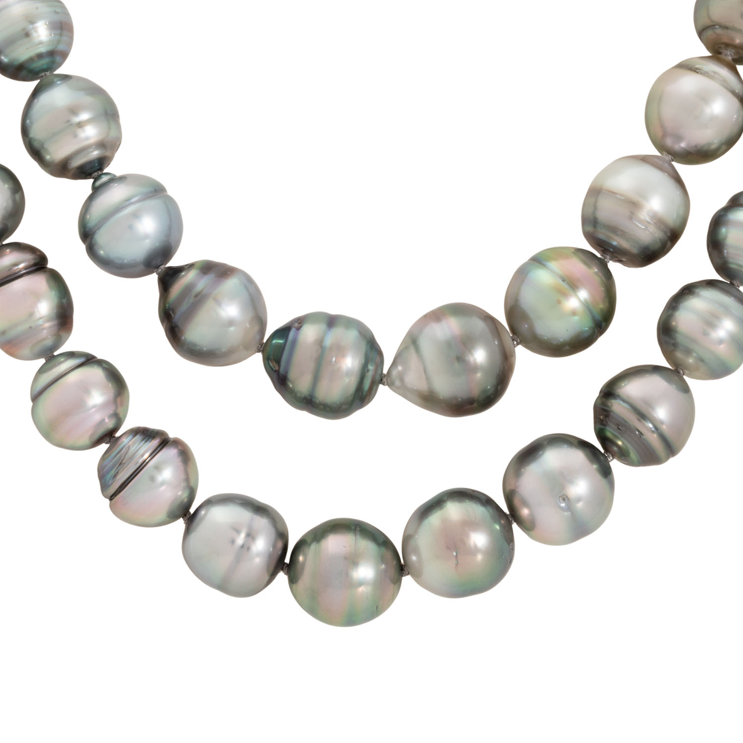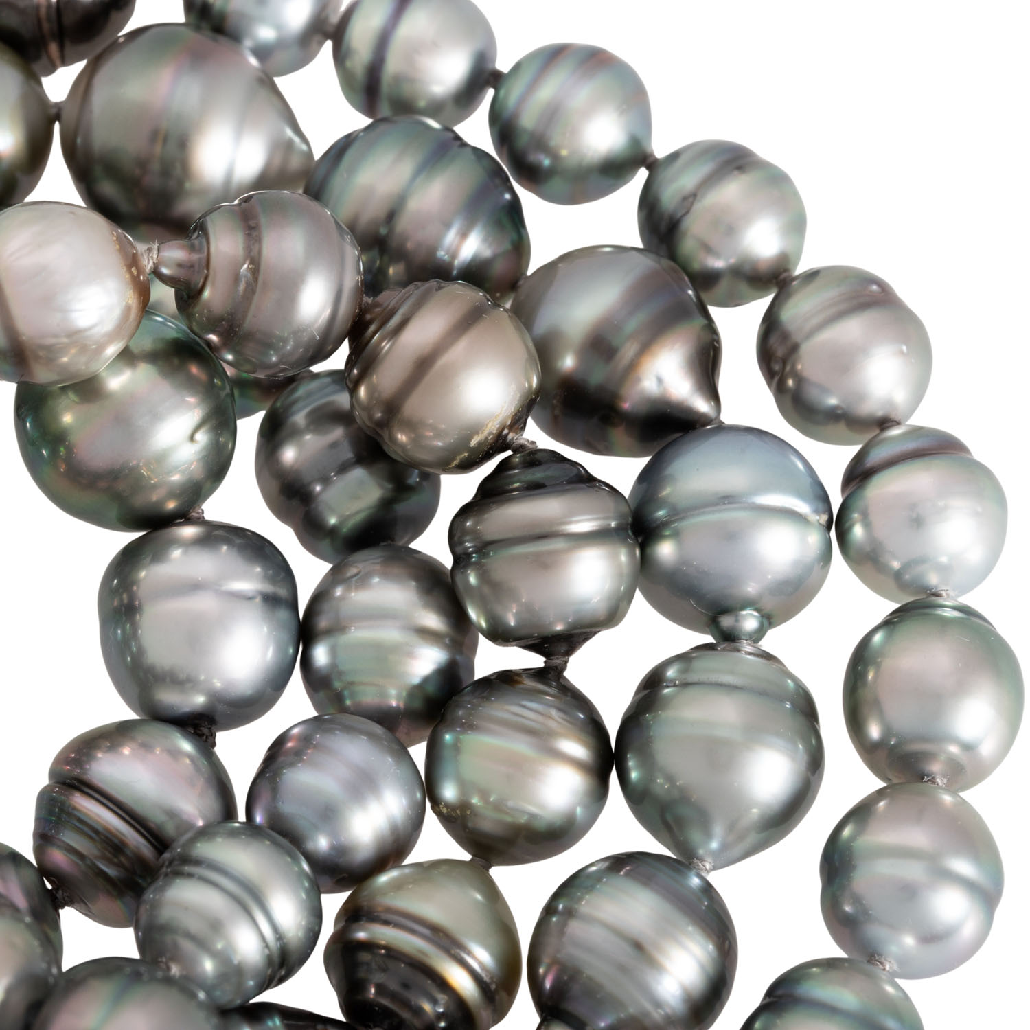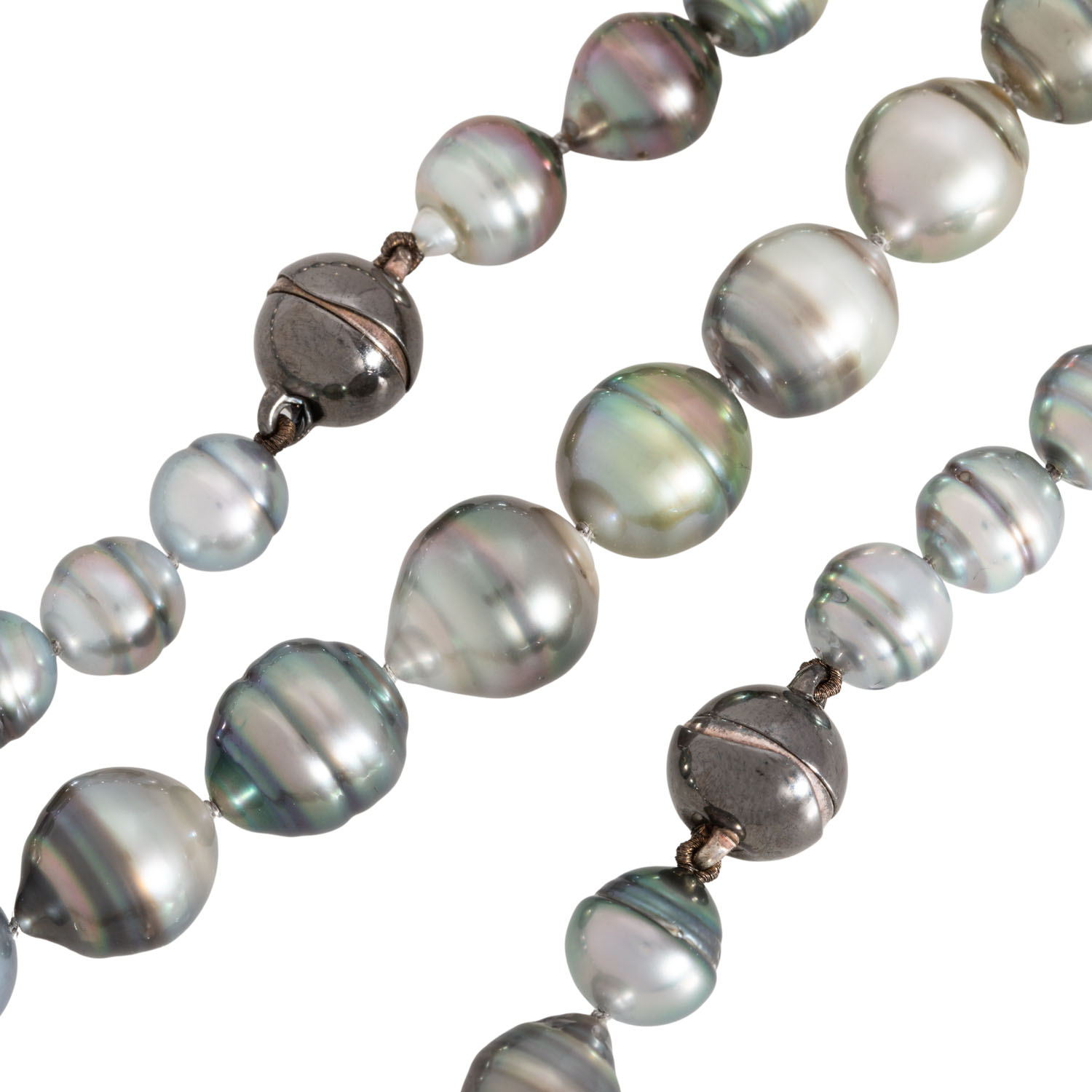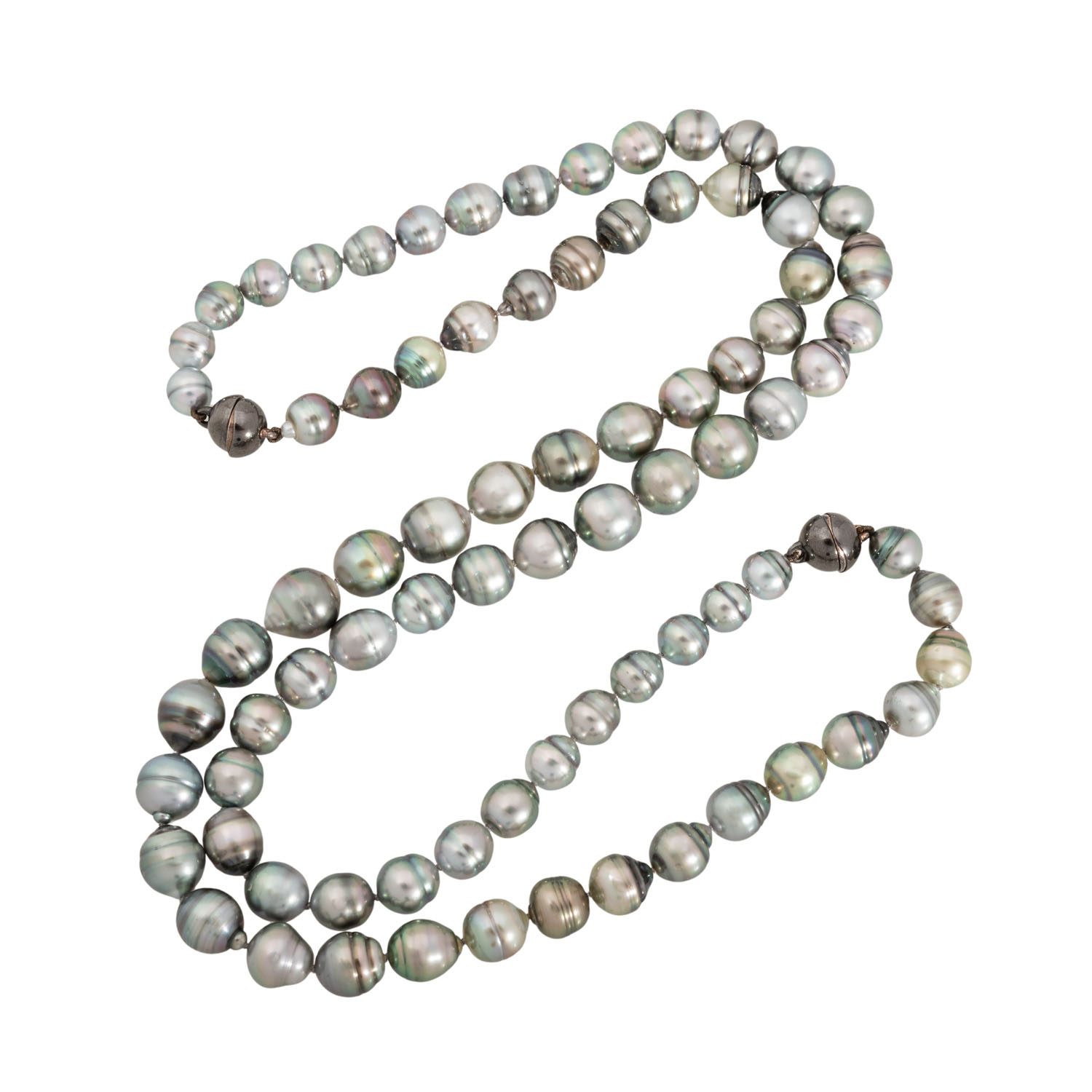 barocke Zuchtperlen ca. 9-12 mm, guter Lüster, tlw. grün/violetter Oberton, 2 Magnetschließen aus Silber, Länge: 92 cm, 21. Jh., guter Zustand. Kette kann getrennt und als 2 kurze Ketten getragen werden.