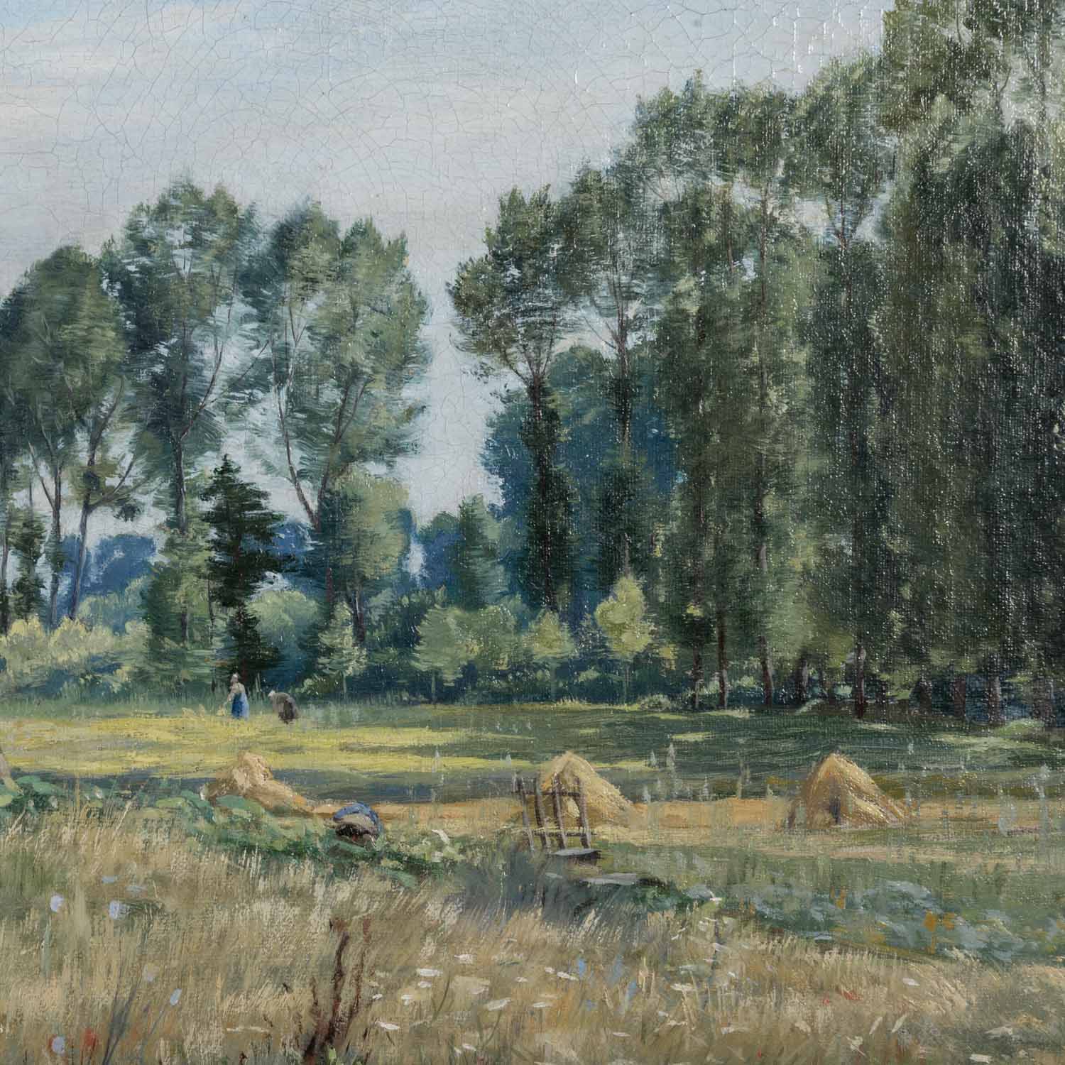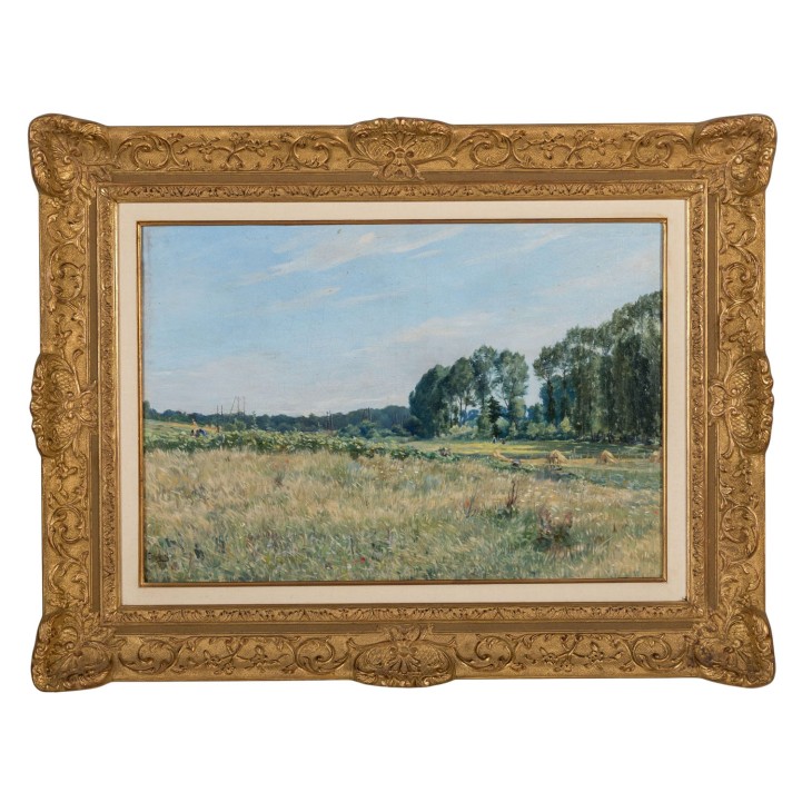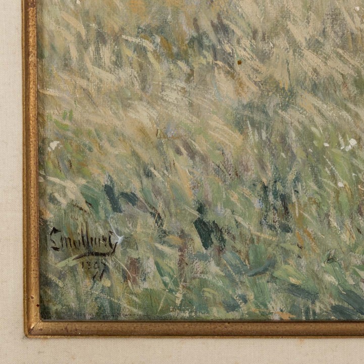 LE MEILLEUR, GEORGES (also LEMEILLEUR, 1861-1945), ‘Landscape’, with summer meadows in bloom and flowers, signed and dated “Lemeilleur 1897” lower left, oil on canvas, HxW: approx. 42x61 cm (64x82 cm with frame). Signs of age and wear, craquelure, minimal stains. With ornate frame. PROVENANCE: Galerie du Léthé, Paris (label on reverse and copy of invoice enclosed).