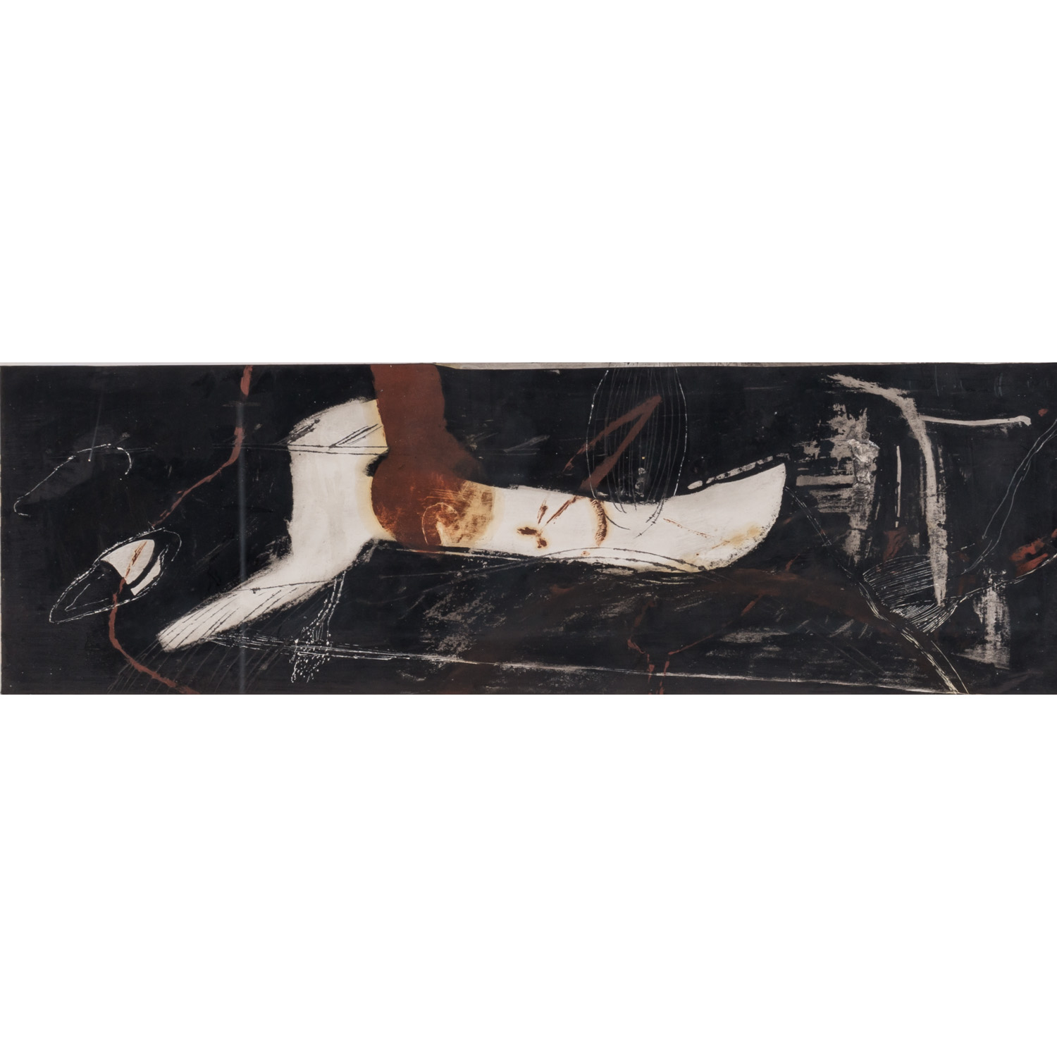 1.) LEONHARDT, TOM, 'o. T.', o.re. signiert und datiert 199. (letzte Ziffer undeutlich), auf der Rückseite bezeichnet und auf der Unterlagenpapierrückseite mit Bleistift gewidmet, datiert und bezeichnet, Mischtechnik/Papier auf Papier montiert (Montur lose), HxB: ca. 16x51 cm; 2.) KÜNSTLER/IN 20./21. Jh., ohne Titel, Mischtechnik, im Passepartout montiert, HxB: Passepartoutausschnitt ca. 29x20,5 cm. Je Altersspuren. Je mit verglastem Rahmen (Außenmaße ca. 51x71 cm und 51x39 cm).
