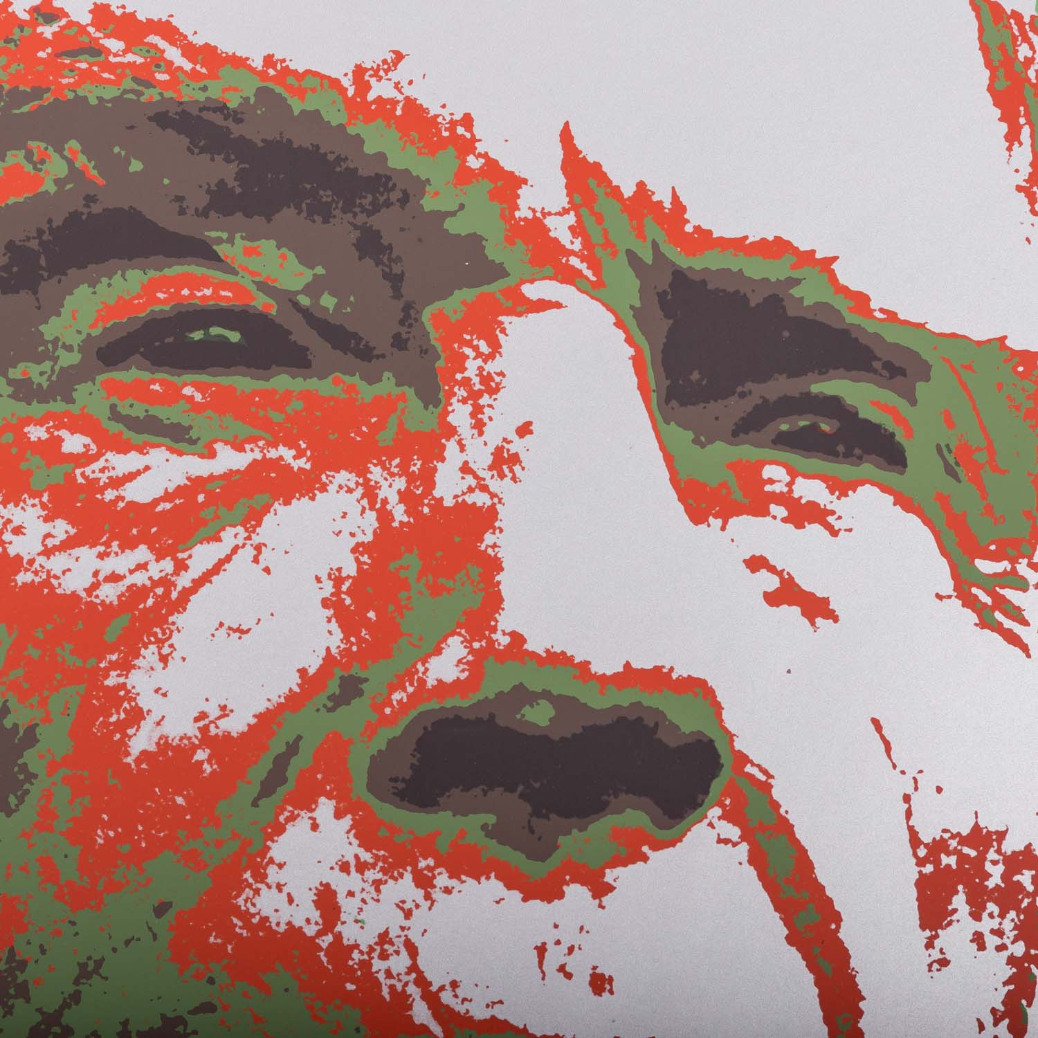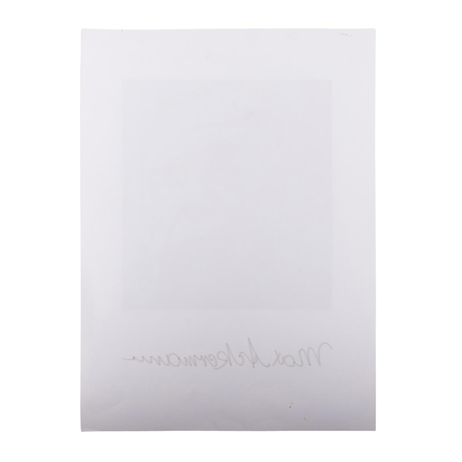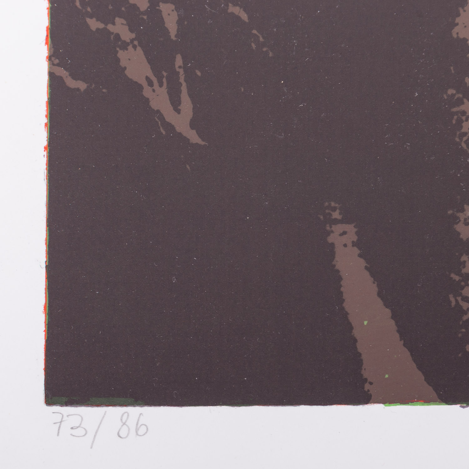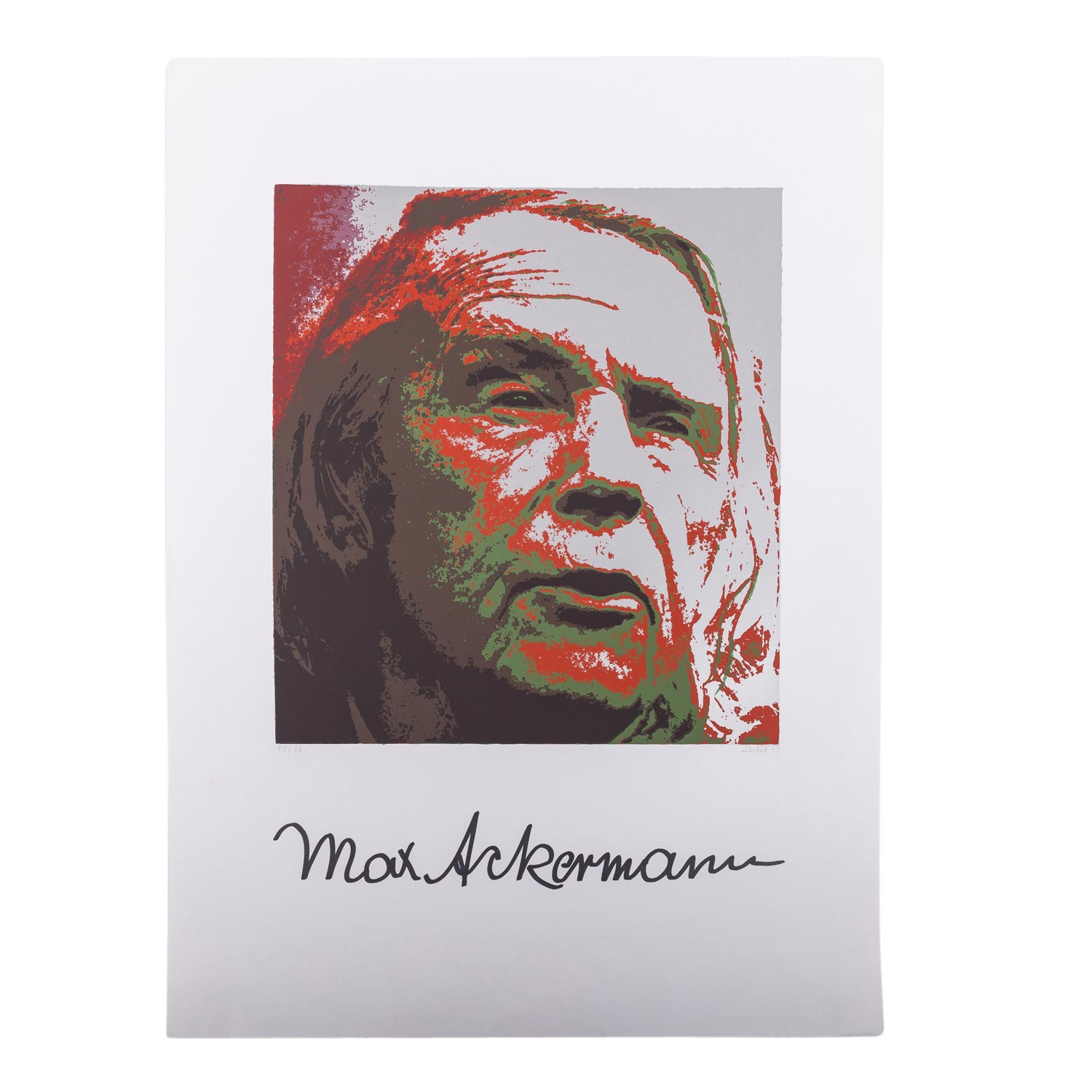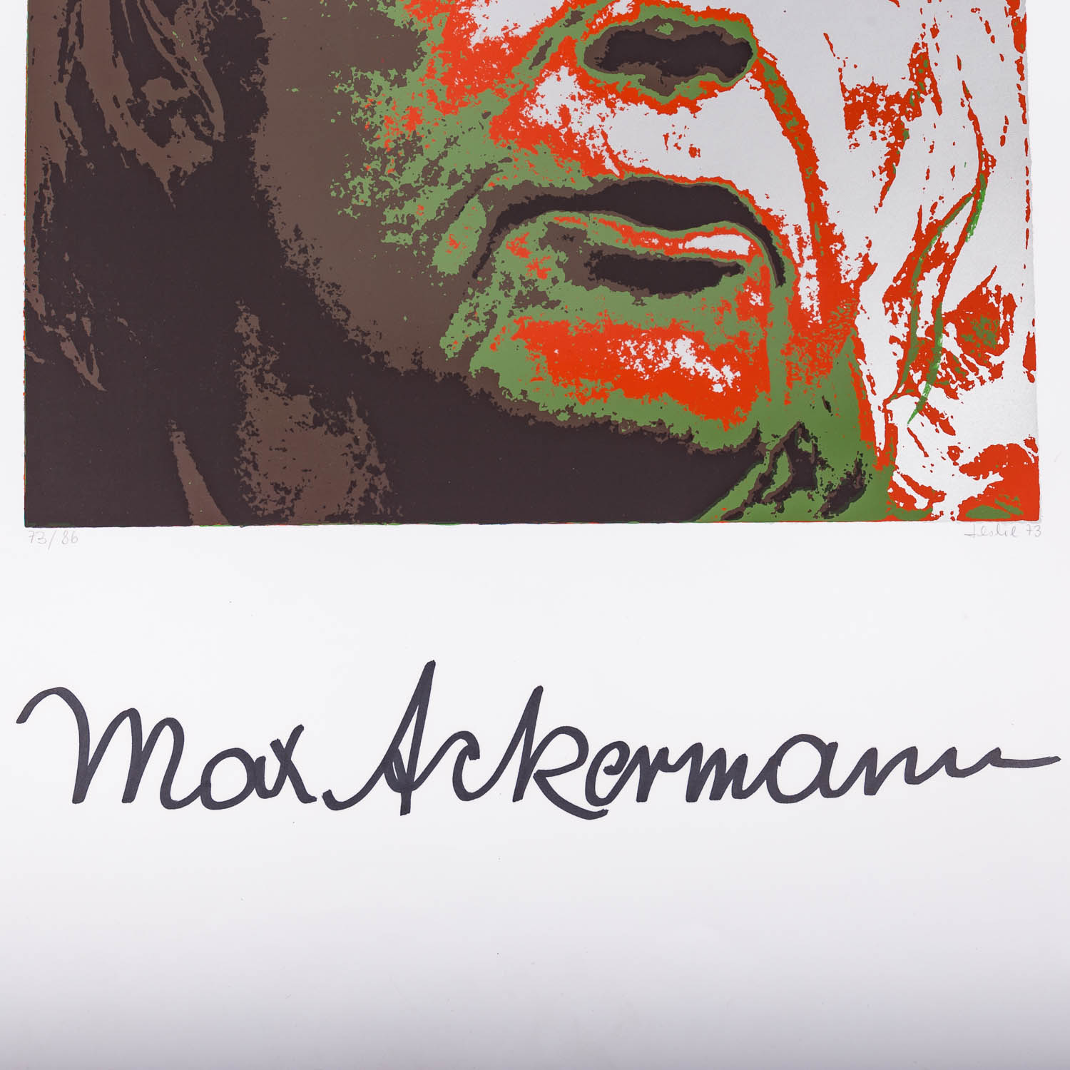 Portrait des Künstlers vor silberfarbenem Hintergrund, Farbsiebdruck/Papier, u.re. mit Bleistift von Hand signiert und datiert (19)73, u.li. mit Bleistift num. 73/86, darunter Schriftzug 'Max Ackermann', HxB: Platte ca. 43x39 cm, Blatt ca. 75x55 cm. Altersspuren, obere Bildkante minimal eingerissen.