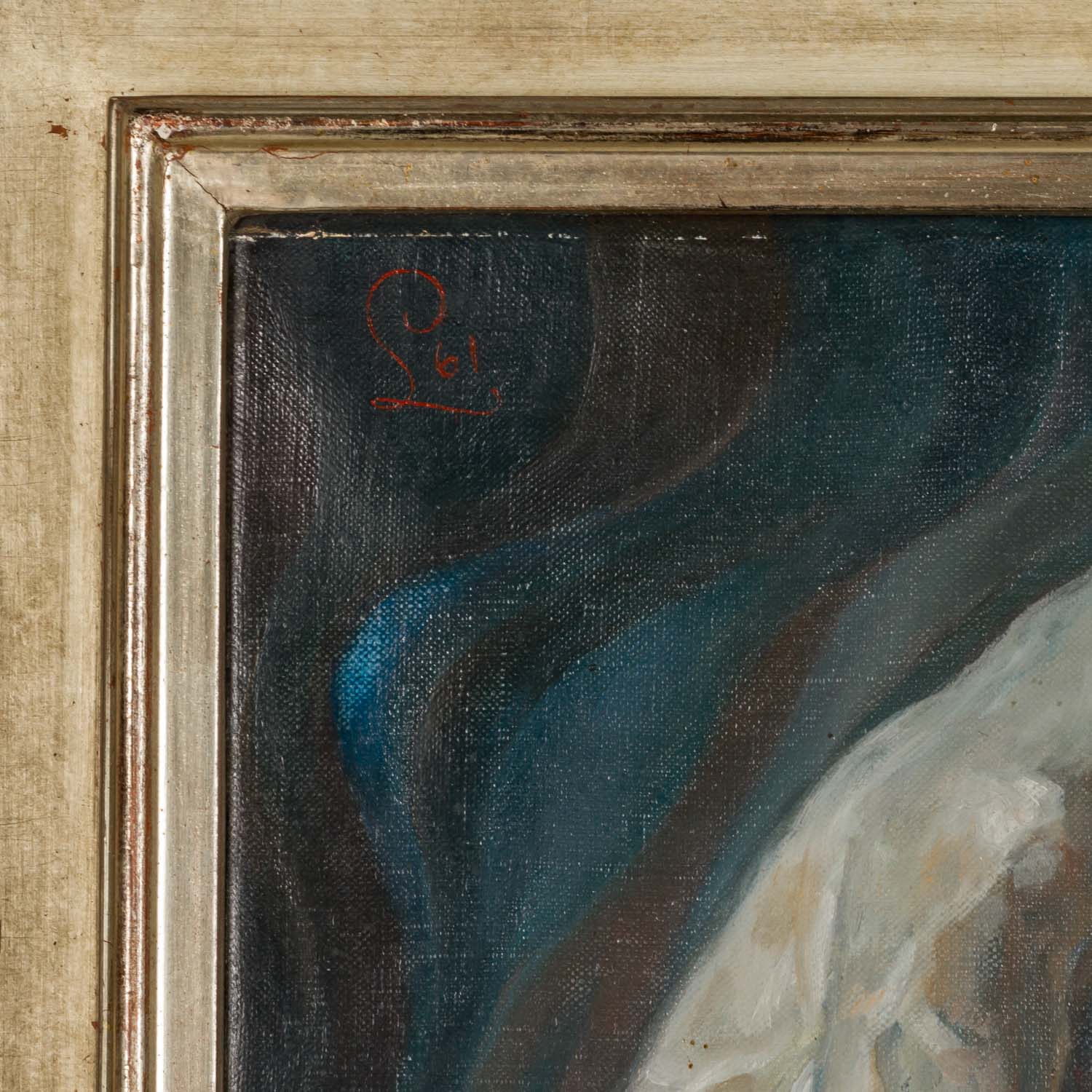 oben links monogrammiert und datiert: 'L 61'. Öl auf Leiwand, HxB: ca. 55 x 51 cm (HxB Rahmen: ca. 81 x 75,5 cm). Alters- und Beriebsspuren, minimale Farbfehlstellen, Leinwand leicht wellig. Mit Rahmen (Altersspuren). Anmerkung: Der Künstler ist für seine großformatigen Skulpturen im öffentlichen Raum wie beispielsweise die Bronze 'Denkpartner', 1980, Stuttgart, Börsenplatz, bekannt.