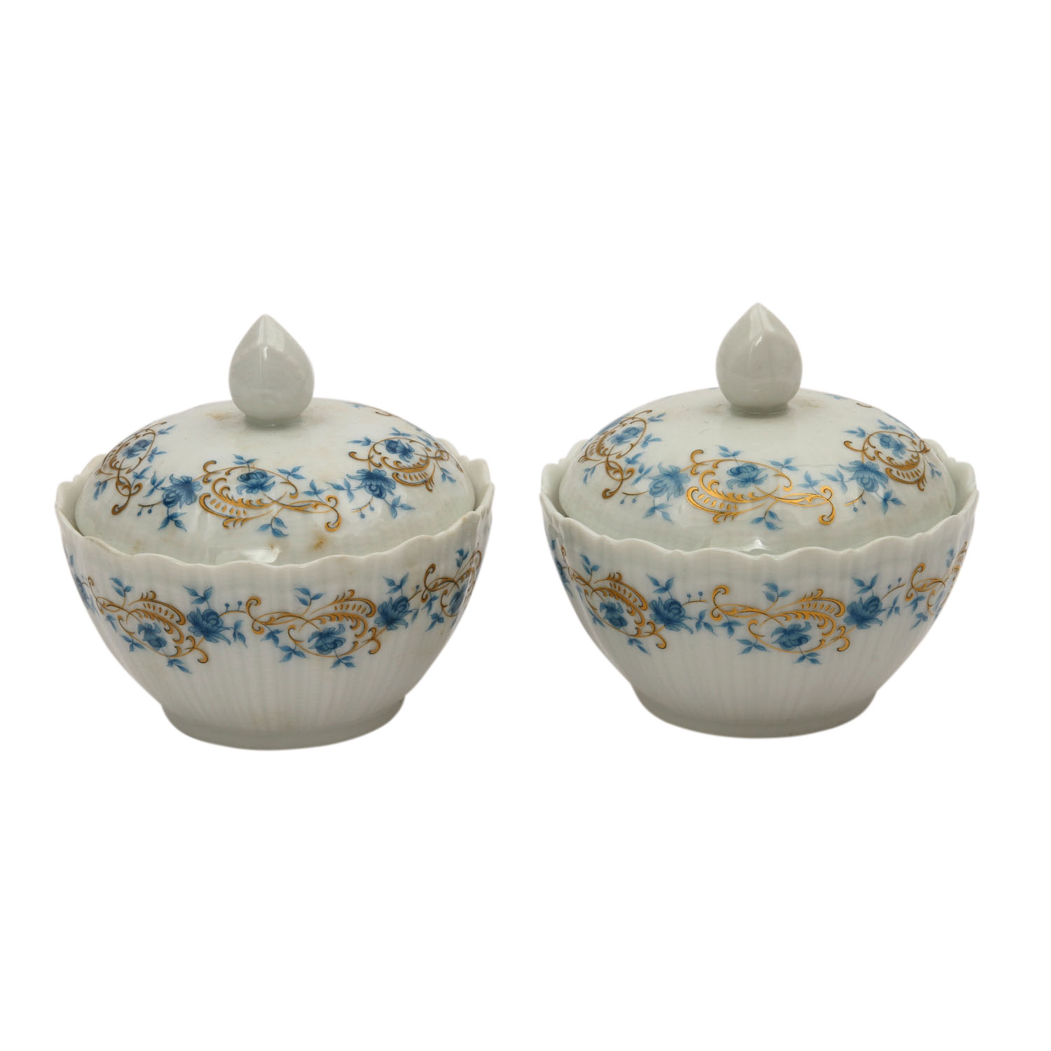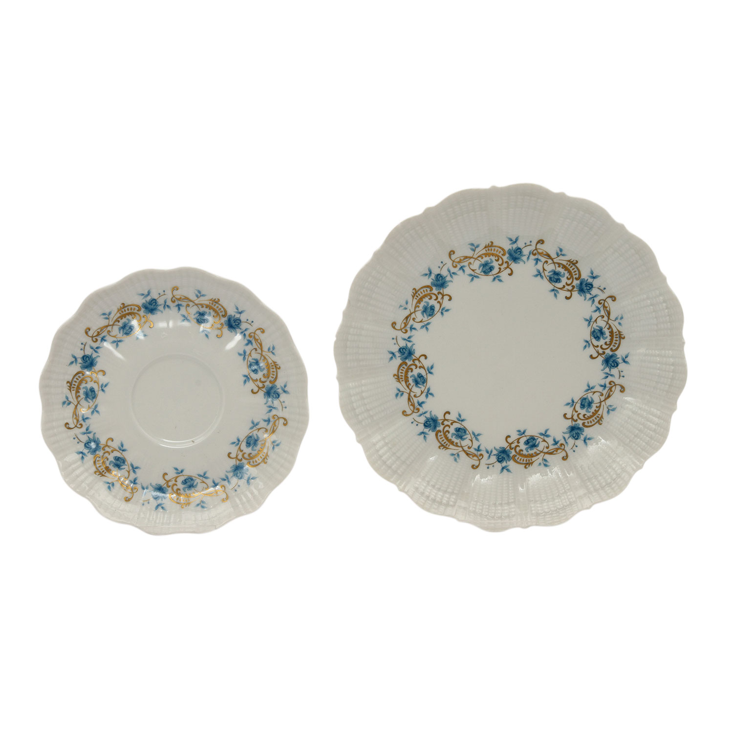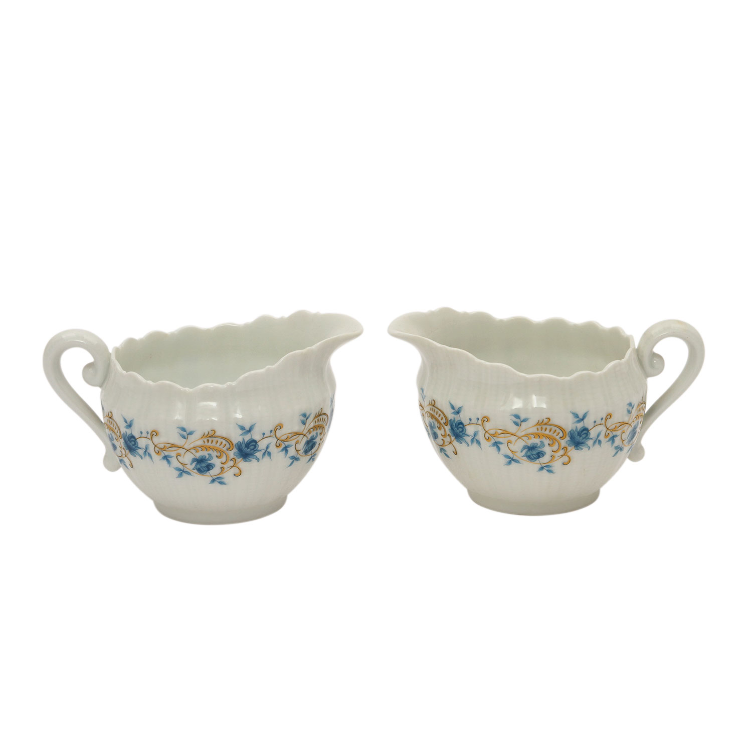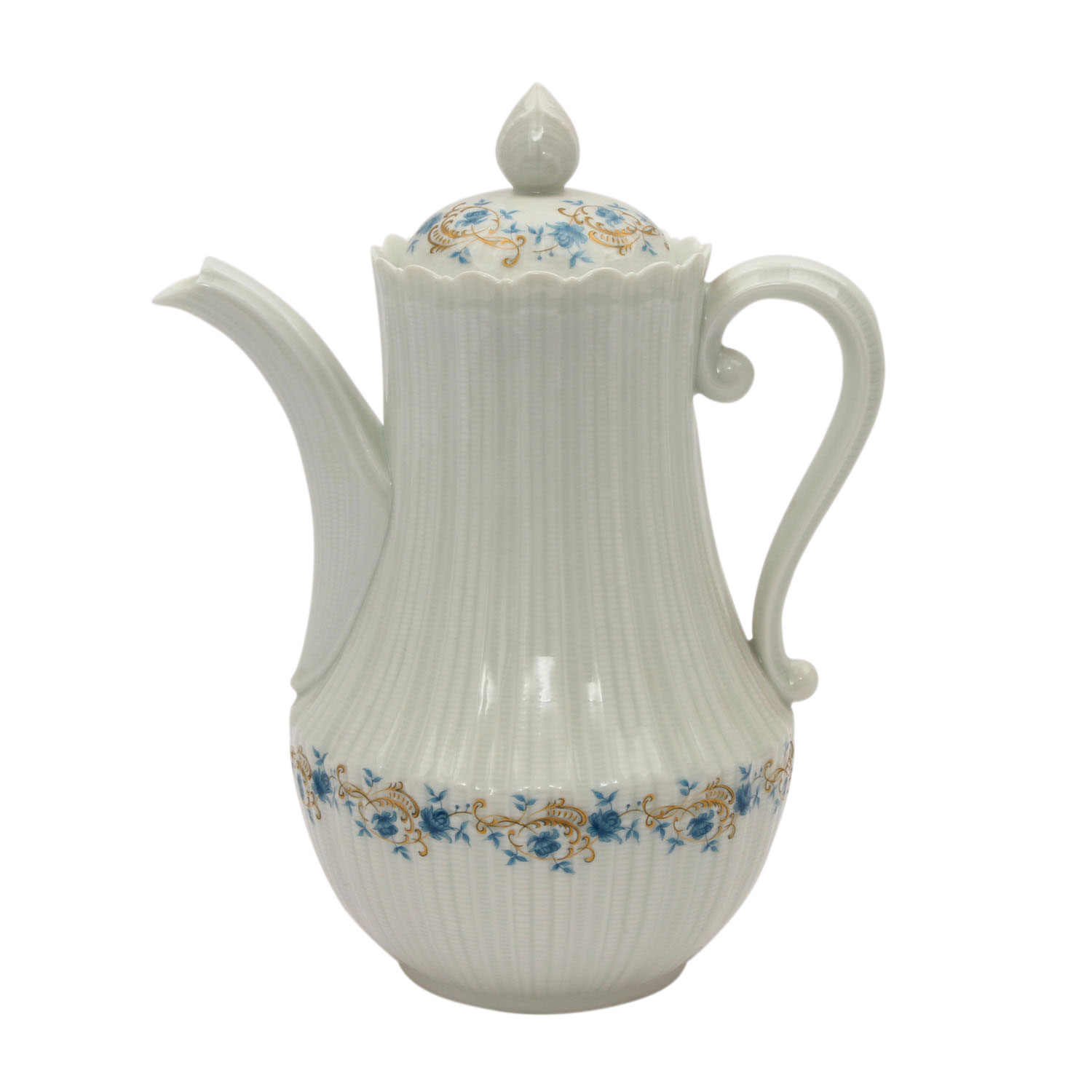 LIMOGES Kaffeeservice f. 12 Personen, 20. Jhd. Weißporzellan mit muschelartigem Reliefdekor und blauem und goldfarbenem Rosenrankwerk, bestehend aus 12 Kaffeetassen/U-Tassen (1x beschädigt), 12 Kuchentellern (3x besch.), 1 Kaffeekanne, 2 Zuckerdosen und 2 Sahnekännchen. Alters- und Gebrauchsspuren.