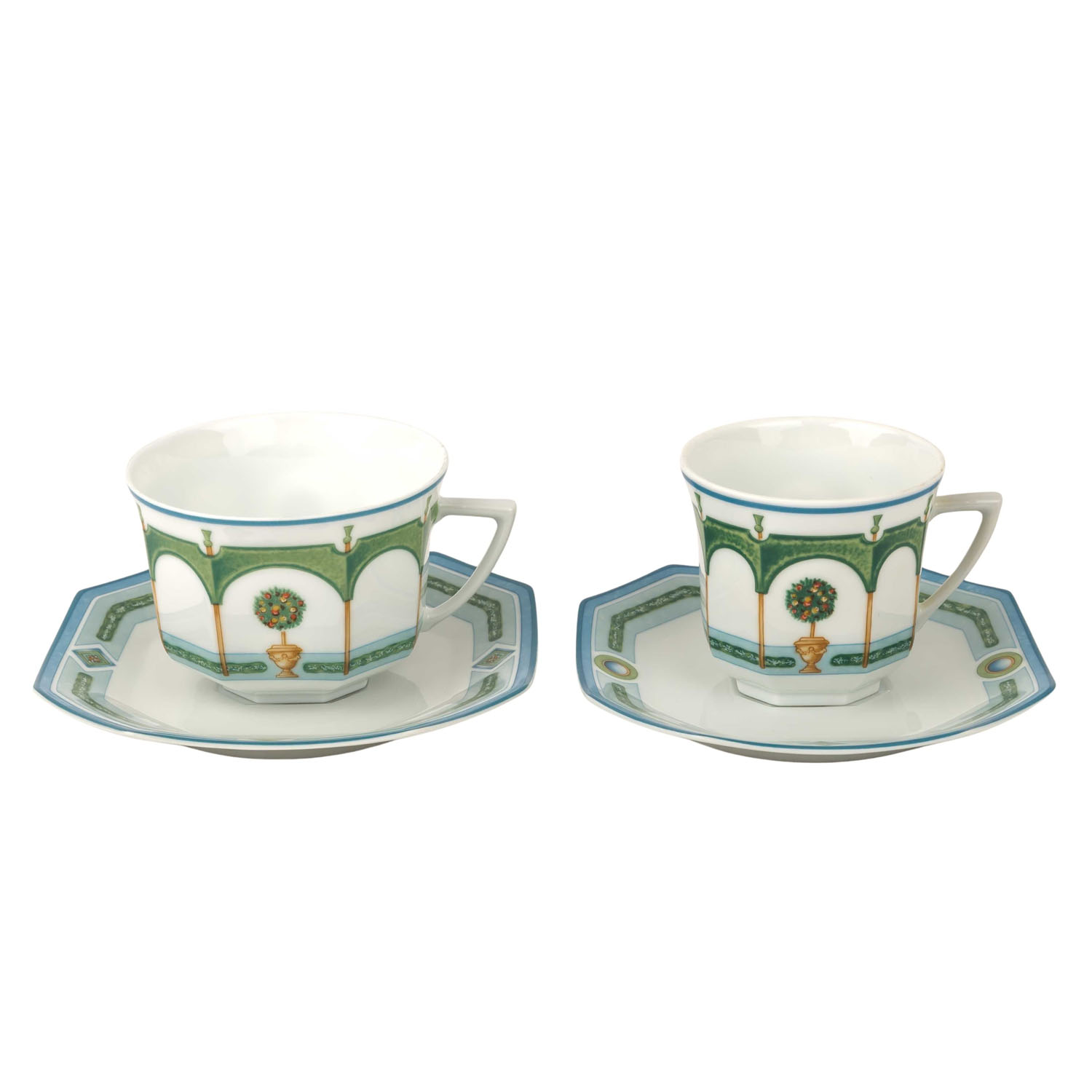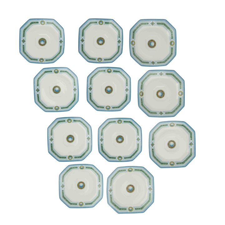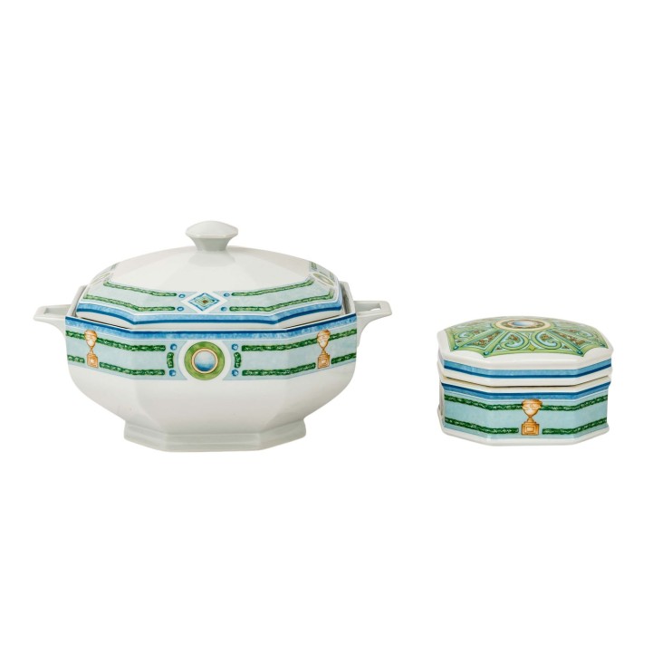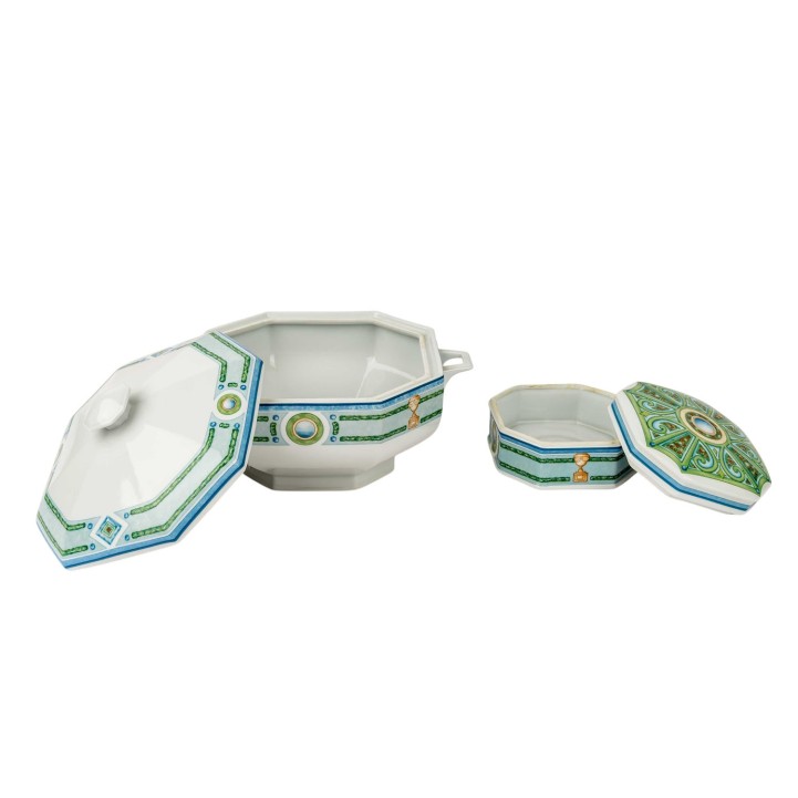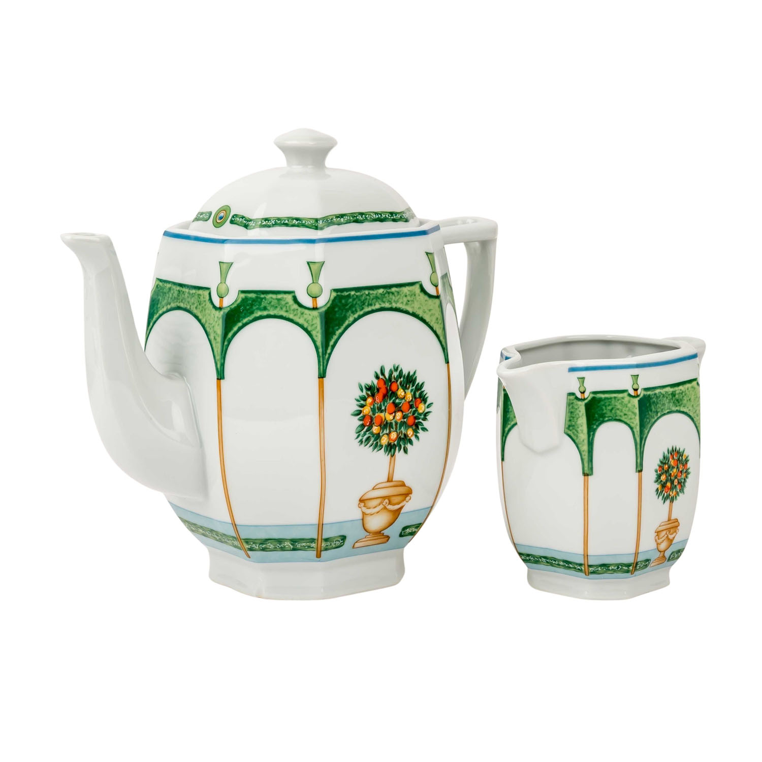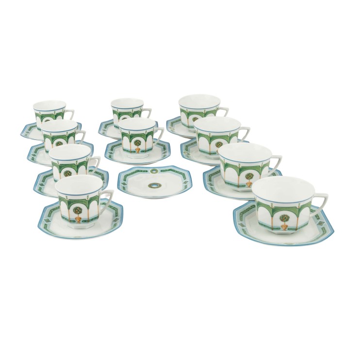 Weißporzellan mit farbenfrohem Dekor, inspiriert von den Gärten Versailles, achteckige Formen, insgesamt 47 Teile, bestehend aus 6 Speiseteller, L 24 cm; 6 Salatschalen, L 18 cm; 1 Platte, L 38, 5 cm; 1 Deckelterrine, L 21, 5 cm; 1 Kaffeekanne (Chip am Standring), H 18, 5 cm; 7 Kaffeetassen mit 7 Untertellern, 4 Teetassen mit 4 Untertellern, 6 Kuchenteller, D 20 cm, 1 Milchgießer, H 9 cm; 1 Zuckerdose, L 9, 5 cm; 1 Keksdose, L 12, 5 cm sowie 1 Aschenbecher, L 12 cm. Leichte Gebrauchsspuren.