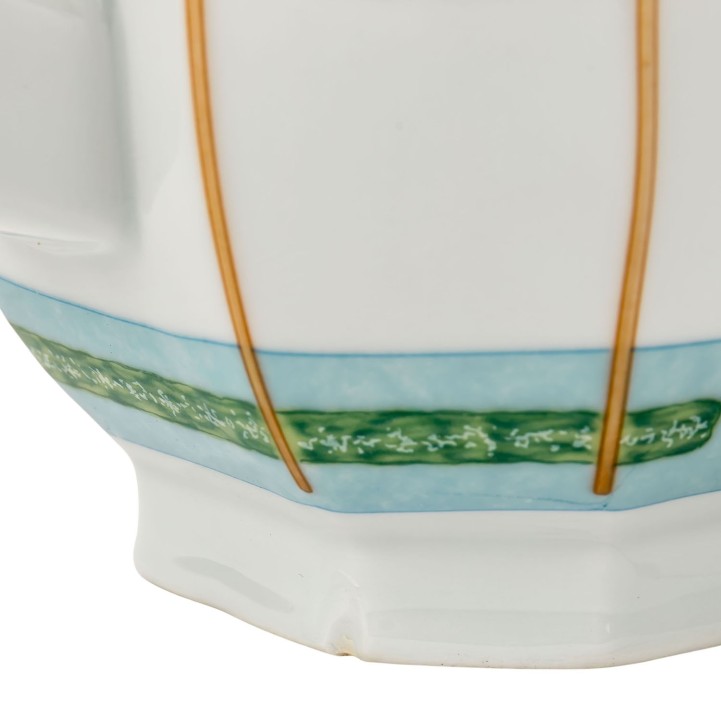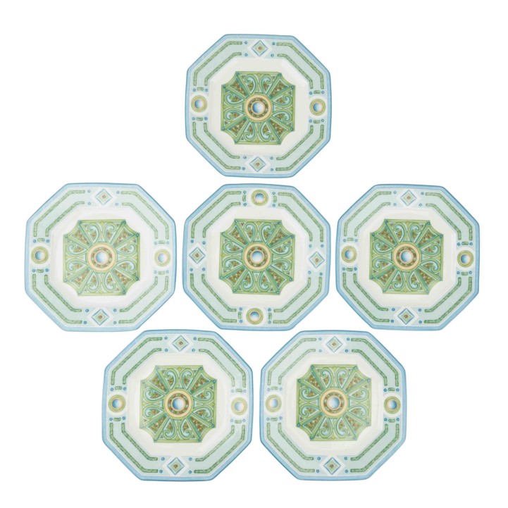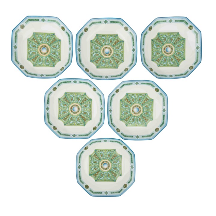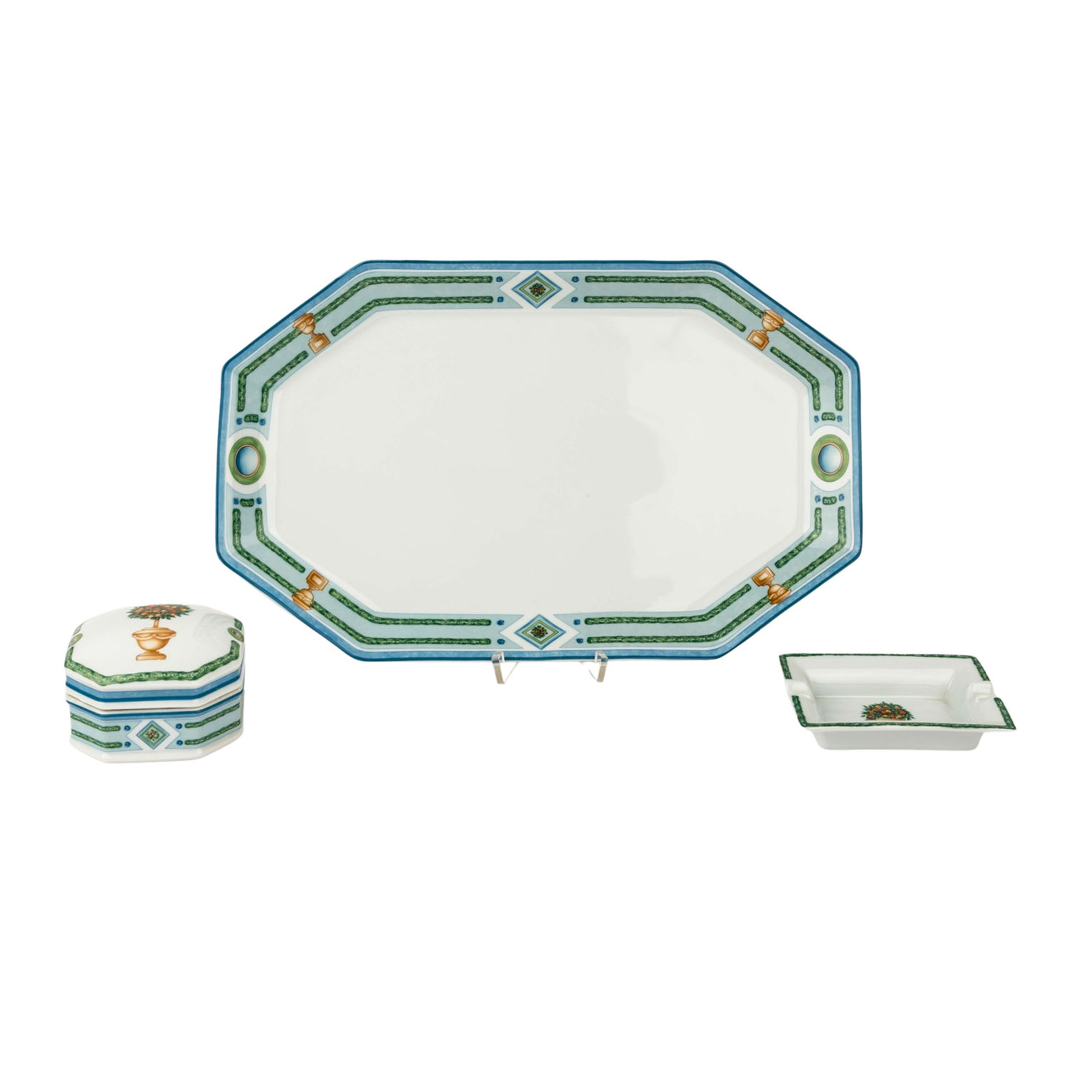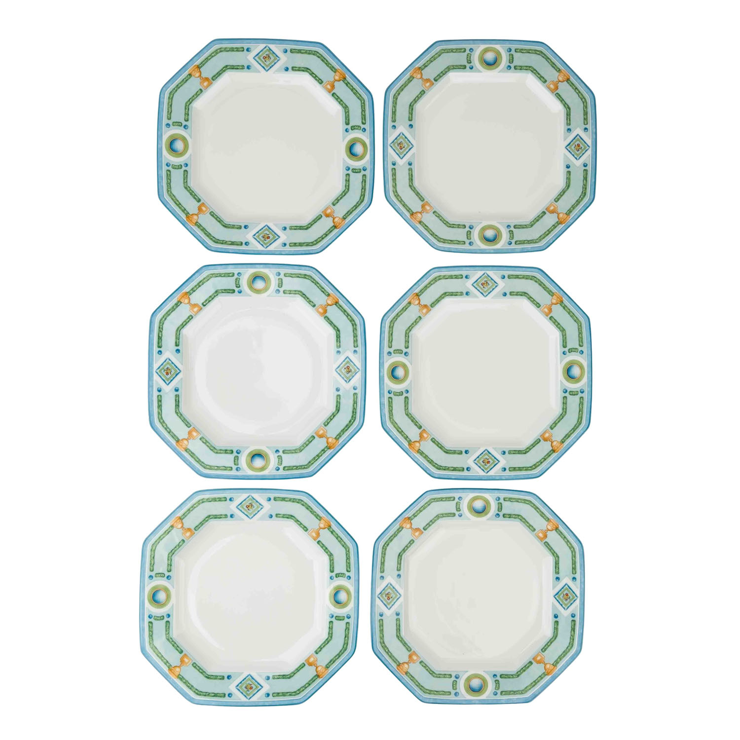 Weißporzellan mit farbenfrohem Dekor, inspiriert von den Gärten Versailles, achteckige Formen, insgesamt 47 Teile, bestehend aus 6 Speiseteller, L 24 cm; 6 Salatschalen, L 18 cm; 1 Platte, L 38, 5 cm; 1 Deckelterrine, L 21, 5 cm; 1 Kaffeekanne (Chip am Standring), H 18, 5 cm; 7 Kaffeetassen mit 7 Untertellern, 4 Teetassen mit 4 Untertellern, 6 Kuchenteller, D 20 cm, 1 Milchgießer, H 9 cm; 1 Zuckerdose, L 9, 5 cm; 1 Keksdose, L 12, 5 cm sowie 1 Aschenbecher, L 12 cm. Leichte Gebrauchsspuren.