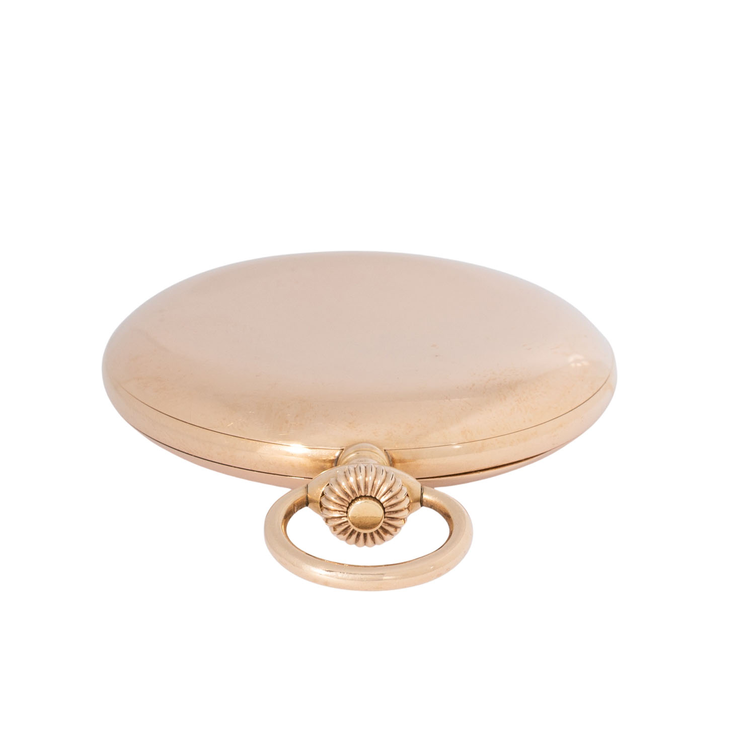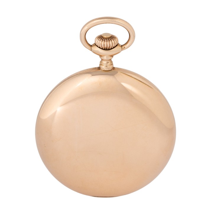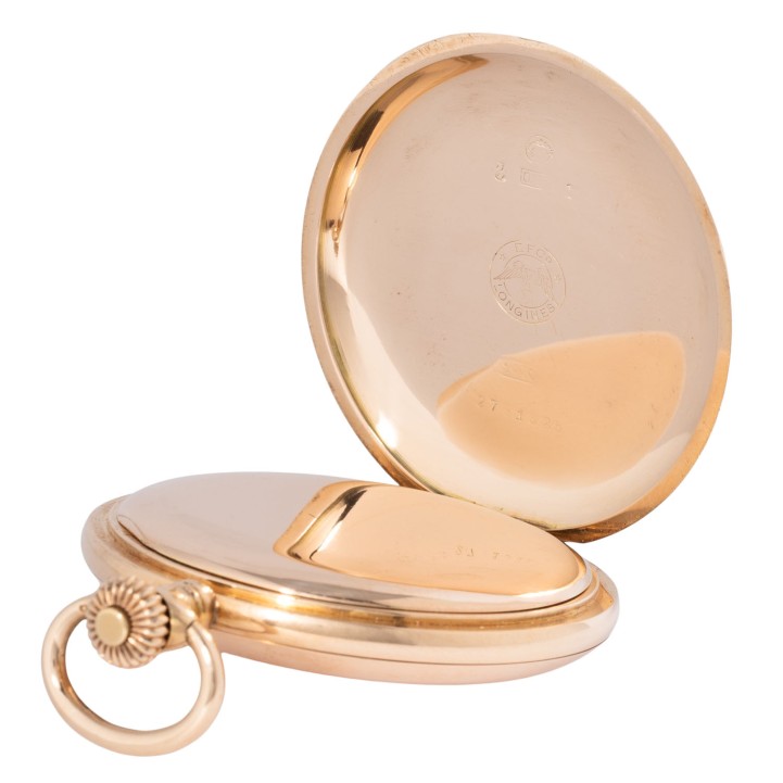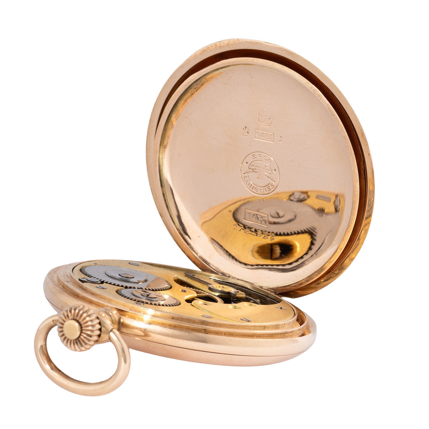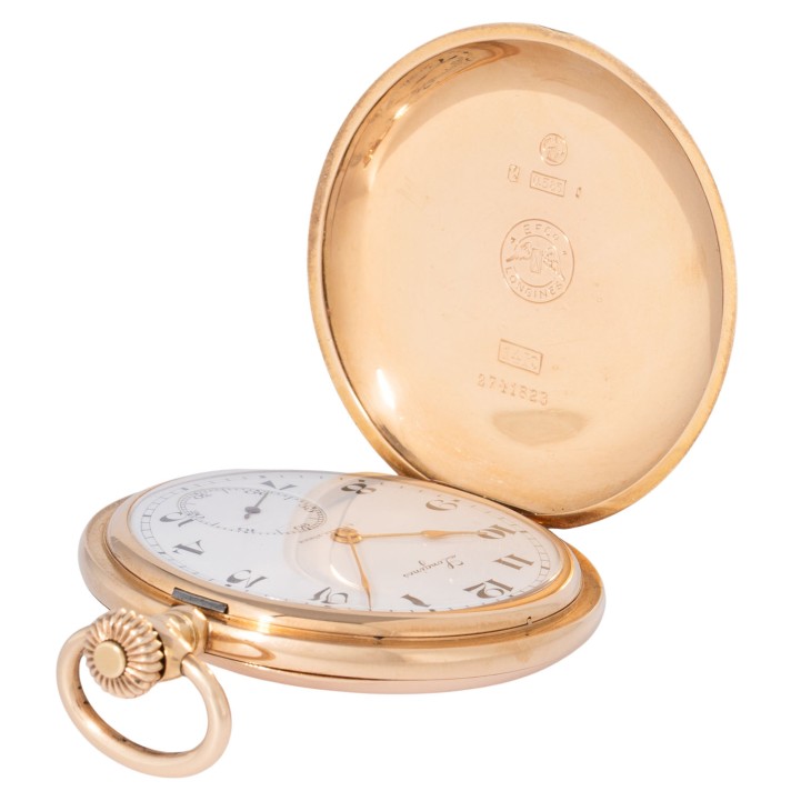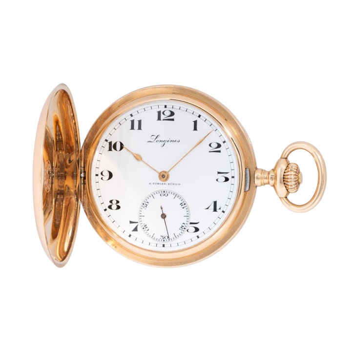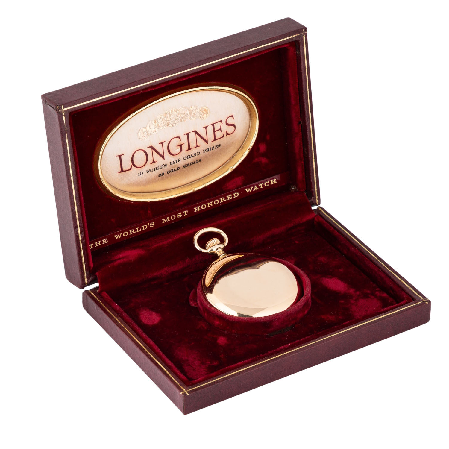 14K Roségold inkl. Staubdeckel, Seriennummer 2741823. Mechanisches Werk mit Kronenaufzug, sign. 'Longines', verschraubten Chatons, Kompensationsunruh und Breguet-Spirale.Gute Gangwerte (+11 s/d, 319° Amplitude). Zweiteiliges, weißes Emaille-Zifferblatt mit doppelter Signatur ('Longines' & 'A. Türler Zürich'), arabische Ziffern, kleiner Sekunde und Eisenbahnminuterie. Guter Zustand, wenige Gebrauchsspuren. Original Aufbewahrungsbox anbei. Durchmesser ca. 50 mm gemessen ohne Krone.