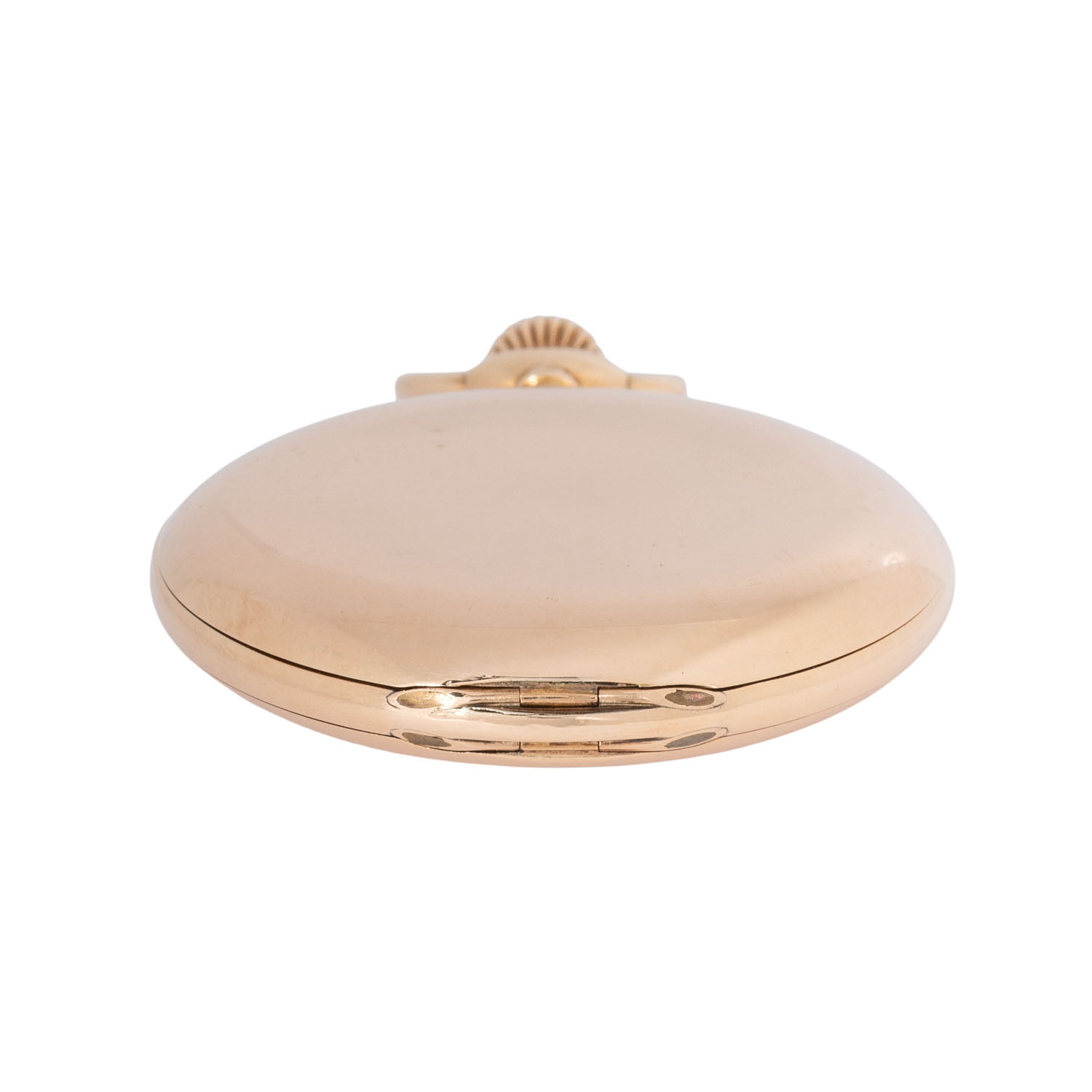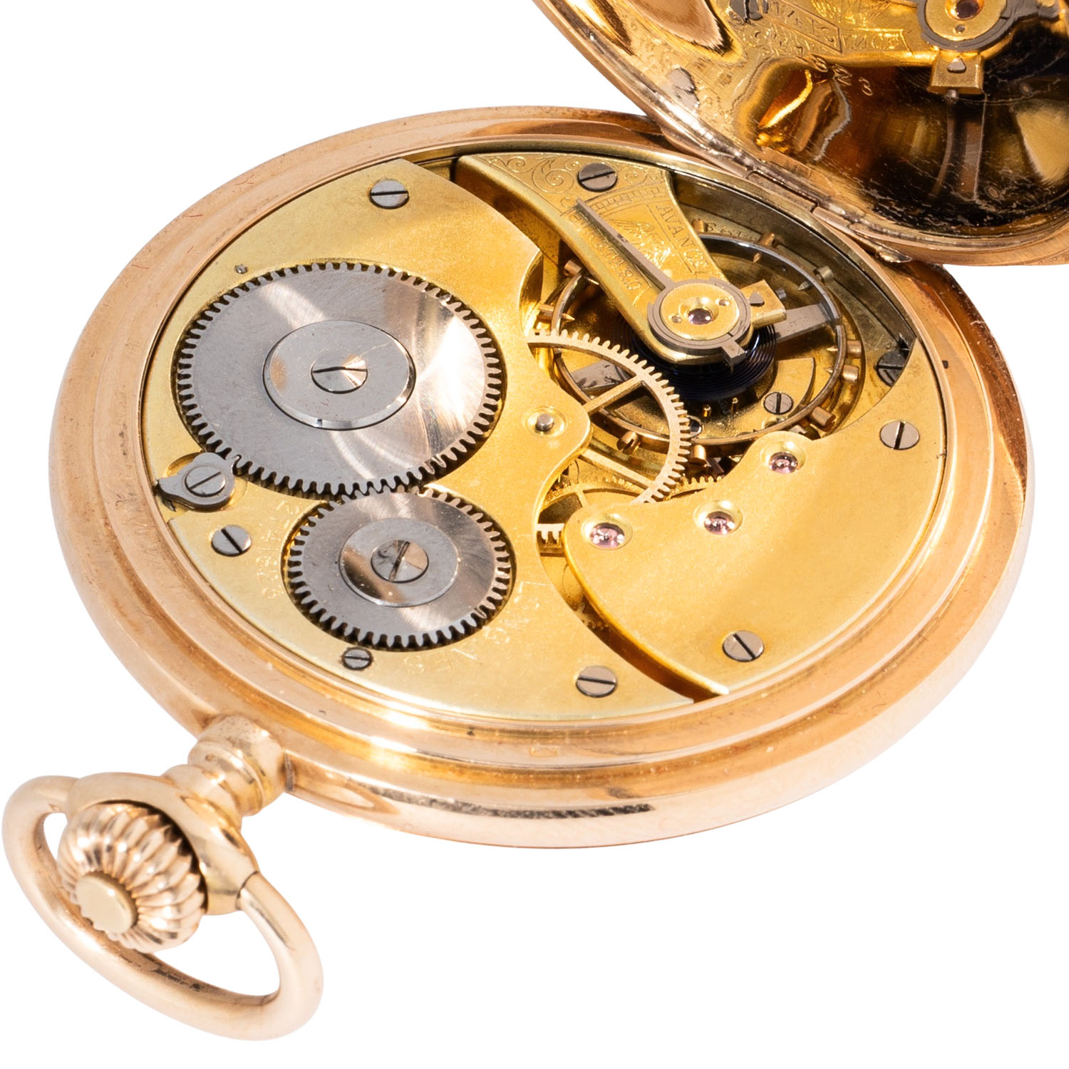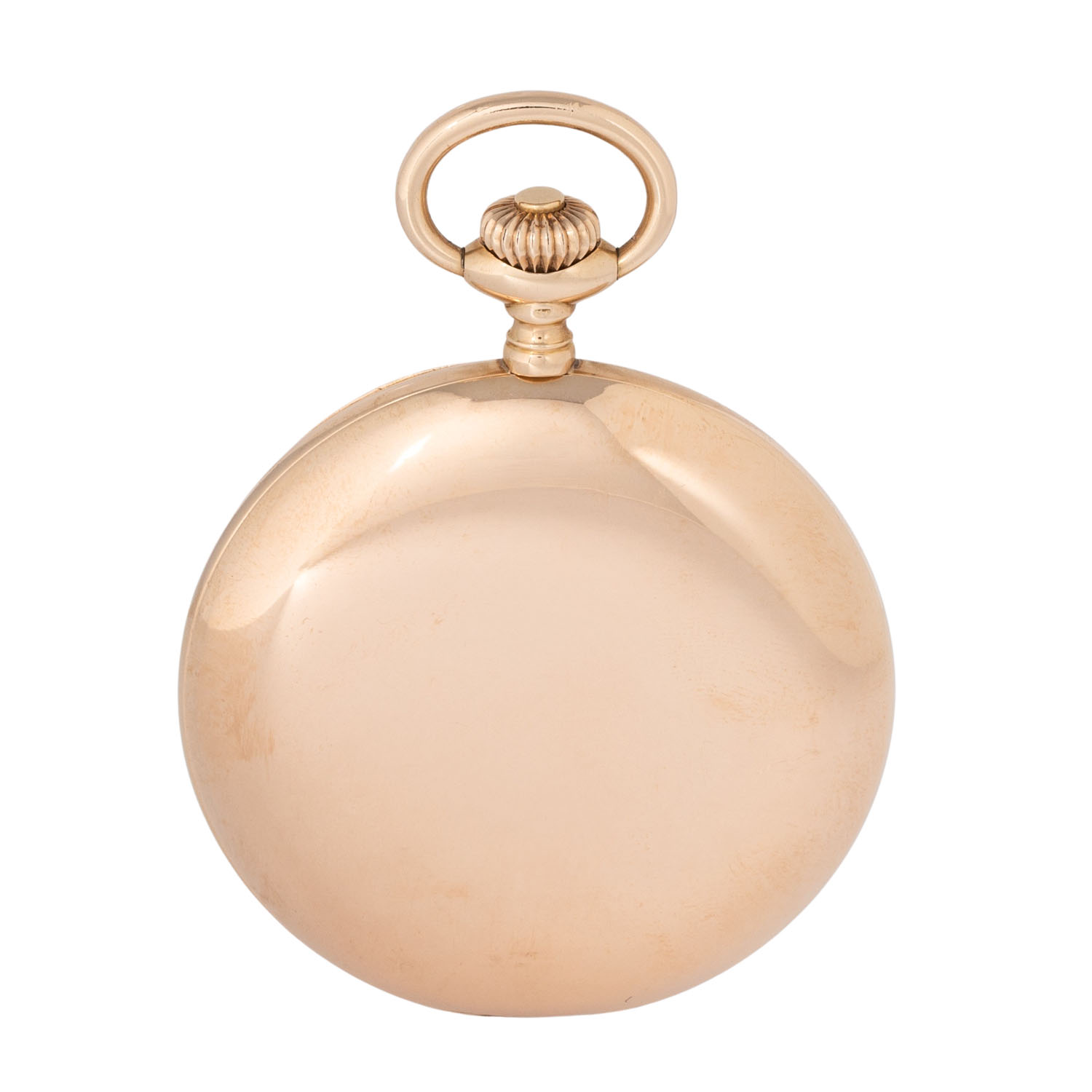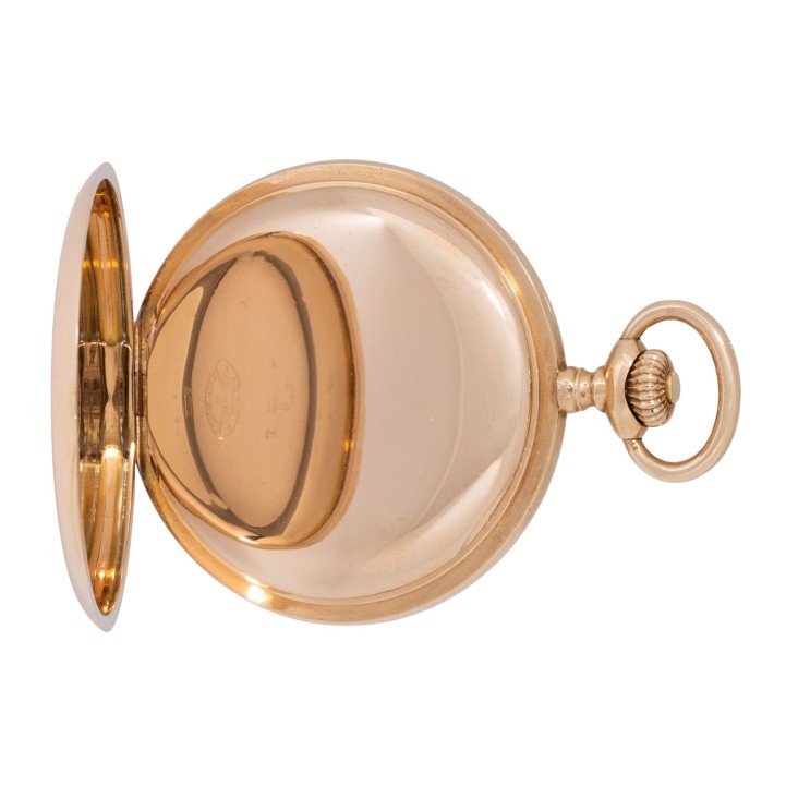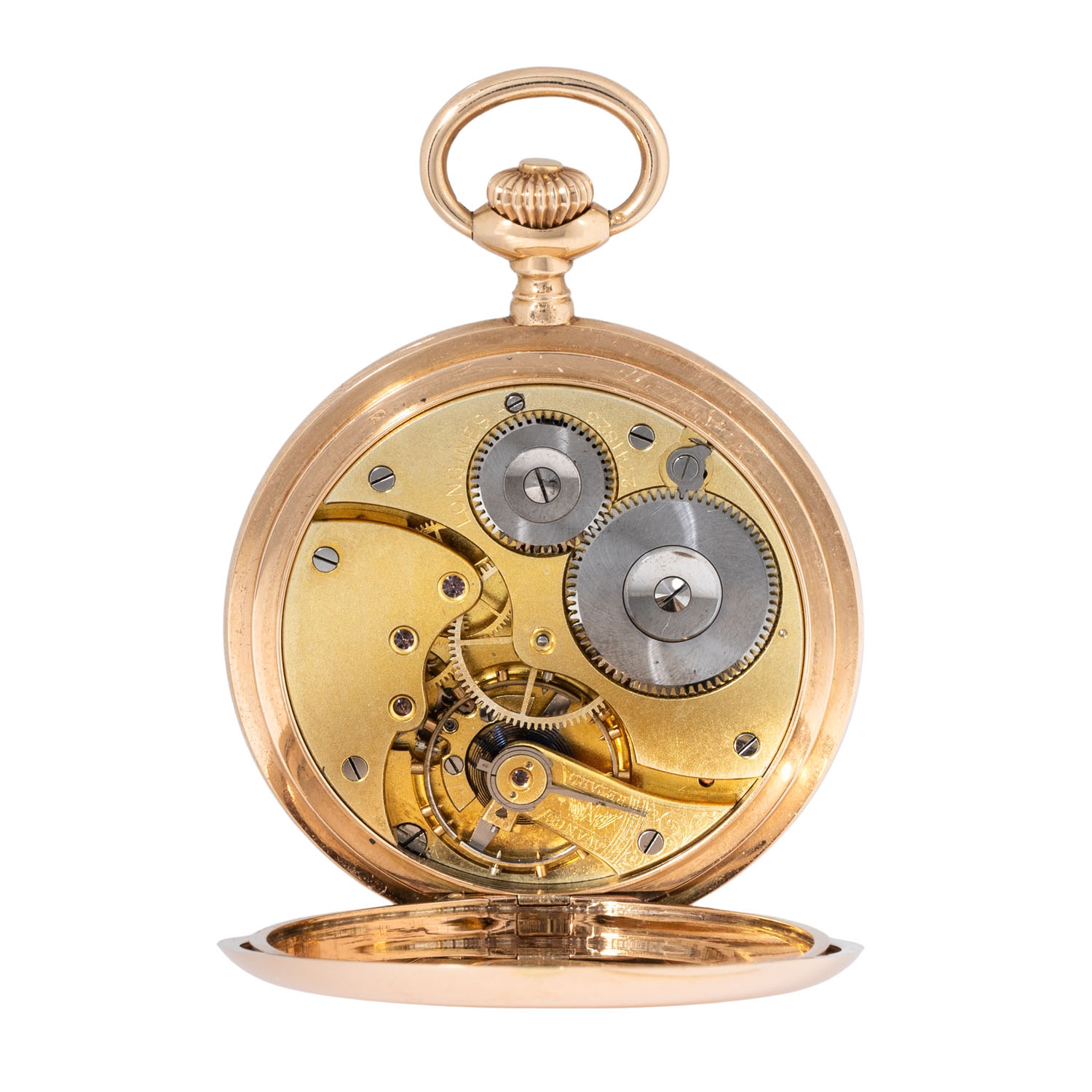 14K Roségold inkl. Staubdeckel, Seriennummer 2741823. Mechanisches Werk mit Kronenaufzug, sign. 'Longines', verschraubten Chatons, Kompensationsunruh und Breguet-Spirale.Gute Gangwerte (+11 s/d, 319° Amplitude). Zweiteiliges, weißes Emaille-Zifferblatt mit doppelter Signatur ('Longines' & 'A. Türler Zürich'), arabische Ziffern, kleiner Sekunde und Eisenbahnminuterie. Guter Zustand, wenige Gebrauchsspuren. Original Aufbewahrungsbox anbei. Durchmesser ca. 50 mm gemessen ohne Krone.