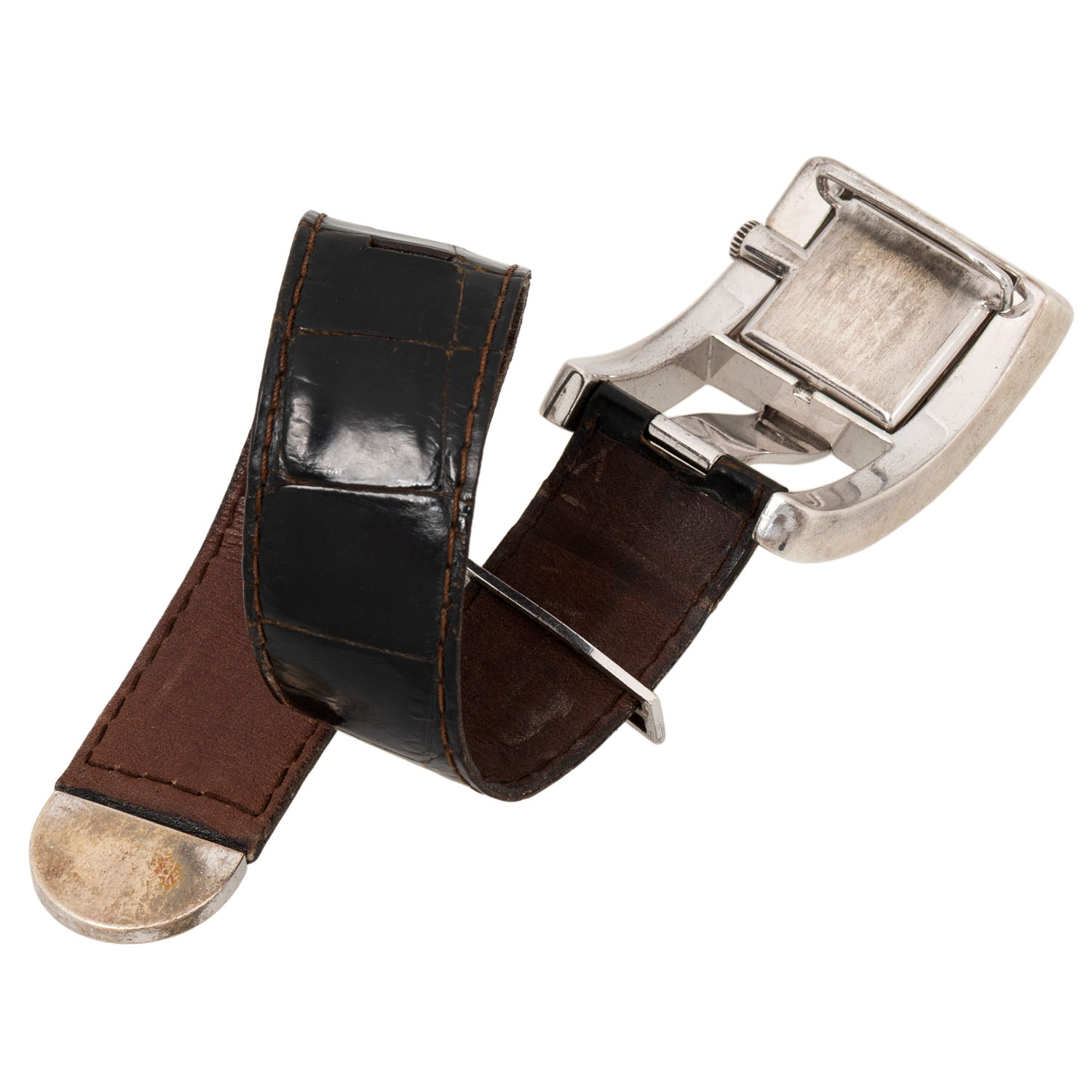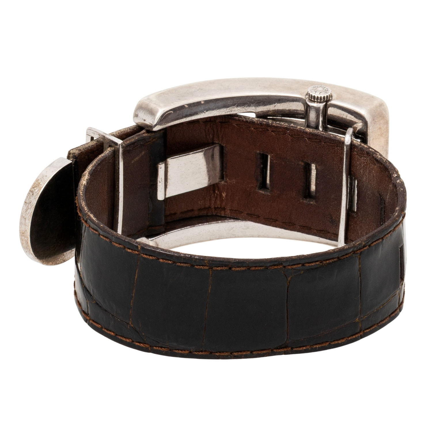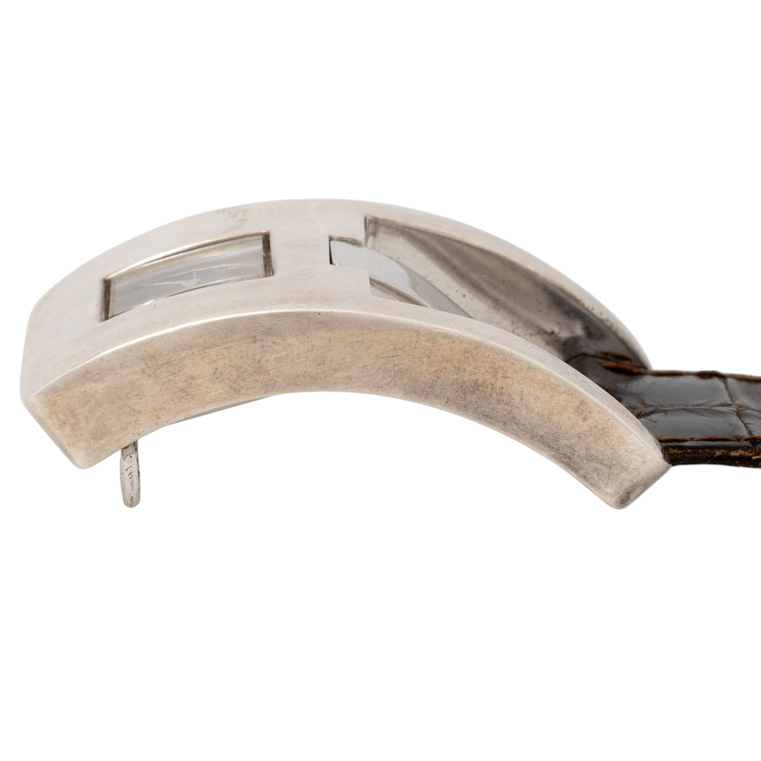 Silber 925, Gehäuse mit integrierter Bandschließe. Mechanisches Werk mit Handaufzug in funktionsfähigem Zustand (-13 s/d, 263° Amplitude). Verspiegeltes Fadenkreuzzifferblatt mit silbernen Zeigern. Dunkelbraunes Lederarmband mit stärkeren Gebrauchsspuren. Gebraucht mit Tragespuren am Gehäuse und der Schileße. Durchmesser ca. 34 mm gemessen ohne Krone.