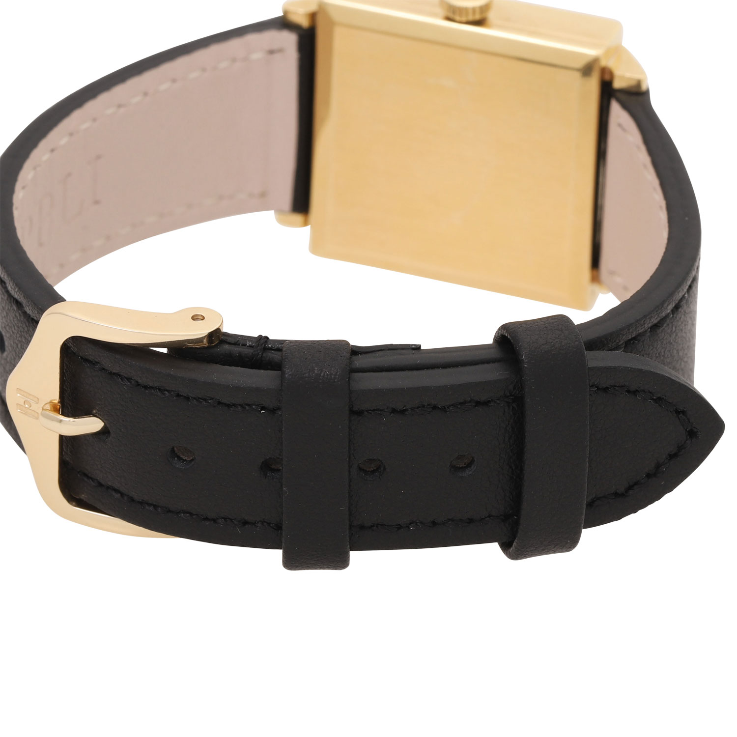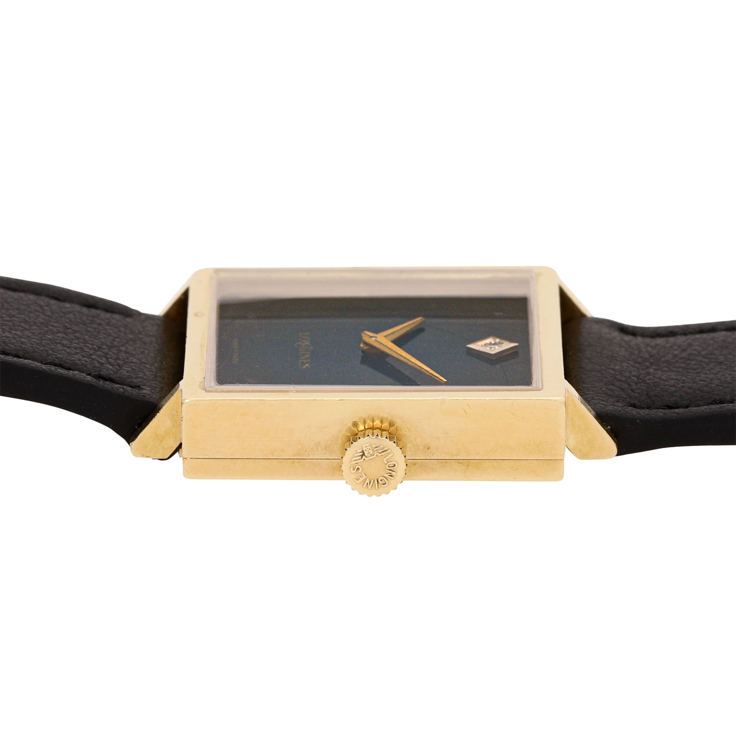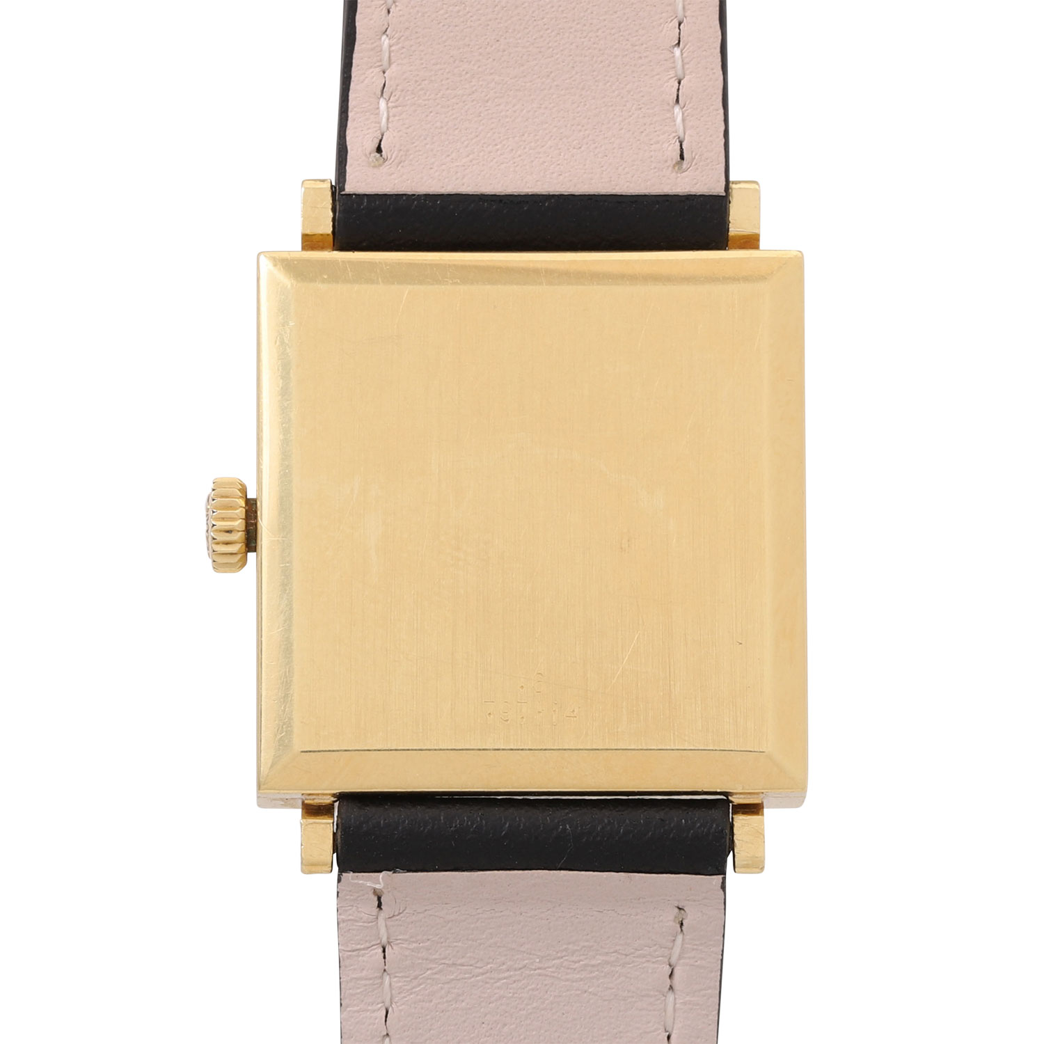 Gold 18K. Handaufzugswerk in funktionsfähigem Zustand. Zifferblatt mit rissen im Lack. Neues Lederband mit Dornschließe. Gebrauchter Zustand.Tragespuren am Gehäuse. Original Etui, zusätzliches Lederband und Papiere anbei. Erstkauf 04/1975. Durchmesser ca. 25mm, Höhe ca. 32mm. Passend bis zu ca. 18,5cm Handgelenkumfang.