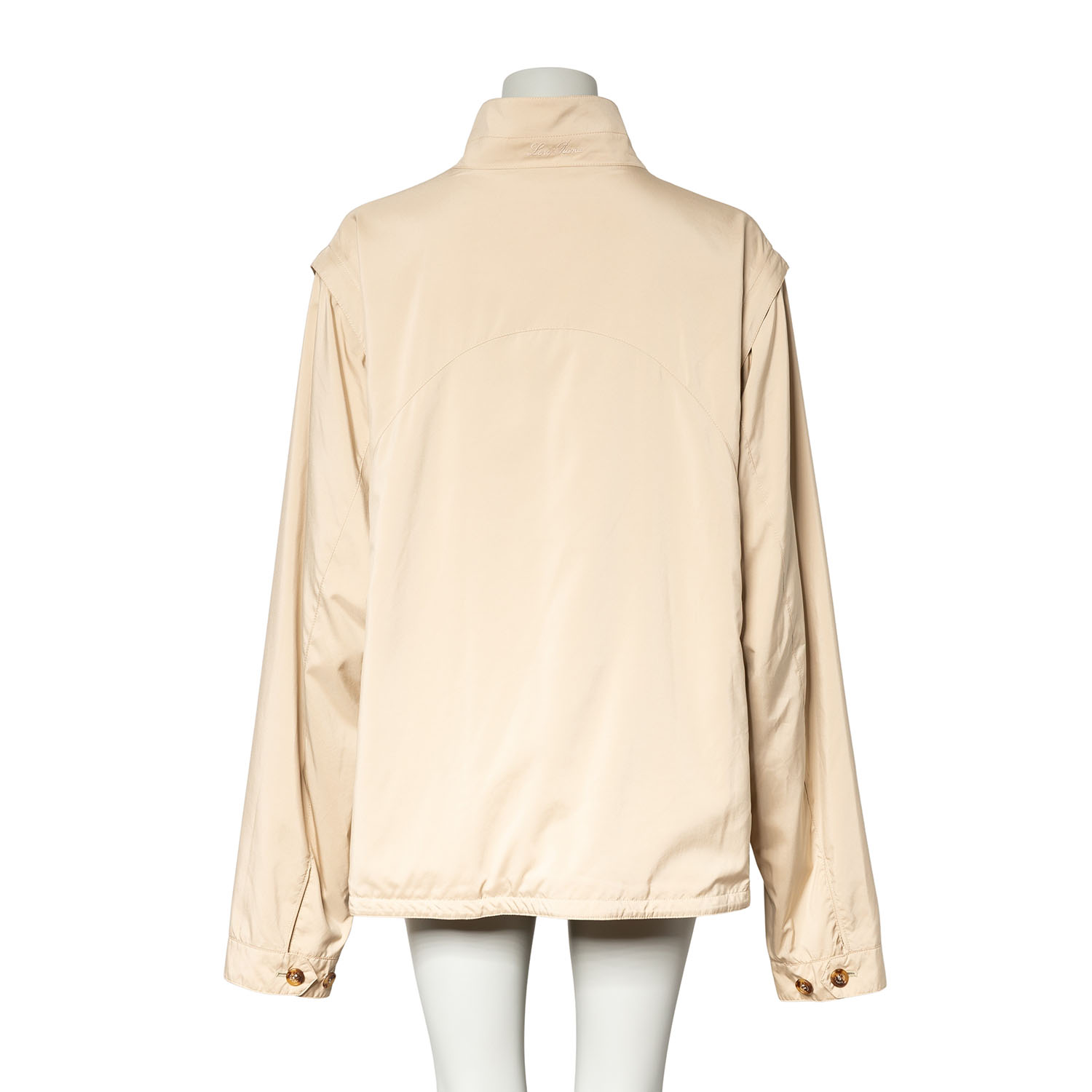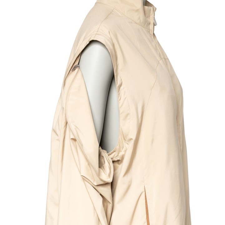 Beiges Modell mit Reißverschluss, Taschen, Stehkragen und abnehmbaren Ärmeln. Tragespuren vorhanden.