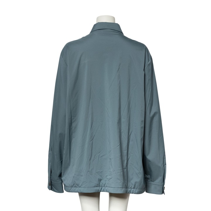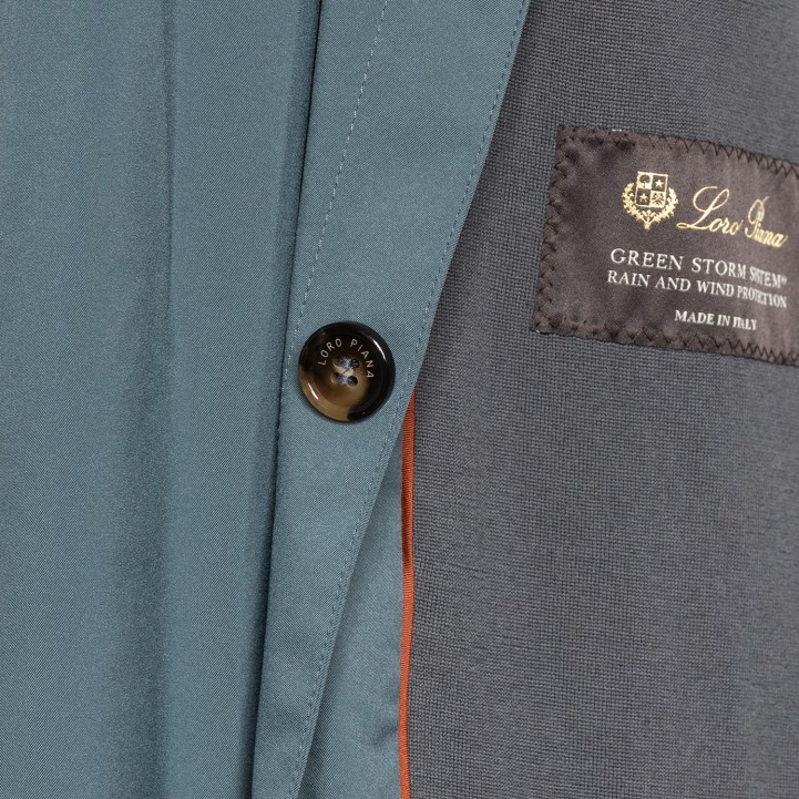 Blaues Modell mit Knopfverschluss, Taschen und Umlegekragen. Graues Jerseyfutter mit zwei Reißverschlusstaschen. Tragespuren vorhanden.