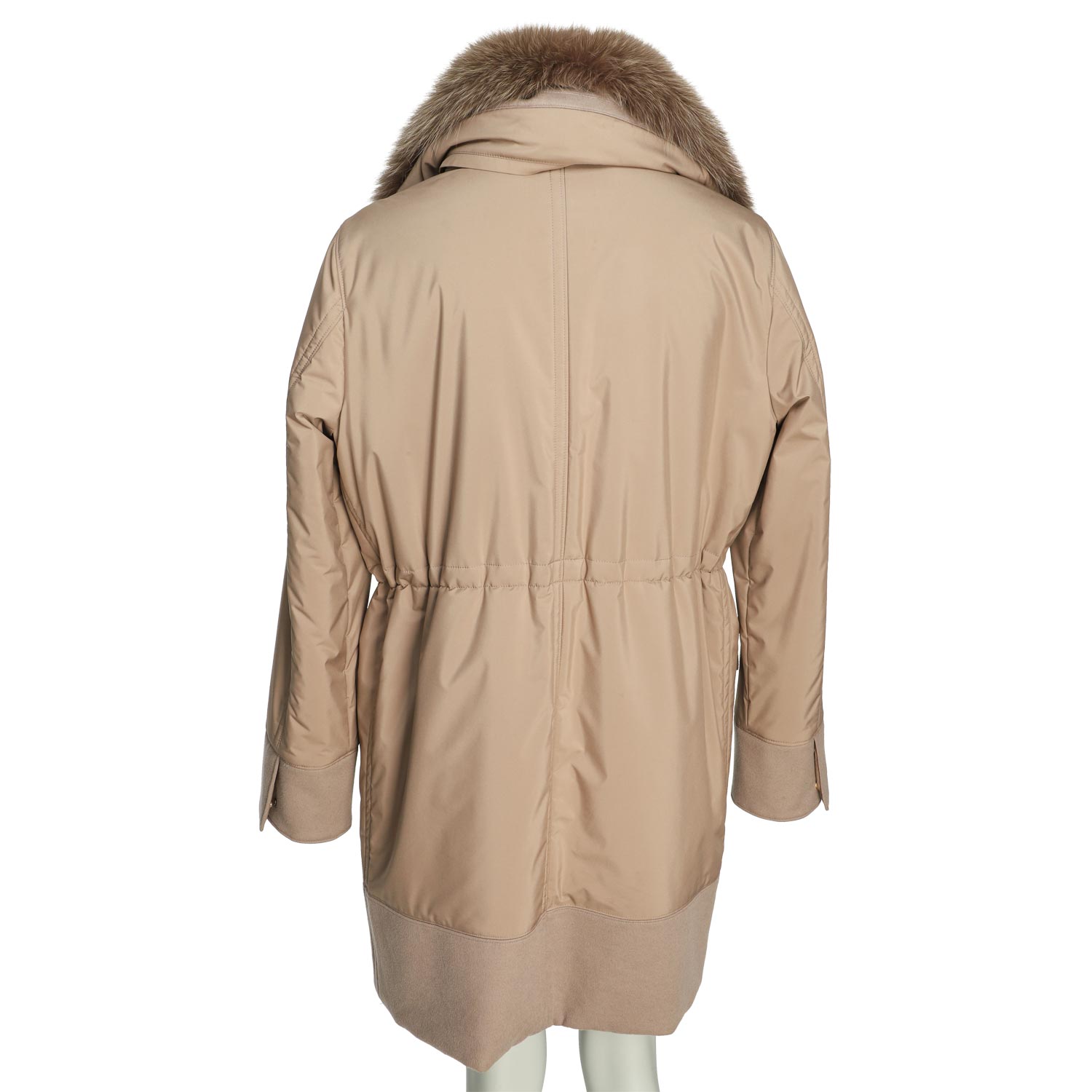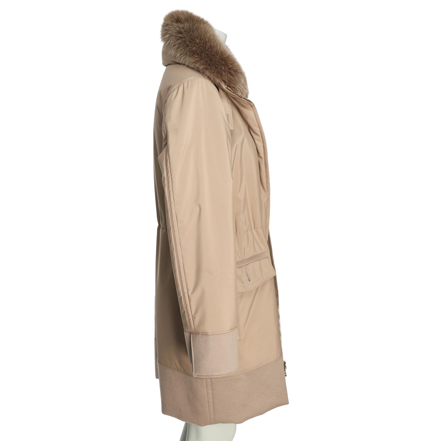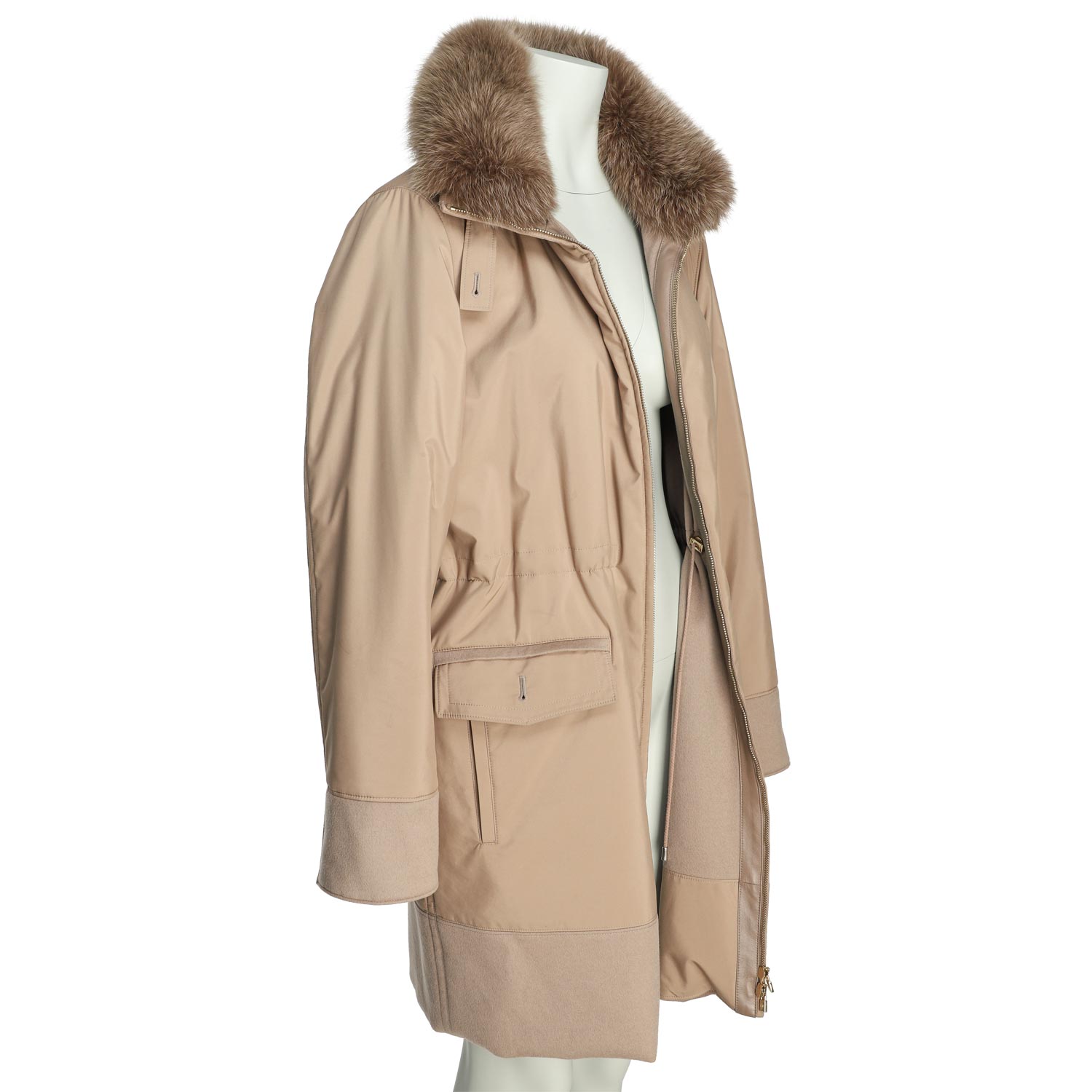 Taupefarbenes Modell mit Details aus Schurwolle und Kaschmir, Pattentaschen, Reißverschluss, goldfarbene Hardware, Raffung an der Taille und abnehmbarem Fuchsbesatz. Guter Erhalt.