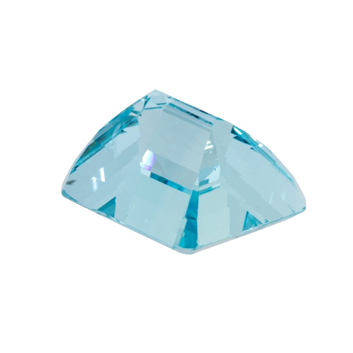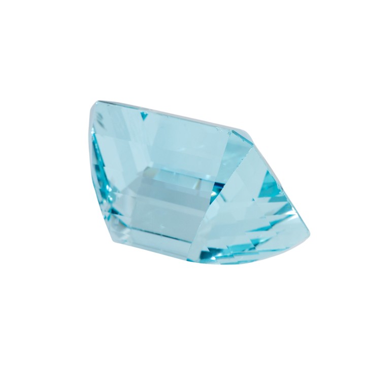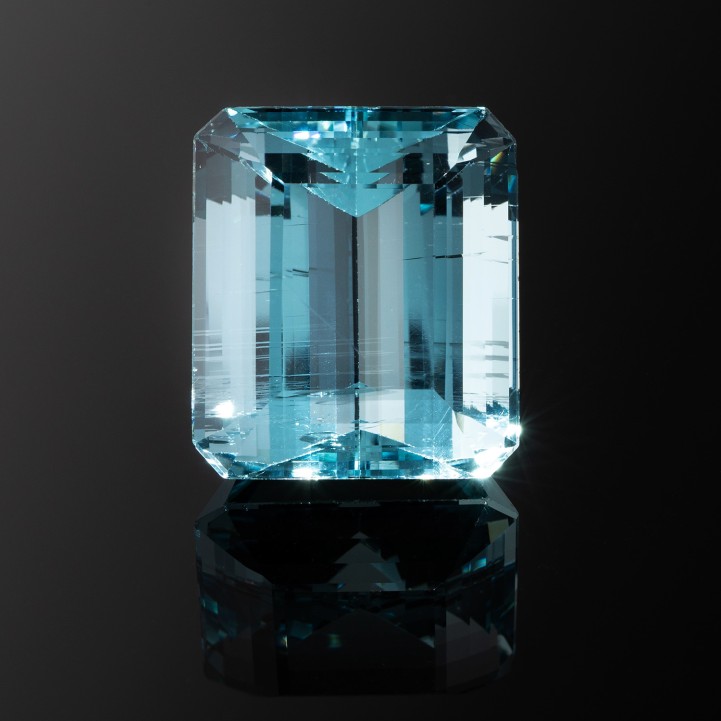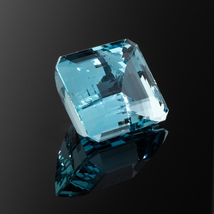 im Smaragdschliff, ca 30,8 x 26,9 x 19,5 mm, schöne Farbe und hohe Transparenz, sehr guter Schliff und Politur, kleinere Bestoßungen und Naturals an Facettenkanten. Je nach Betrachtungswinkel ist eine parallele, spiegelnde Streifung durch Spannungsrisschen sichtbar, die diesem Aquamarin einen einzigartigen Charakter verleihen.