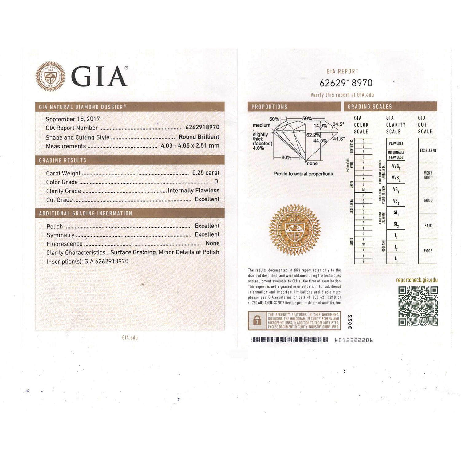 Proportionen: sehr gut, Symmetrie: sehr gut, Schliff: sehr gut, Fluoreszenz: keine, GIA-Zertifikat 6262918970 vom 09/2017 inklusive.