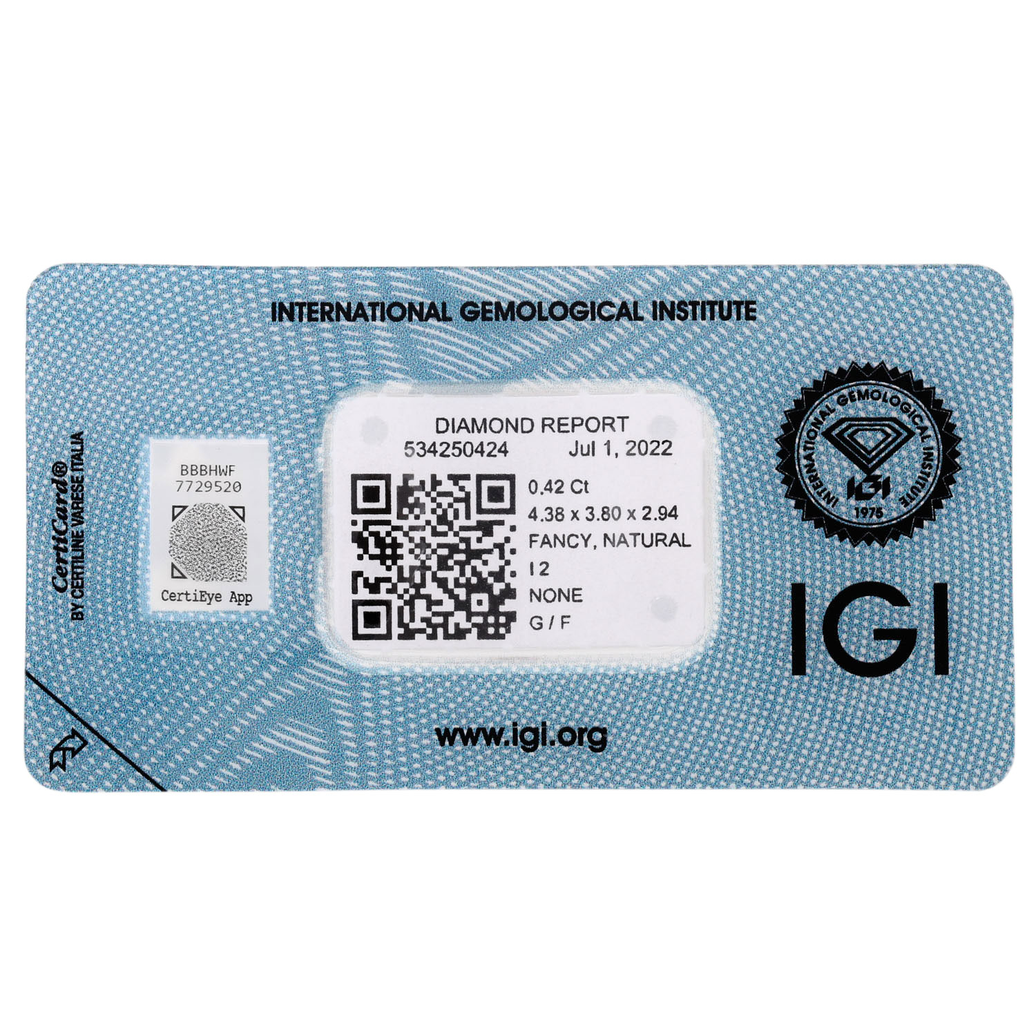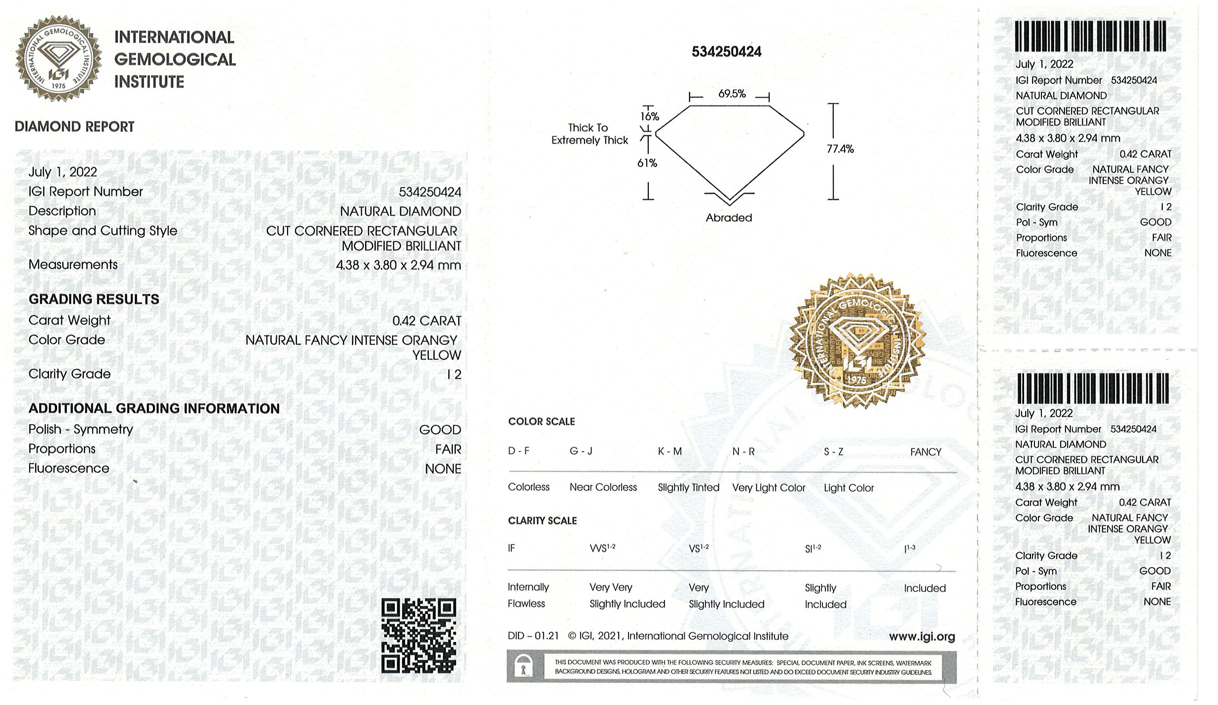 (Natural Fancy Intense Orangy Yellow), Achteck-Schliff, WBW: ca. 2.200 €, im Blister, inkl. IGI Zertifikat (2022).