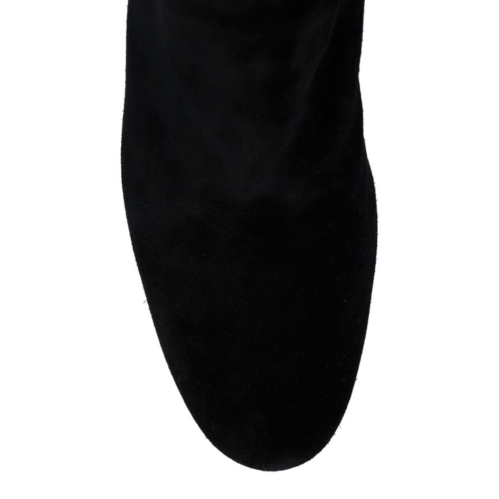 Schwarzes Modell aus Veloursleder mit silberfarbener Hardware, Reißverschluss mit dekorativem Zipper und 6,5 cm Blockabsatz. Ungetragen.